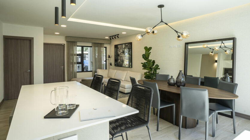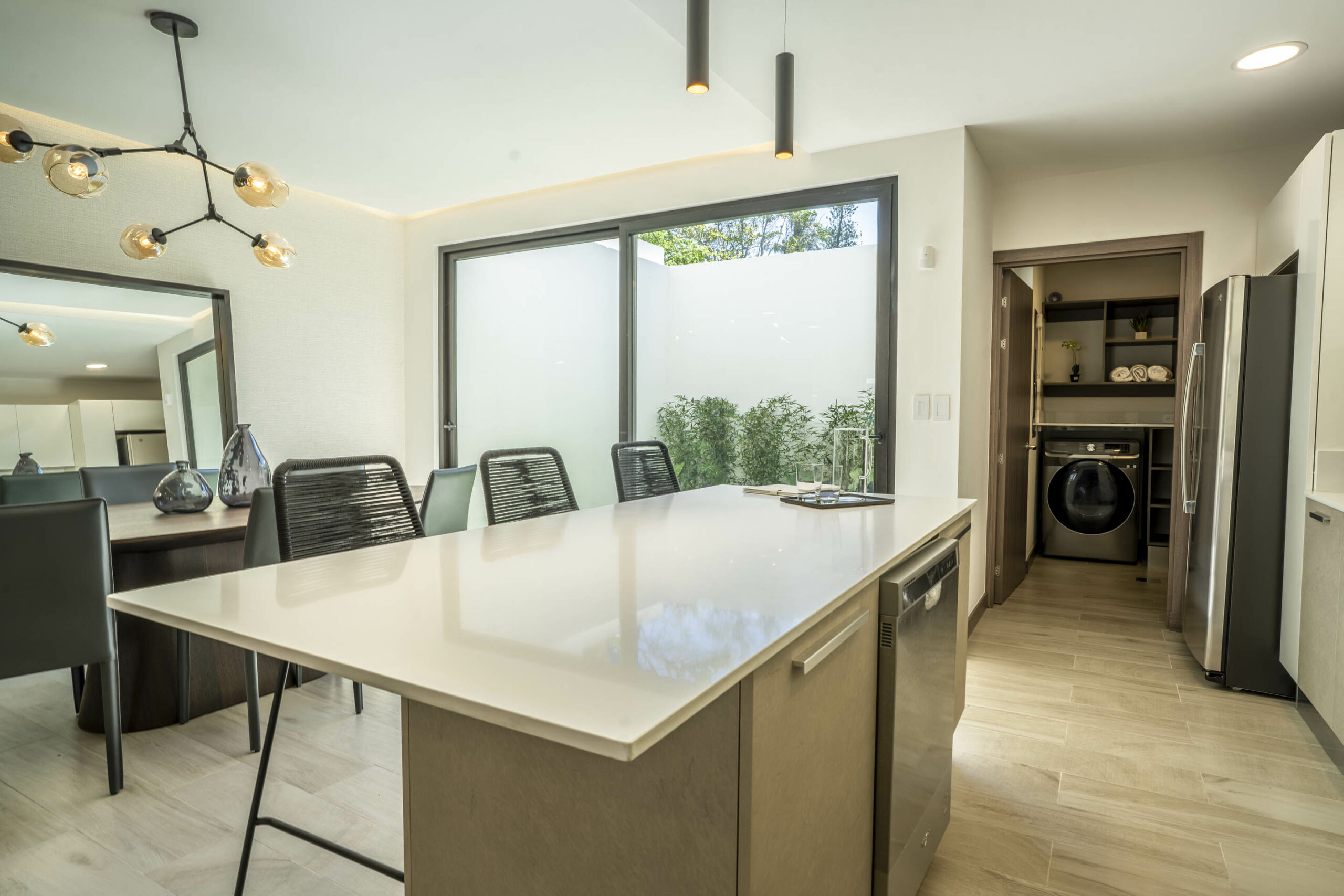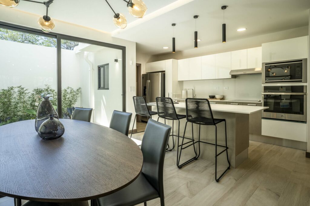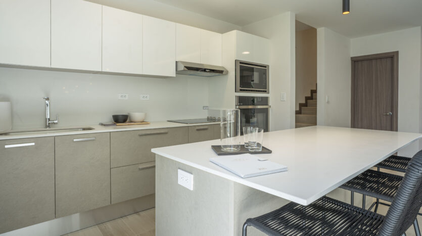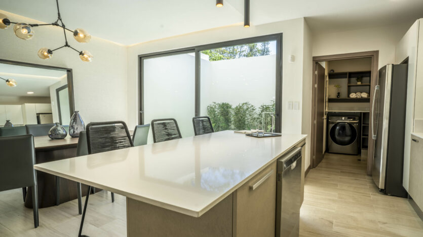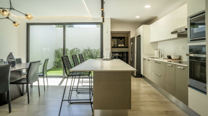 Su espectacular cocina luce sobres de cuarzo y diseño italiano, destacando su amplia y cómoda isla de desayunador.