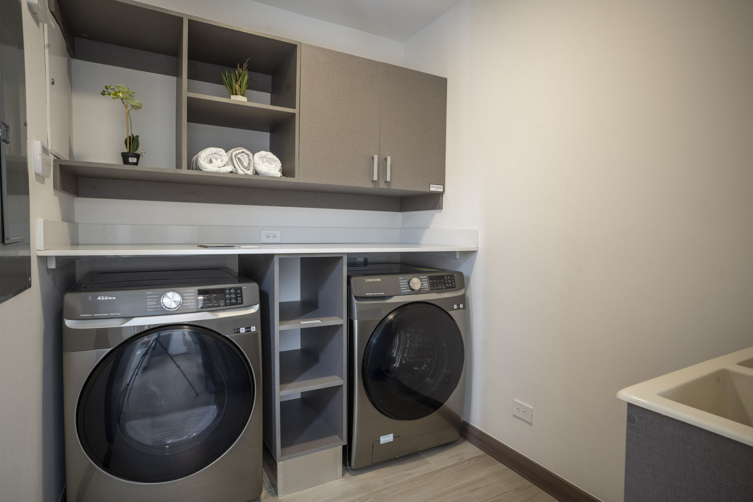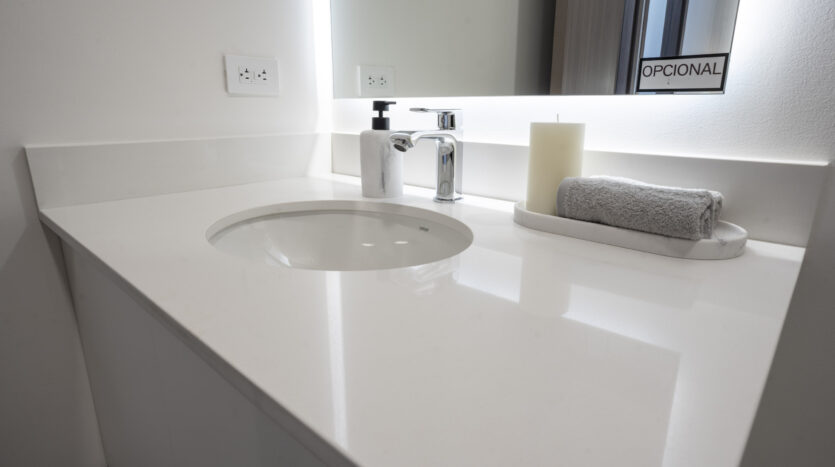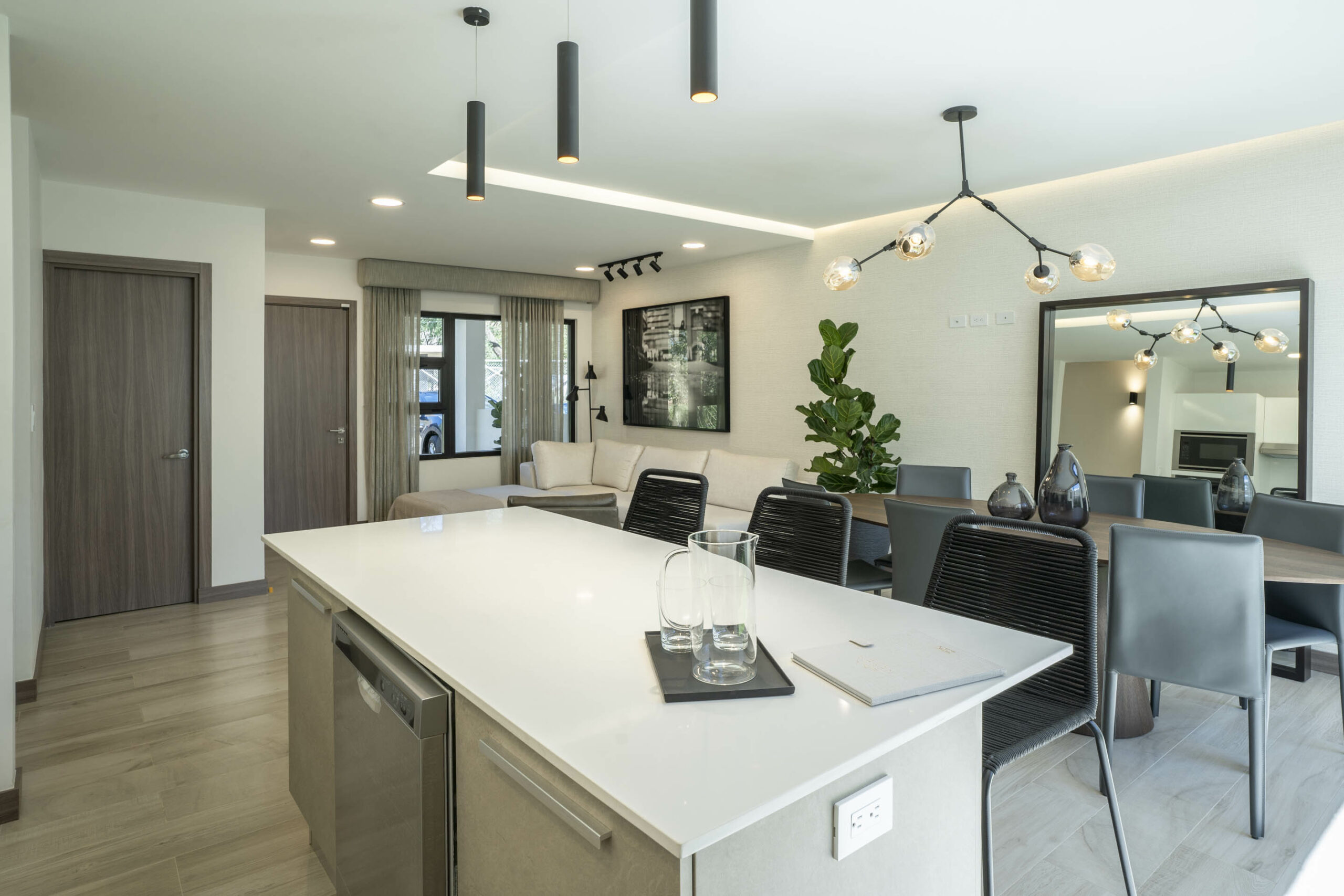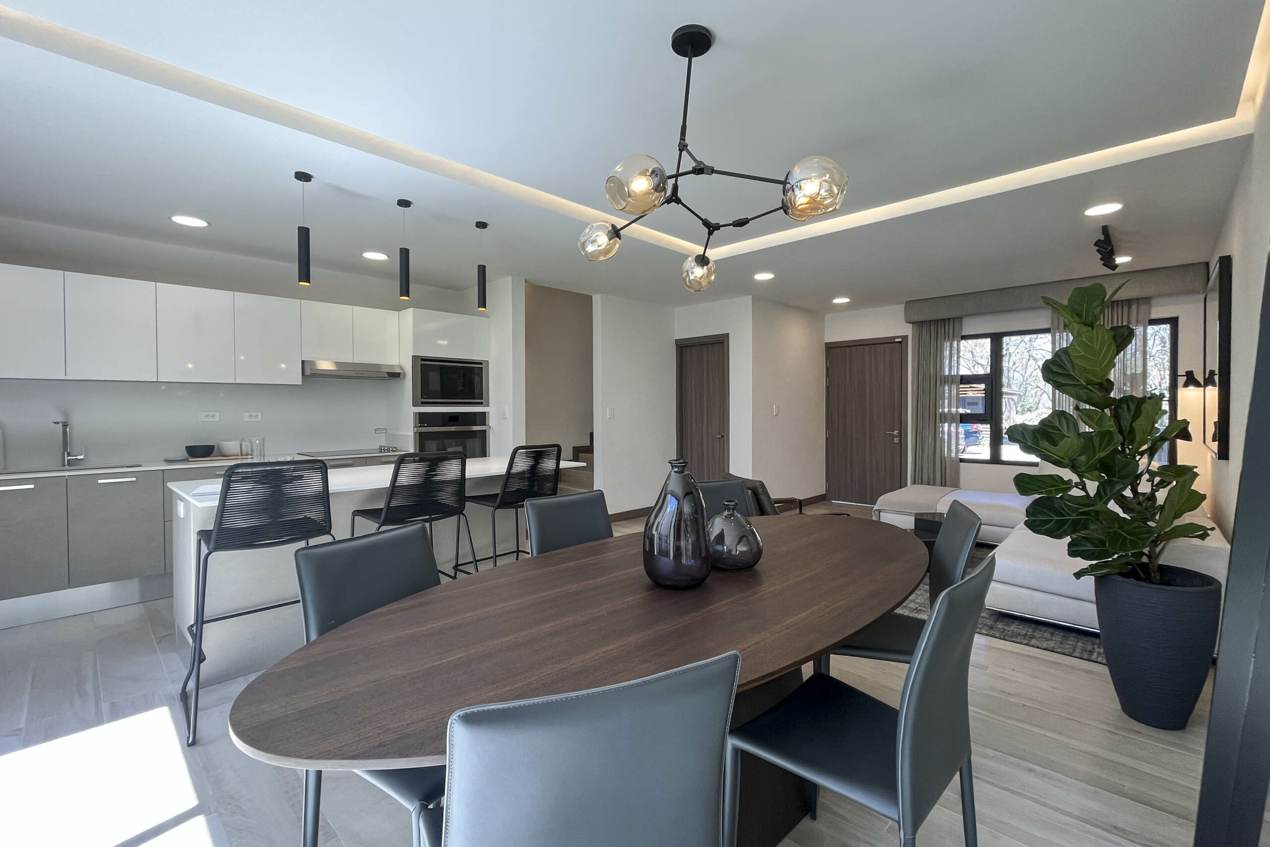 Su espectacular cocina luce sobres de cuarzo y diseño italiano, destacando su amplia y cómoda isla de desayunador.