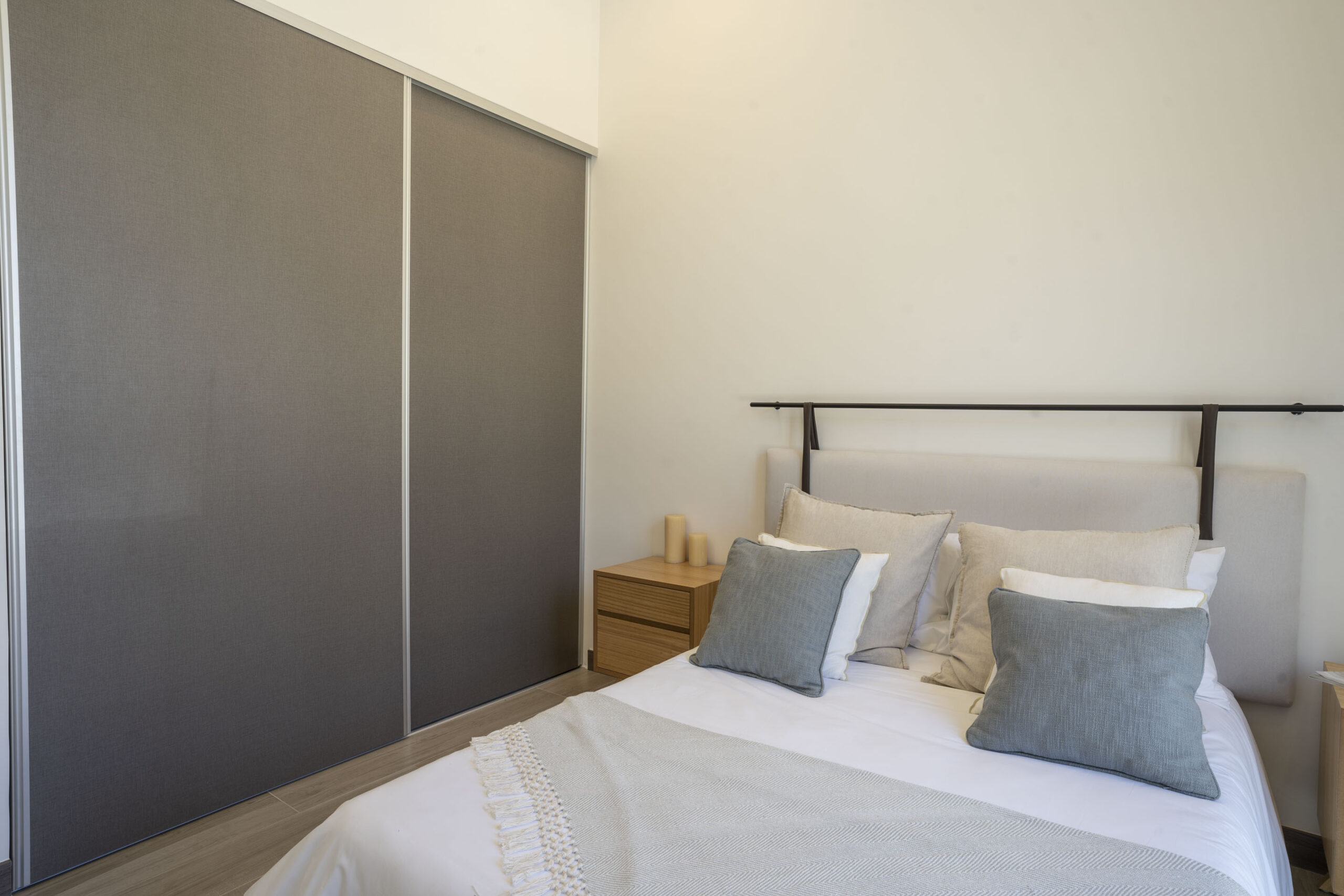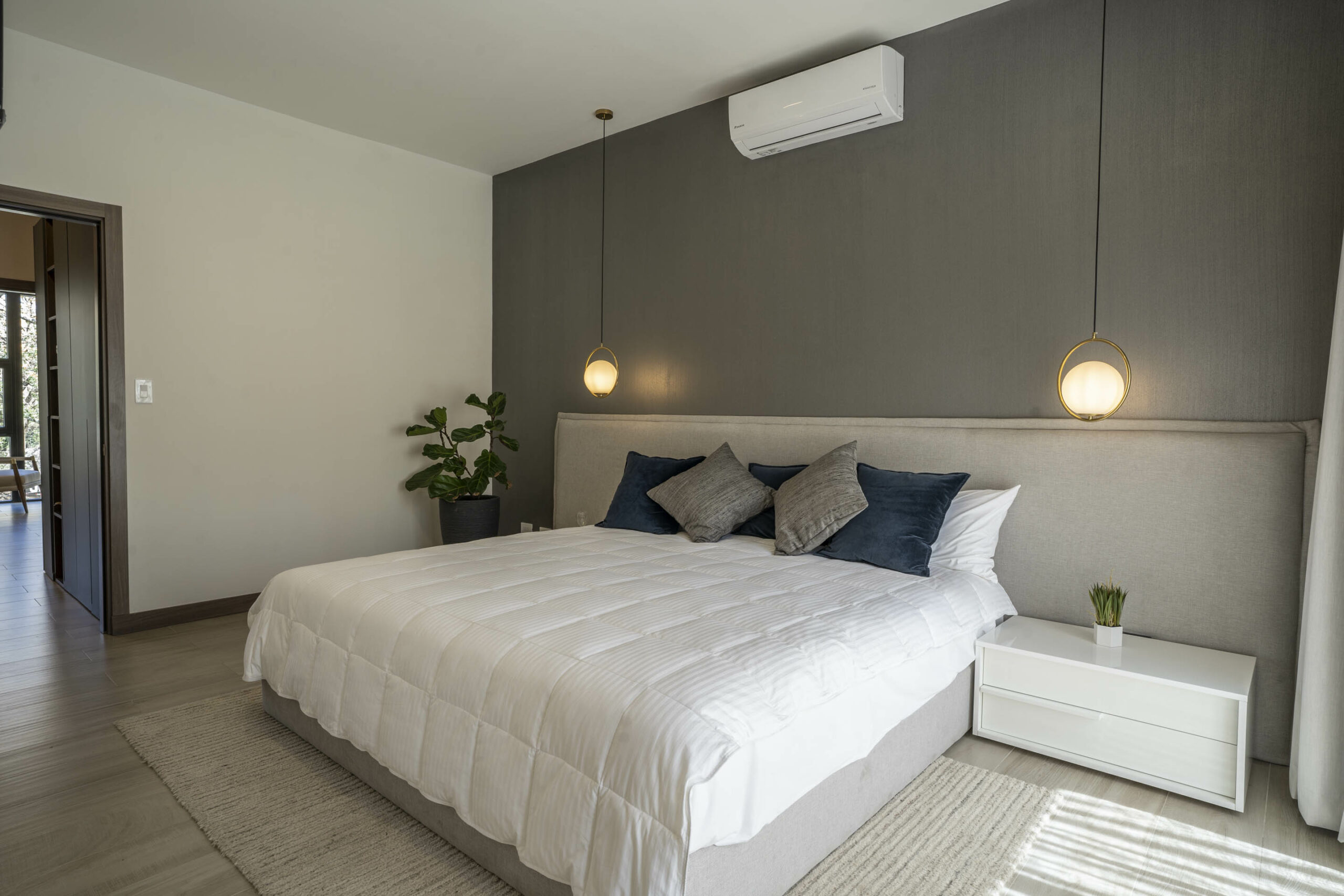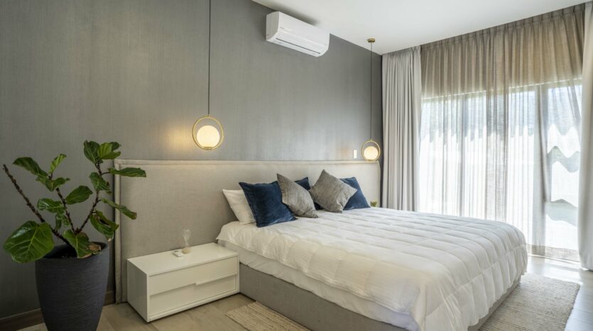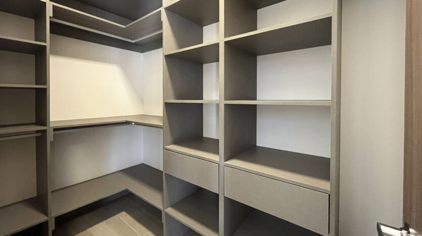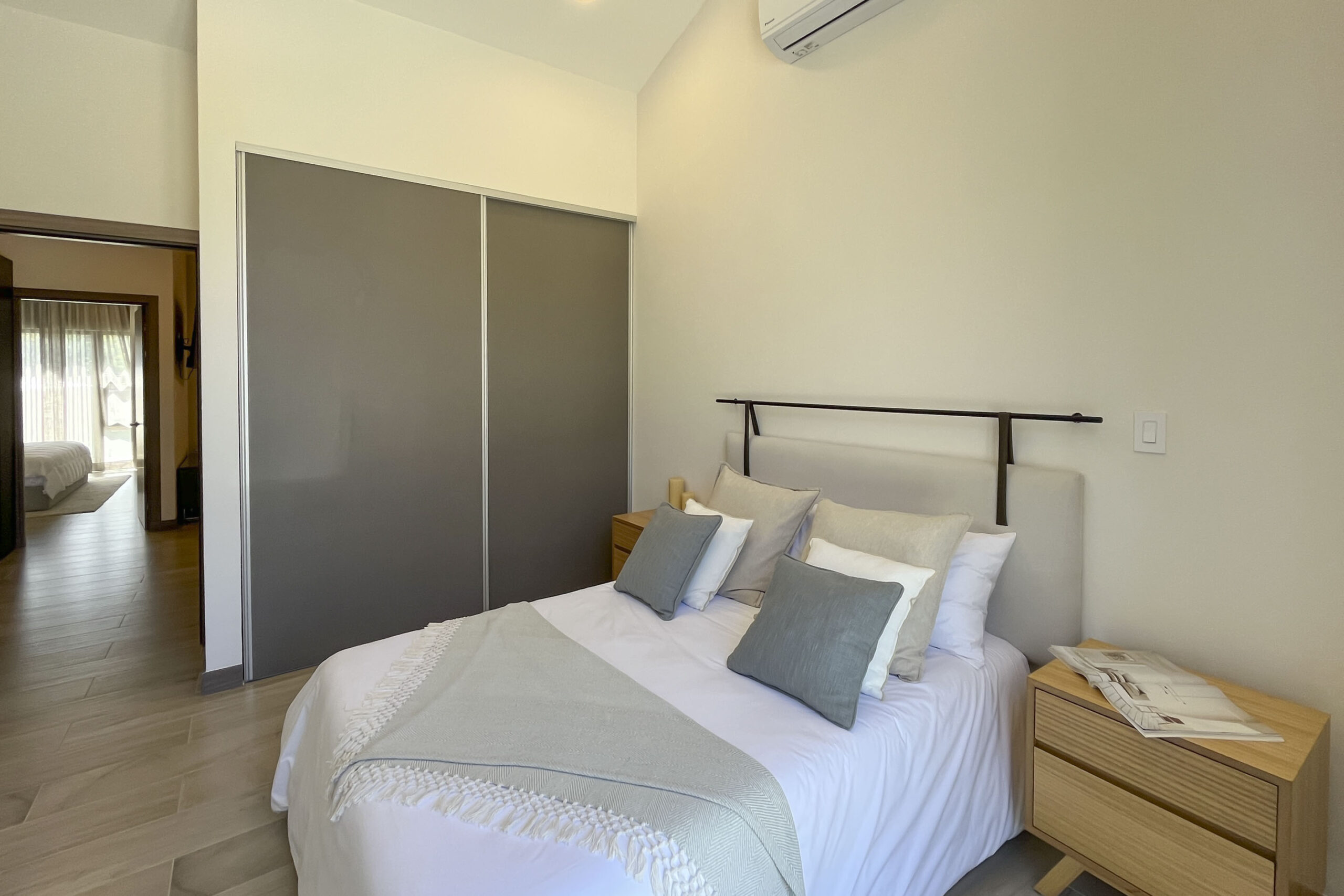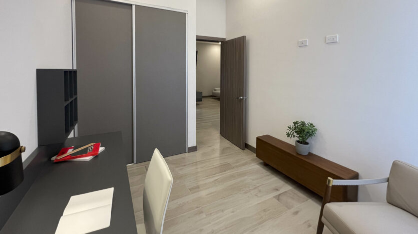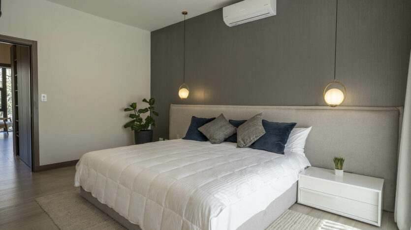 Dispone de 2 habitaciones secundarias compartiendo un baño completo, mientras la habitación principal cuenta con baño privado y walk in closet, en esta habitación destaca su espacio, apto para cama king, muebles de noche y muebles de t.v.