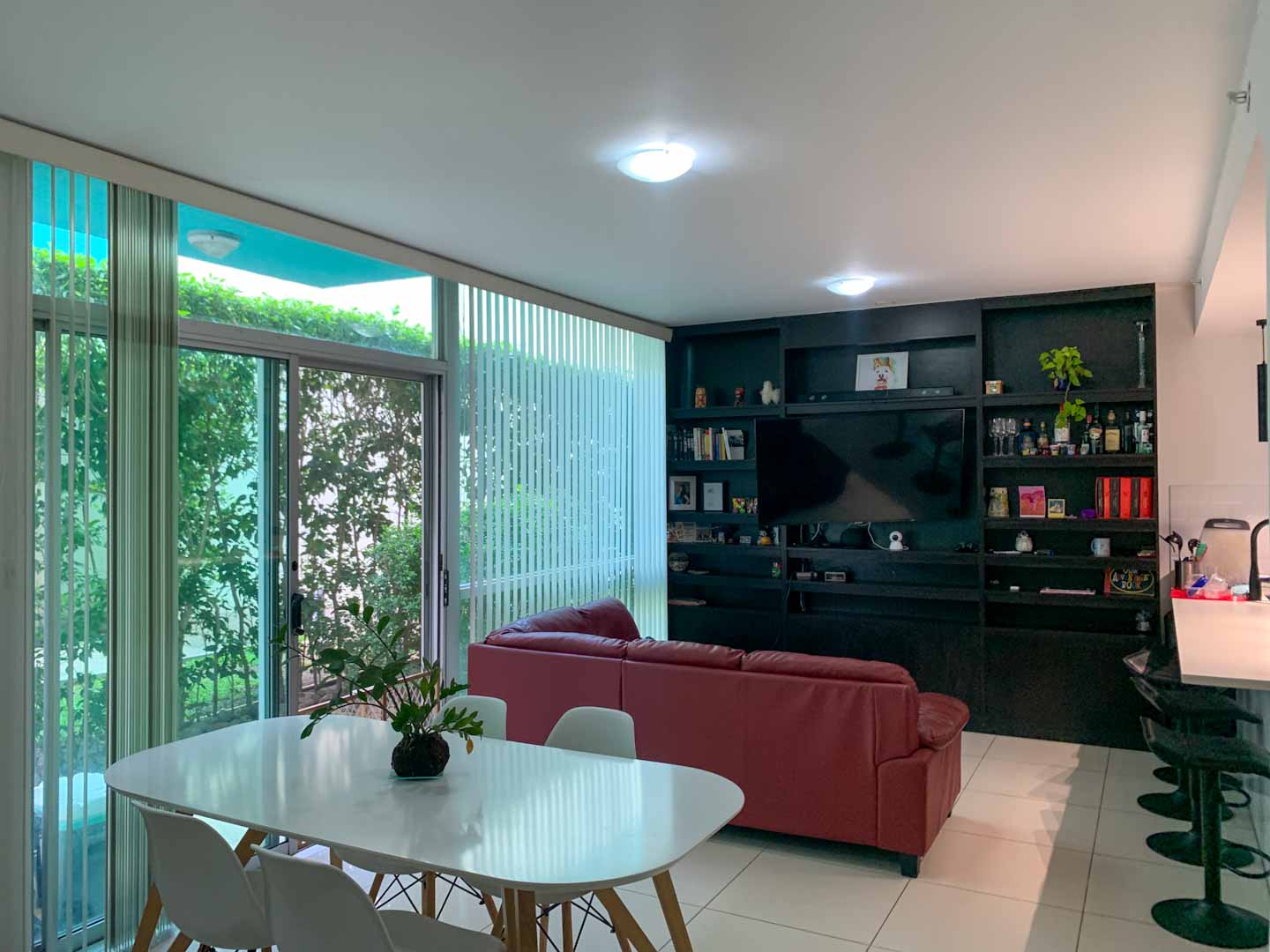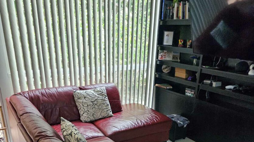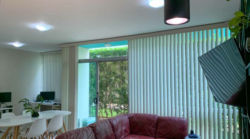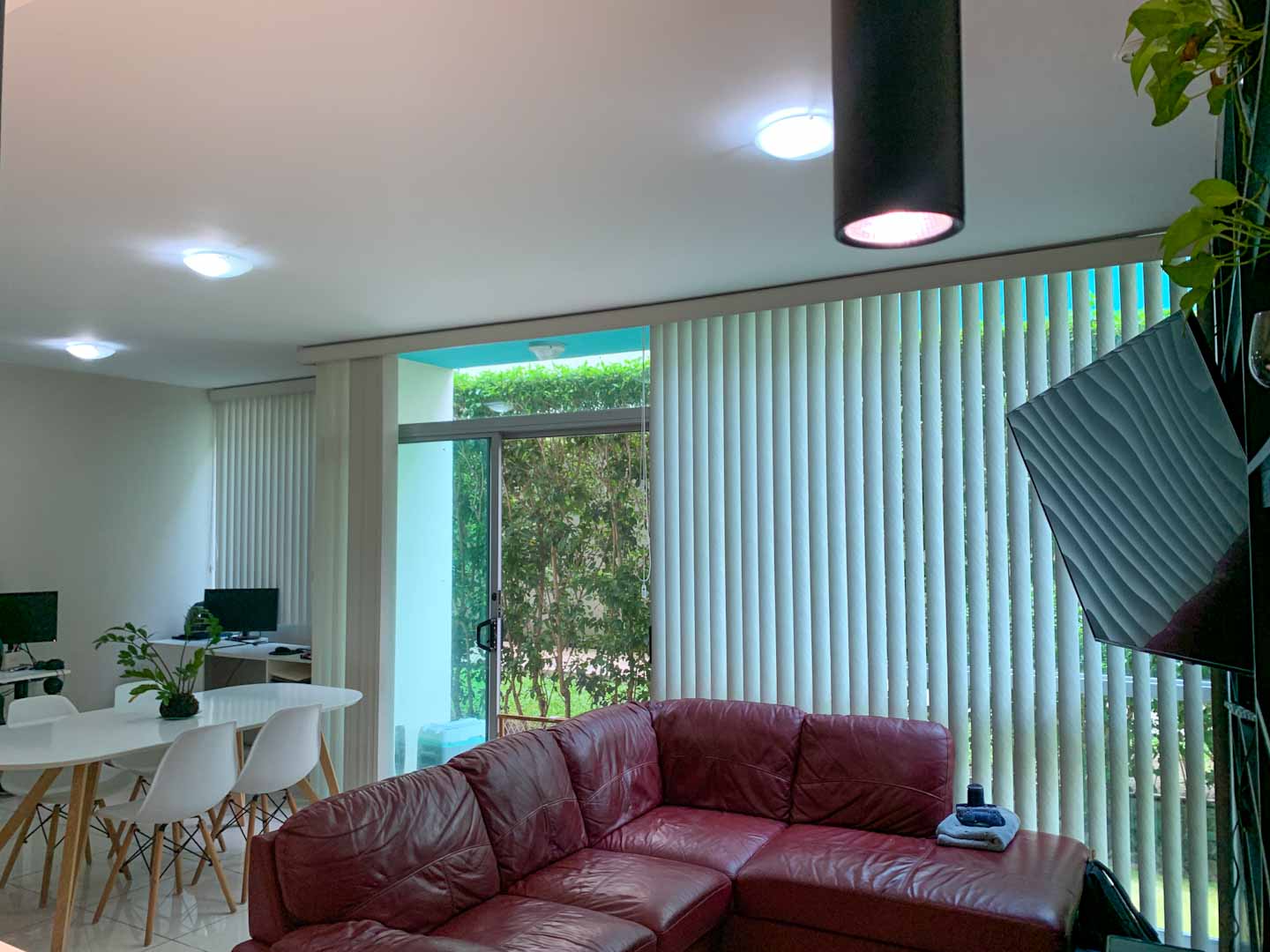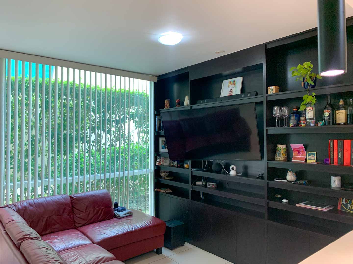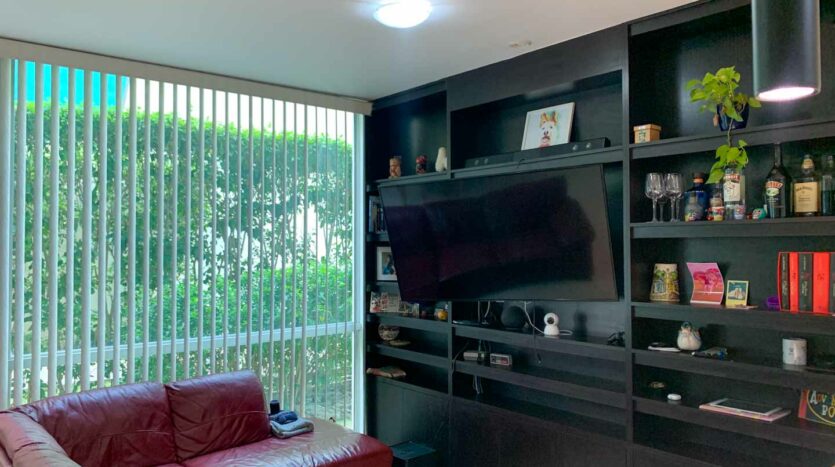 - Persianas en toda la casa y mueble de madera integrado para televisor.