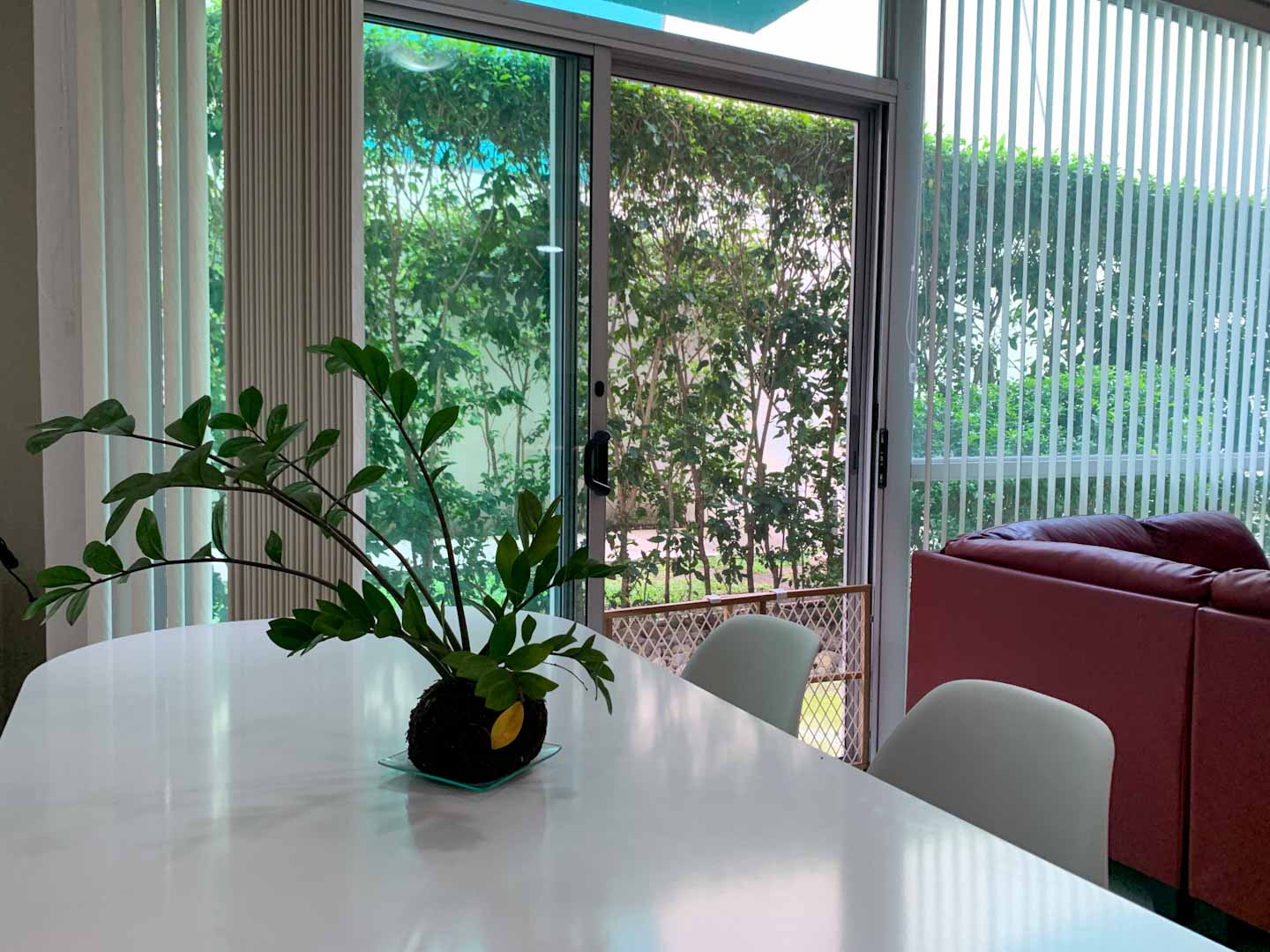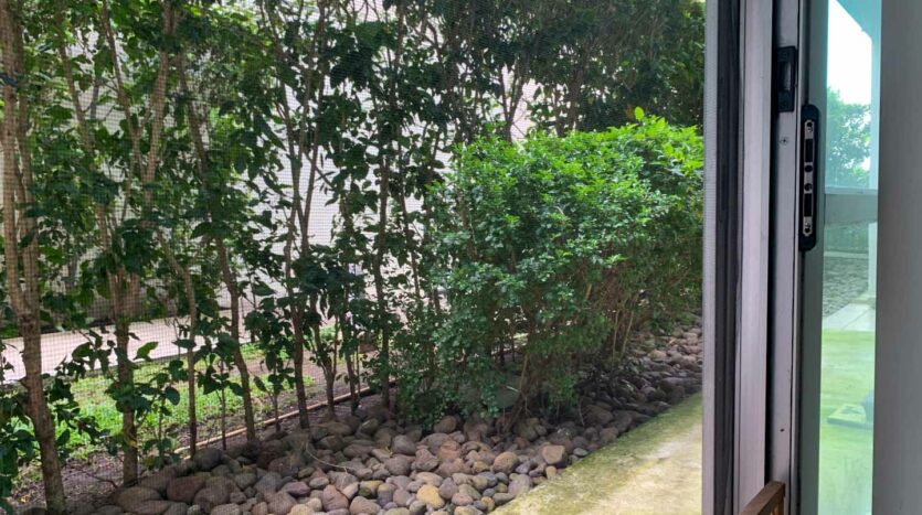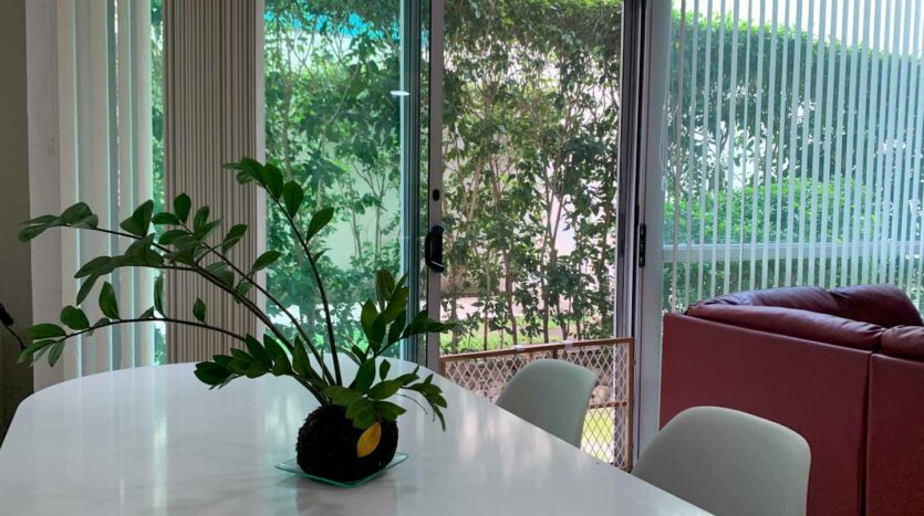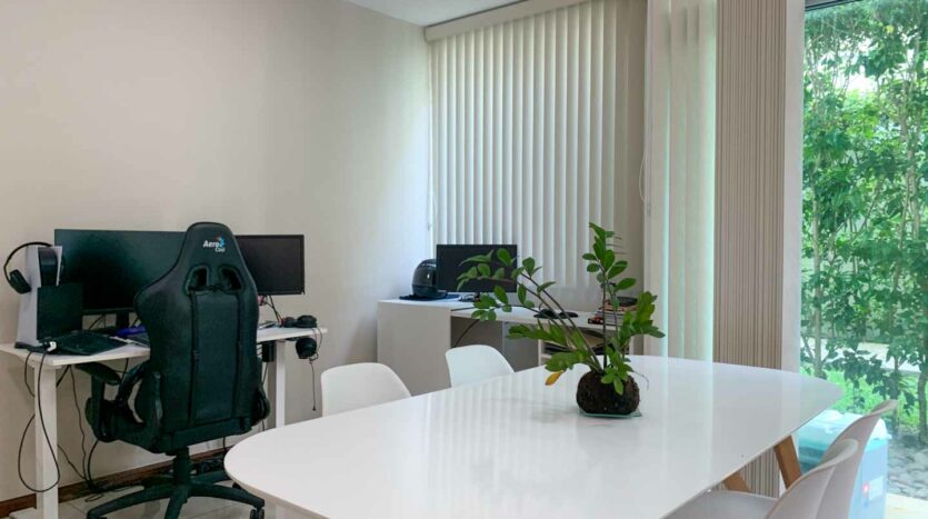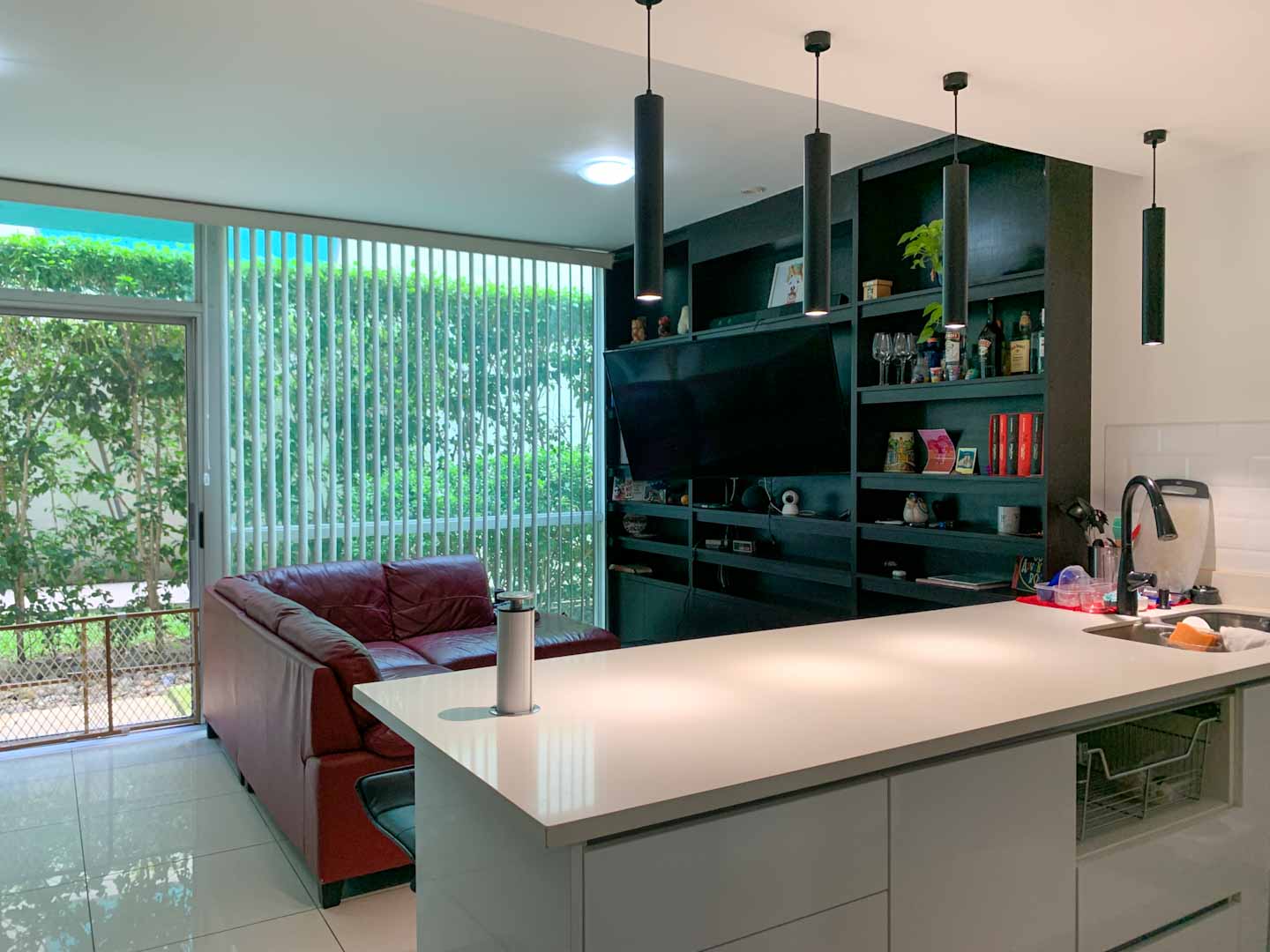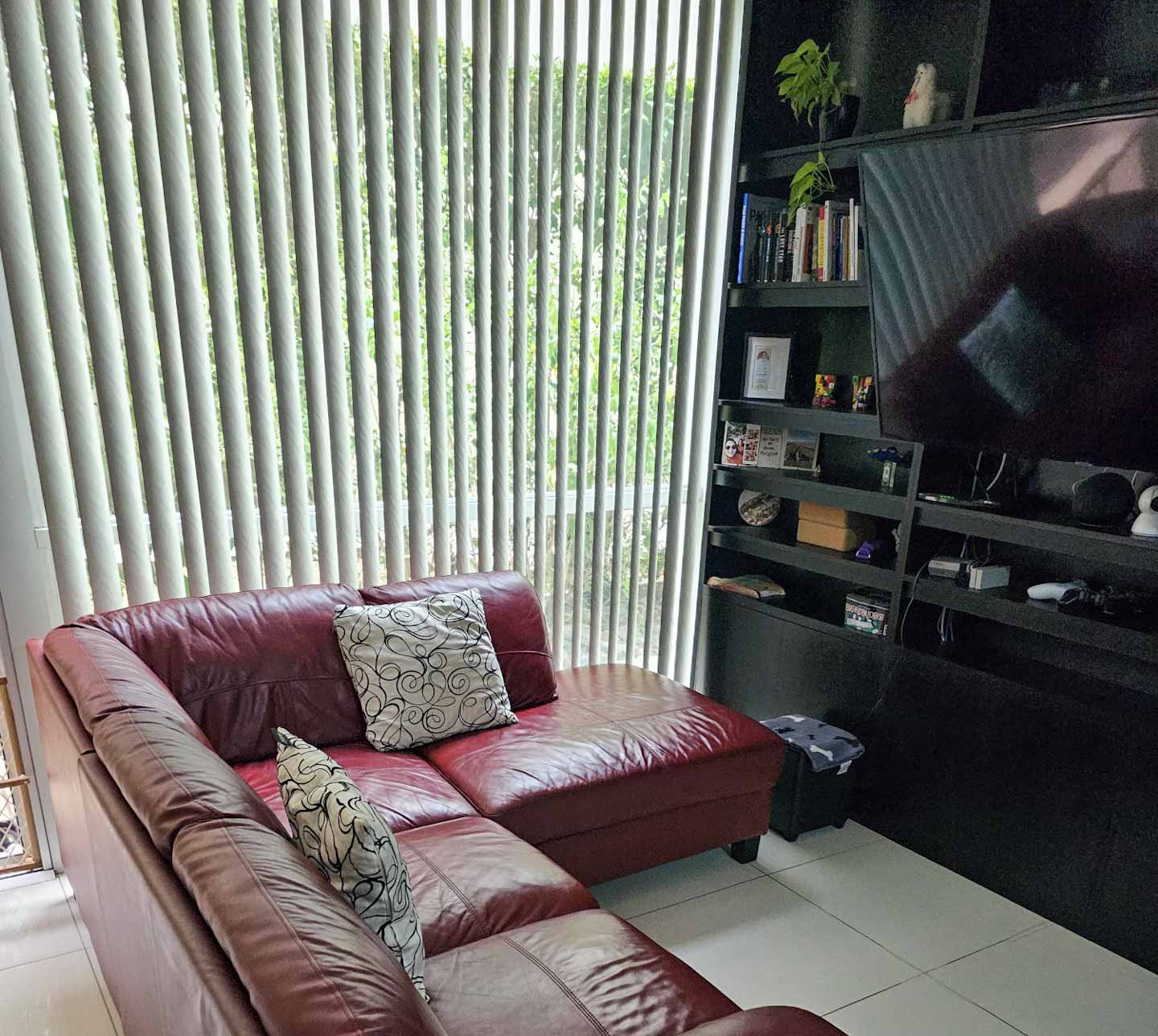 - Persianas en toda la casa y mueble de madera integrado para televisor.