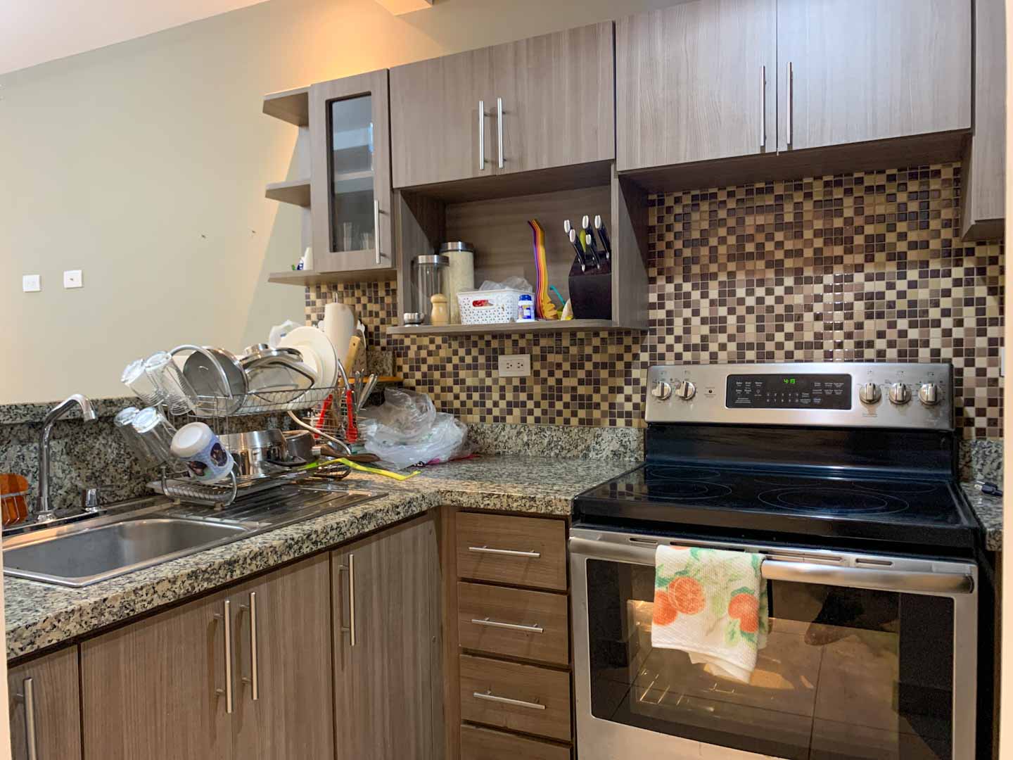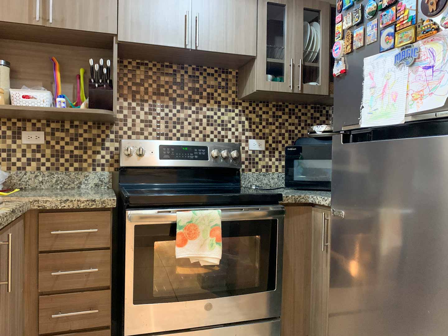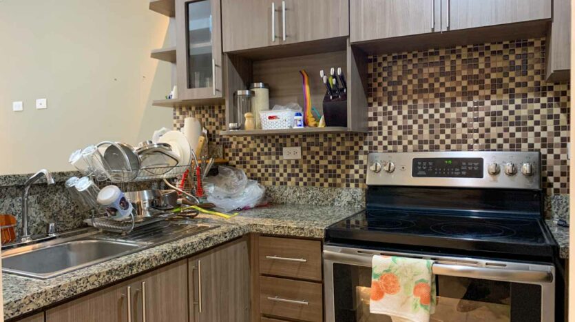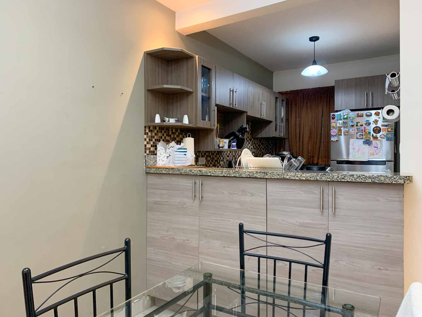 - Cocina moderna equipada con muebles de melamina y sobre de granito.