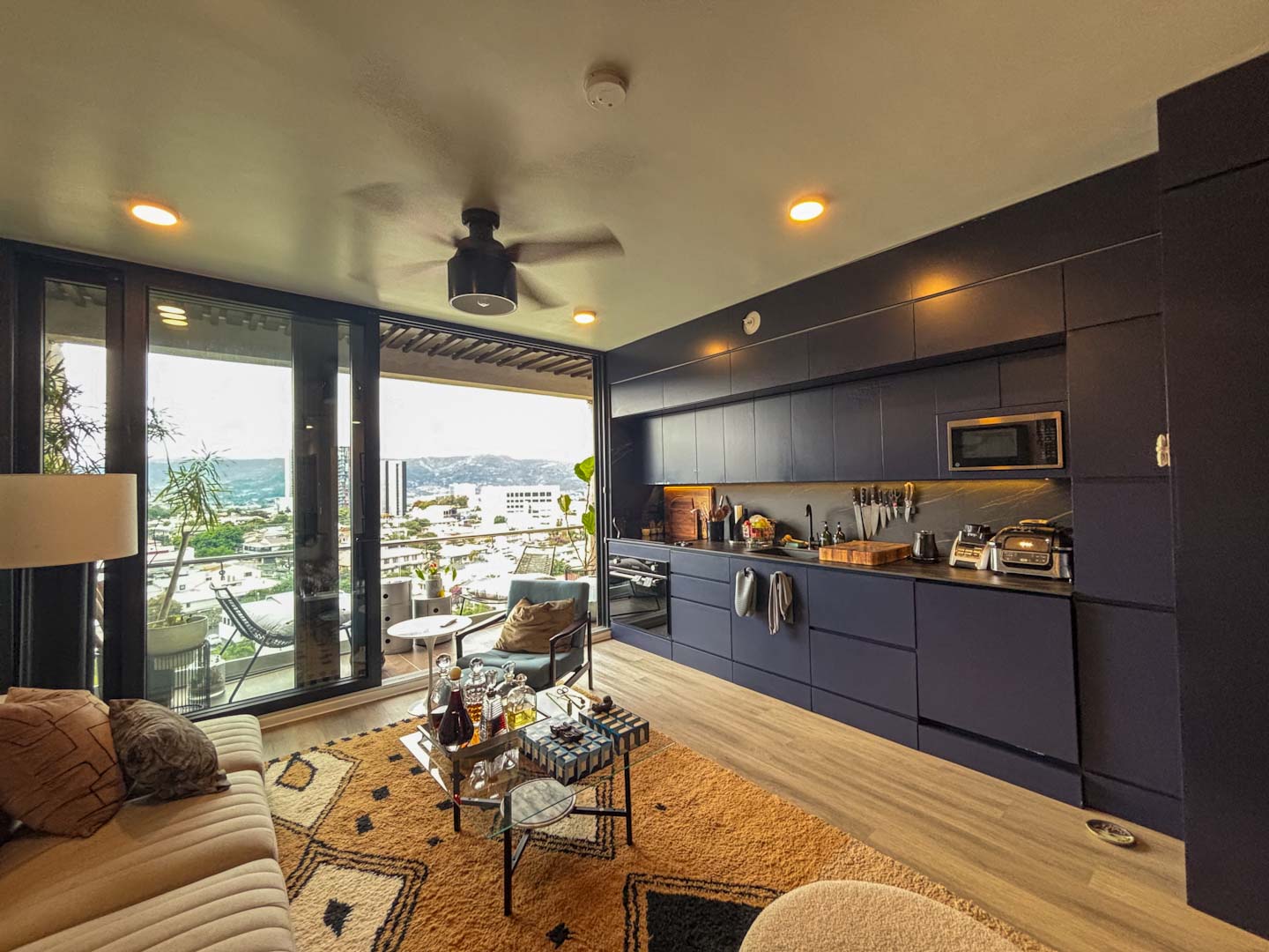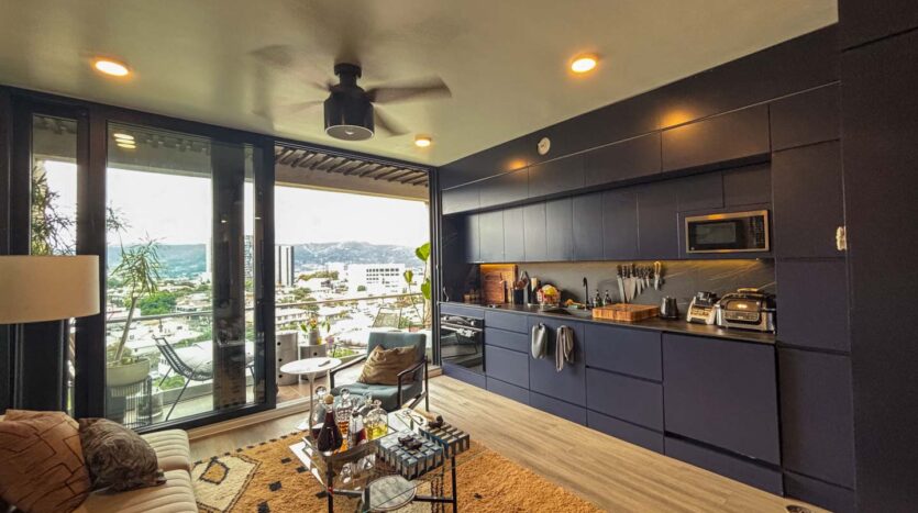 • Cocina de concepto abierto con muebles en tono oscuro, sobres de alta calidad y amplio espacio de almacenamiento