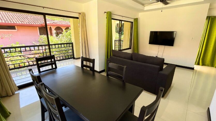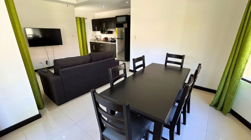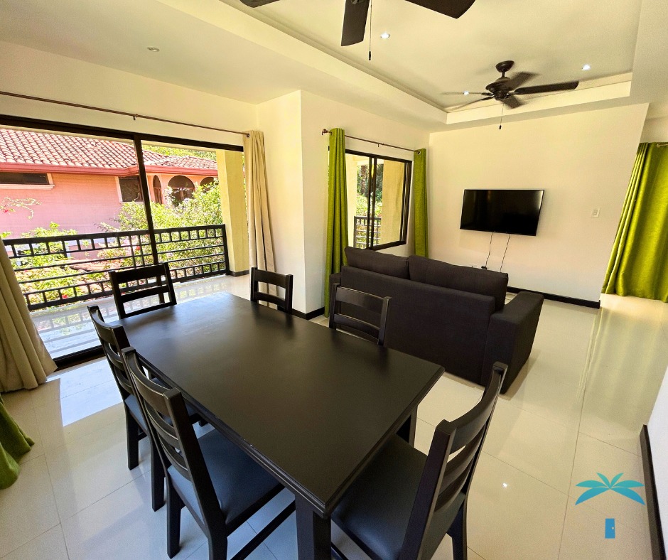 • The apartments come partially furnished, including a sofa, a dining set for four, a TV screen in the living room, laundry center, microwave, refrigerator, built-in electric stove, queen-size bed, and bunk bed with a single bed on top and a queen-size bed below.
