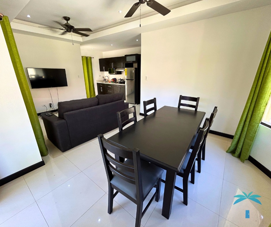 • Los apartamentos están parcialmente amueblados, incluyendo un sofá, un juego de comedor para cuatro personas, una pantalla de TV en la sala, centro de lavado, microondas, refrigeradora, plantilla eléctrica empotrada, cama queen y litera con una cama individual arriba y una queen abajo.