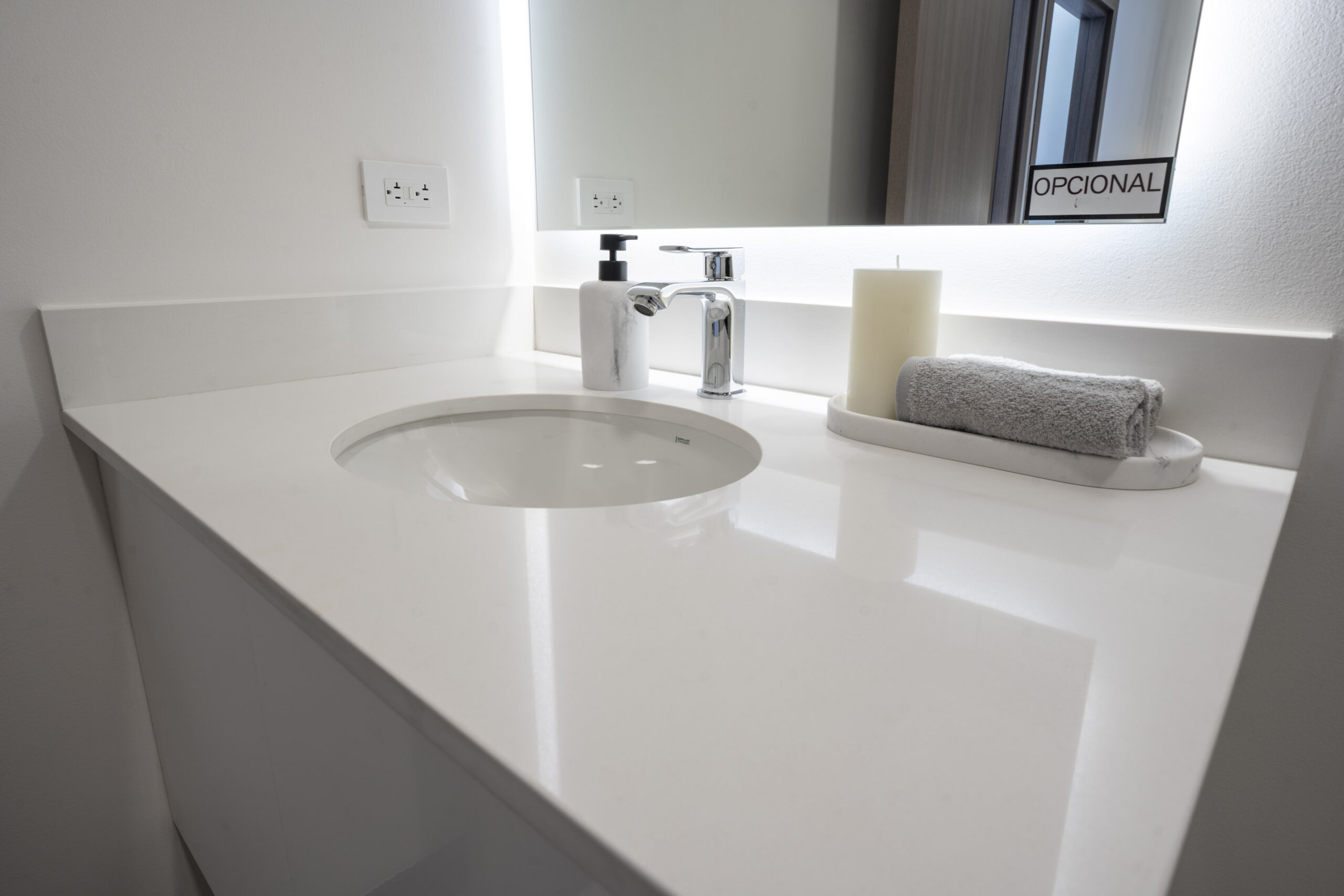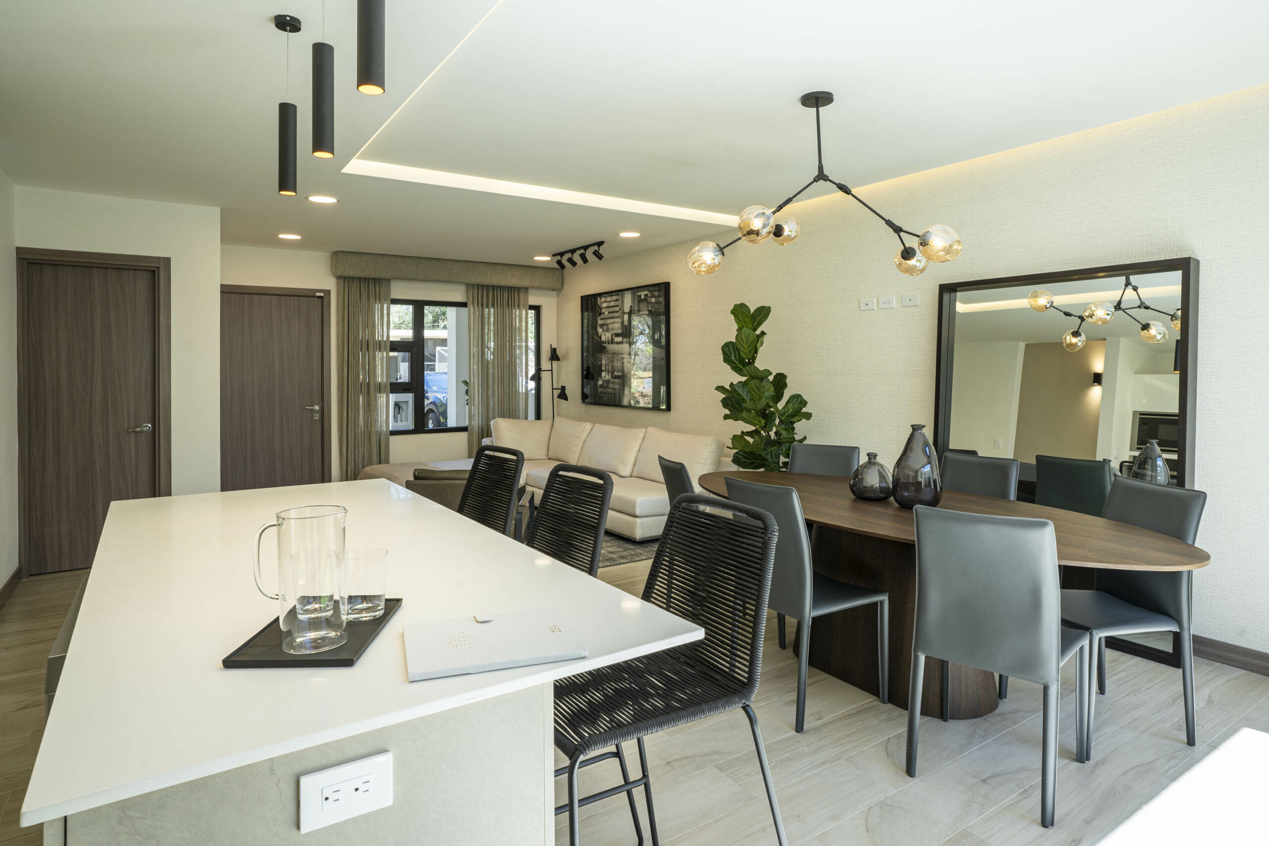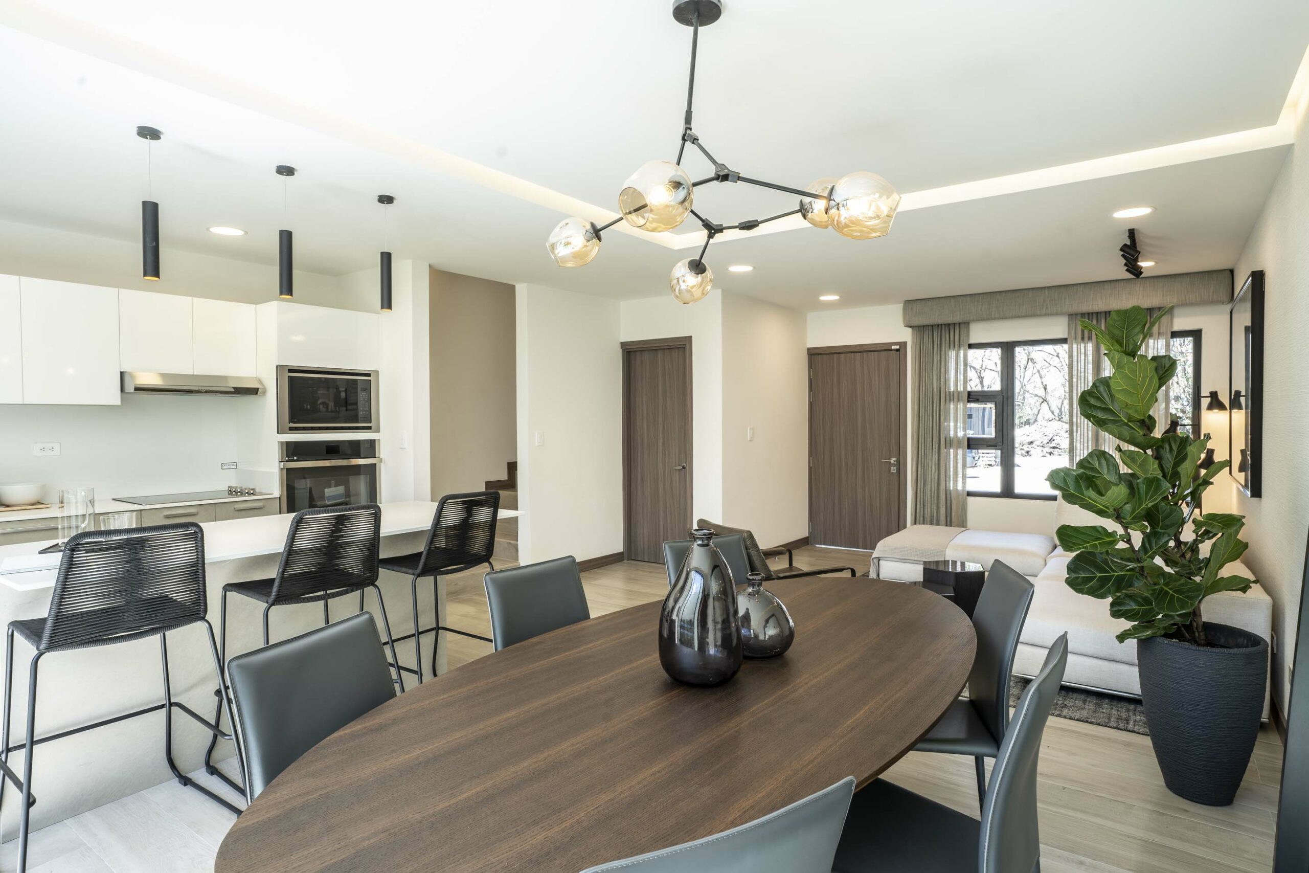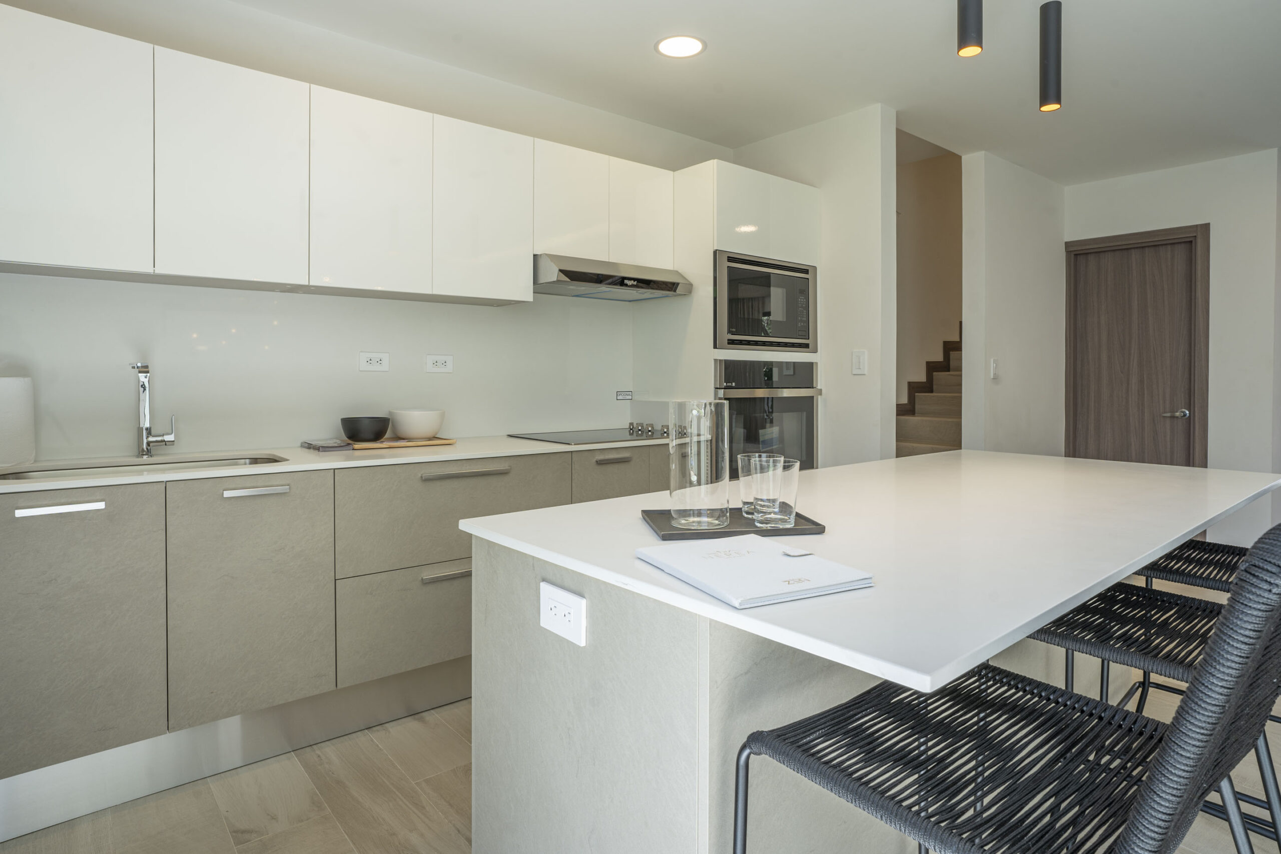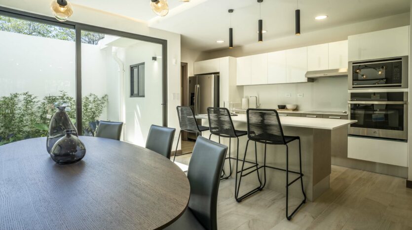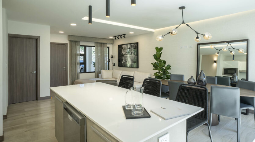 Su espectacular cocina luce sobres de cuarzo y diseño italiano, destacando su amplia y cómoda isla de desayunador.