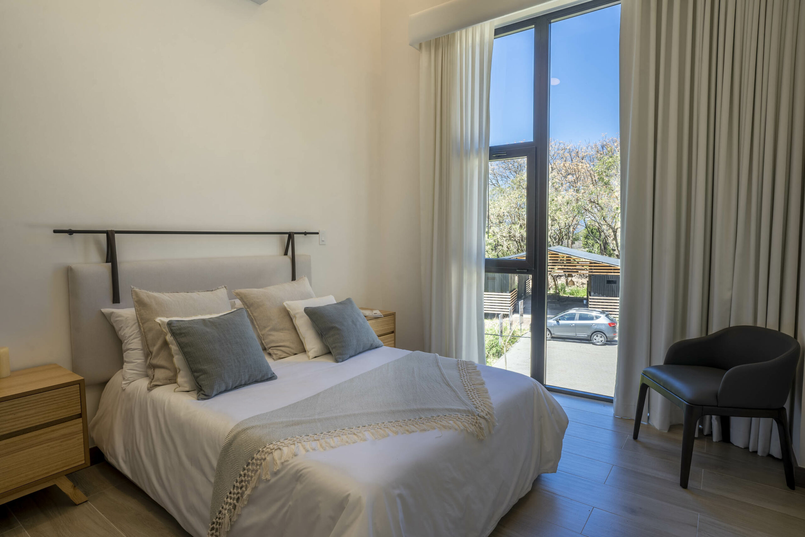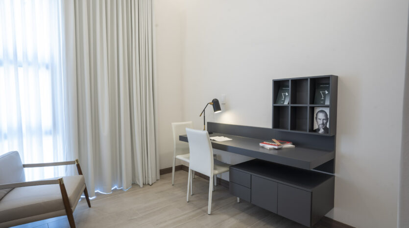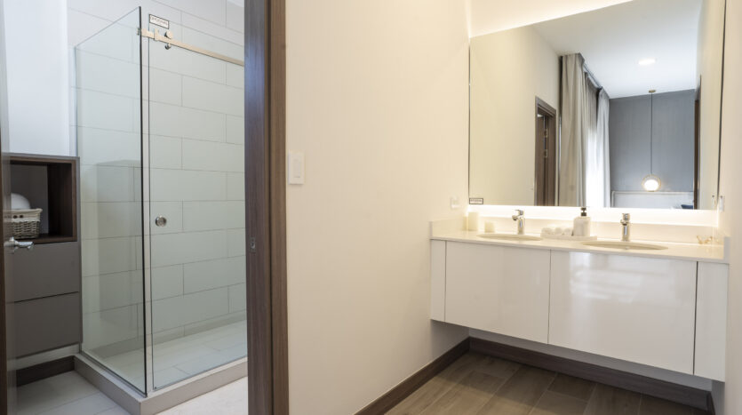 Dispone de 3 habitaciones, compartiendo un baño completo sus habitaciones secundarias; mientras la habitación principal cuenta con baño privado y walk in closet, en esta habitación destaca su espacio apto para cama King, muebles de noche y muebles de TV