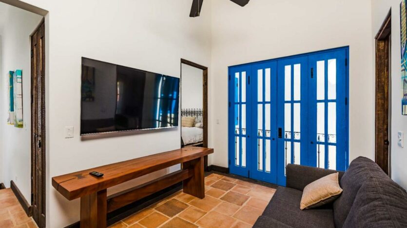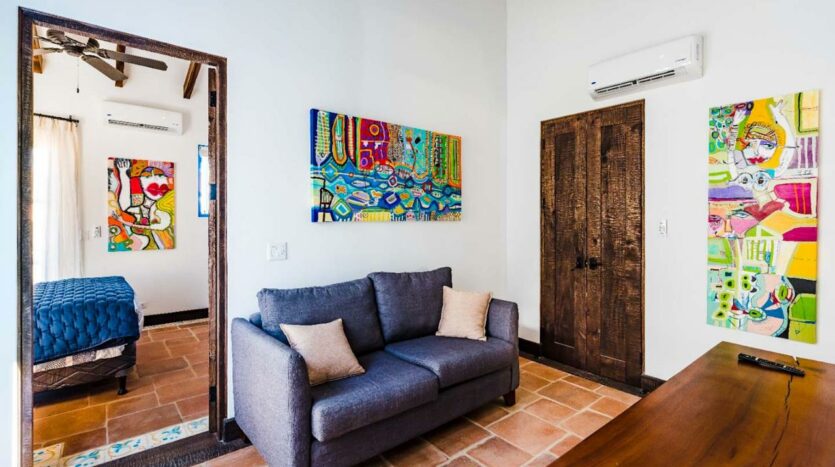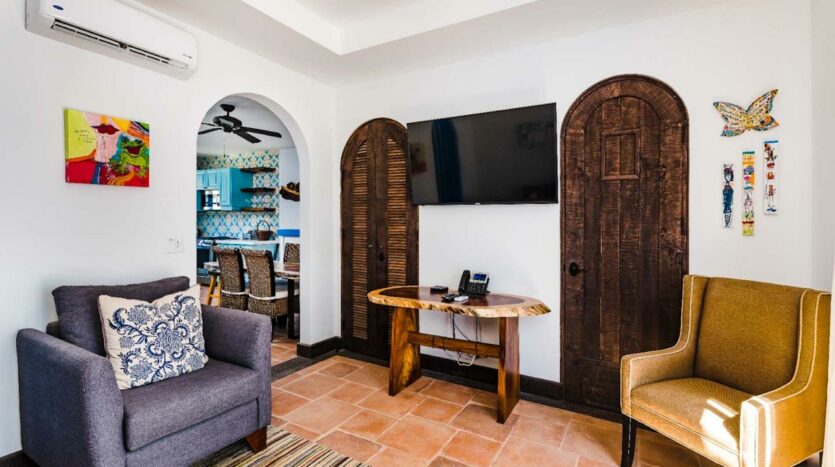 Upon entering the open-air courtyard, you’re welcomed into a bright and inviting space perfect for relaxation. The first floor includes a well-equipped kitchen, a cozy living room, and a dining area, making it ideal for hosting guests or enjoying quiet nights at home. Custom wood furniture adds elegance to the communal spaces, enhancing the overall atmosphere.