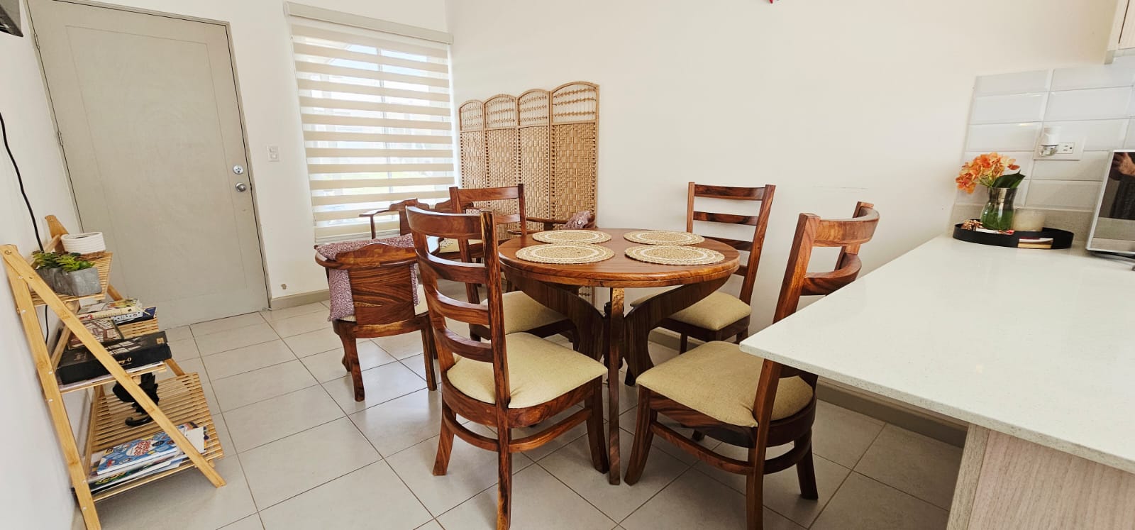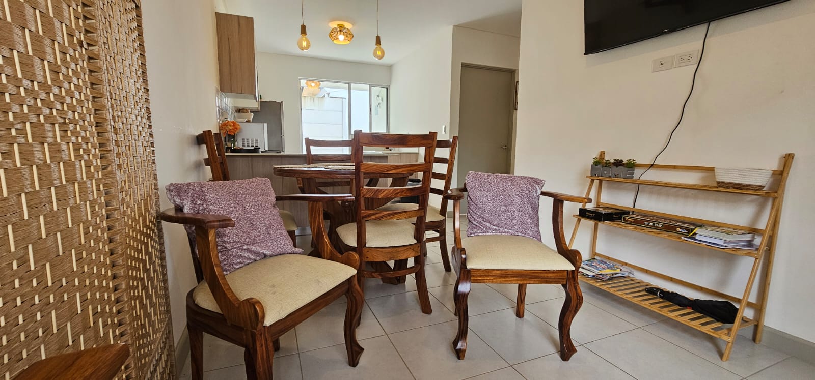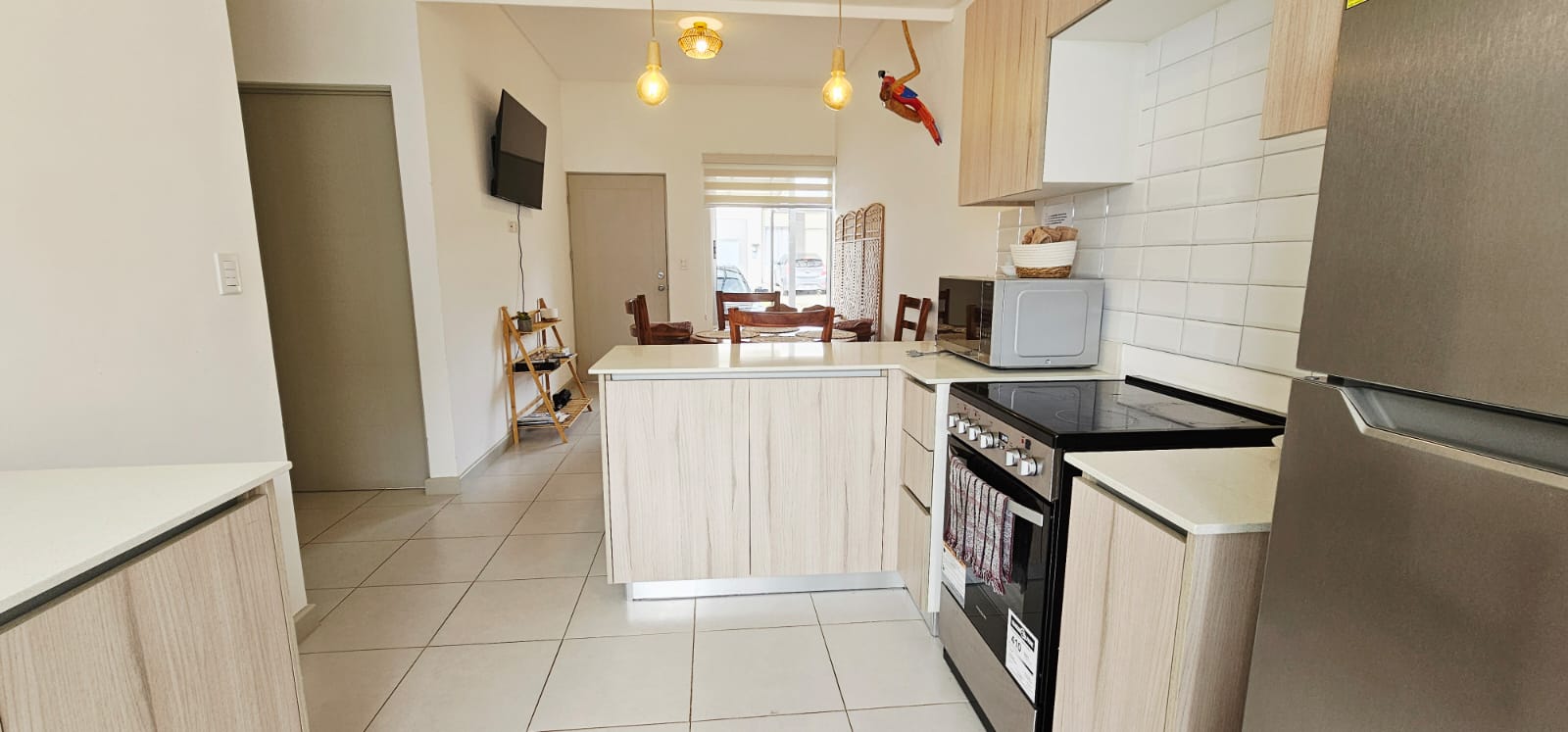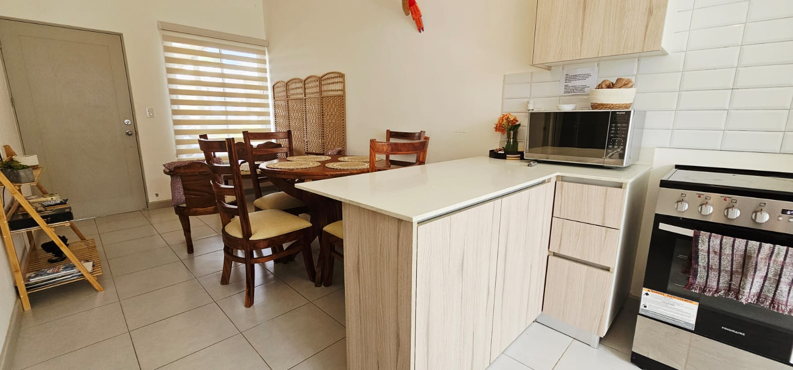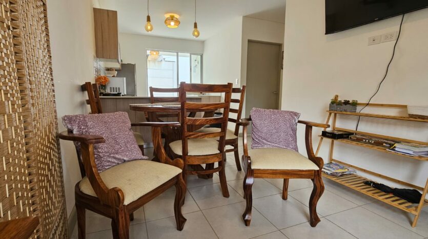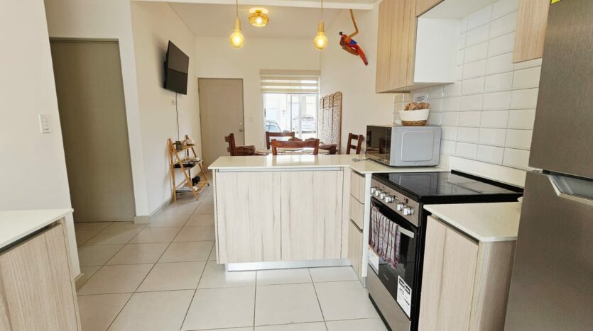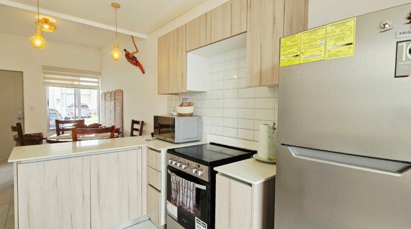 - Línea blanca completa: refrigeradora, cocina, horno de microondas, horno tostador, licuadora, cafetera, menaje, sartenes, entre otras cosas.