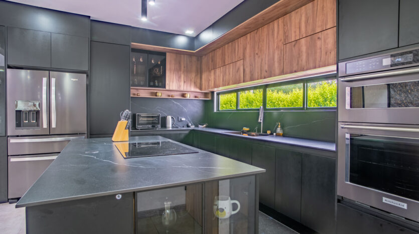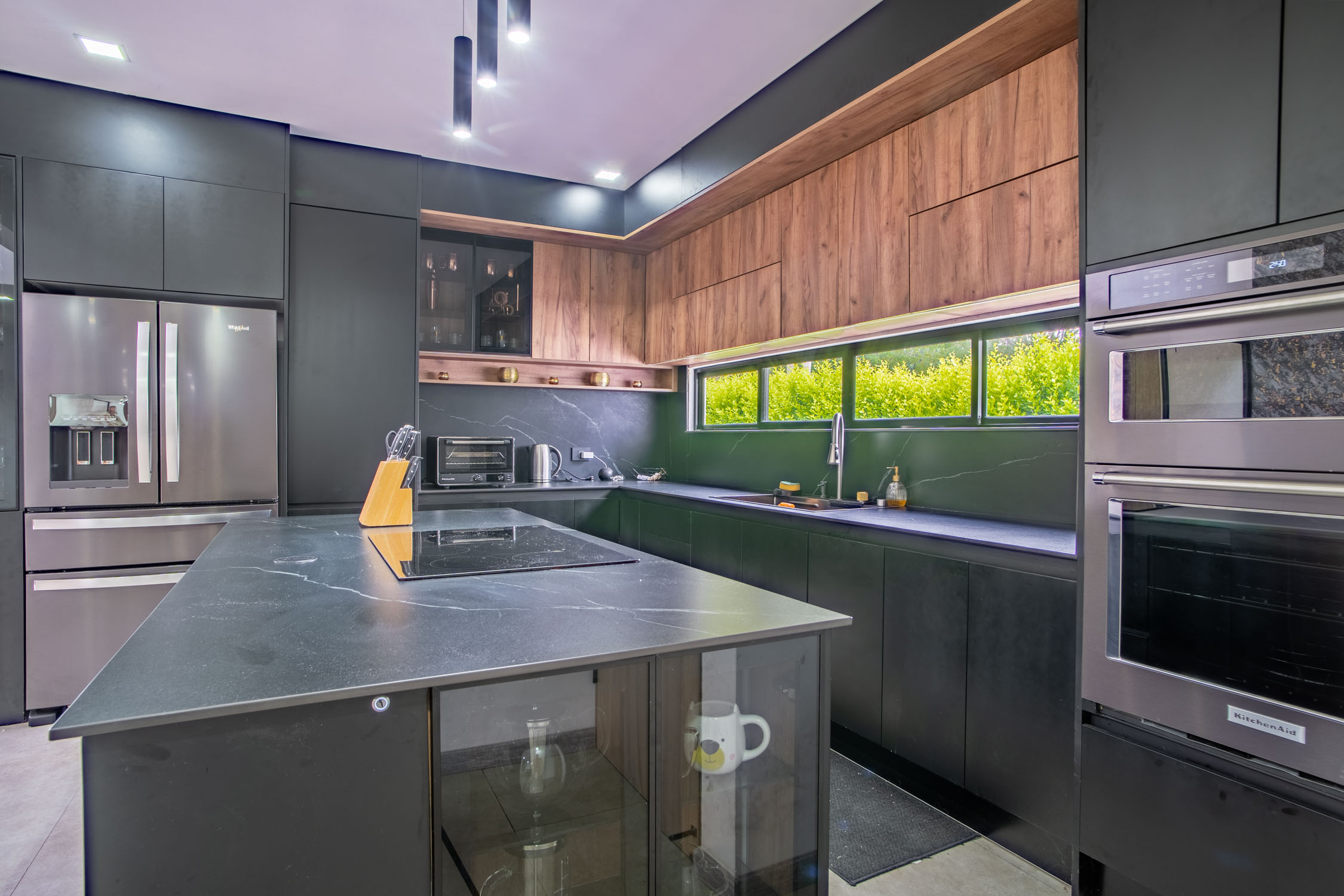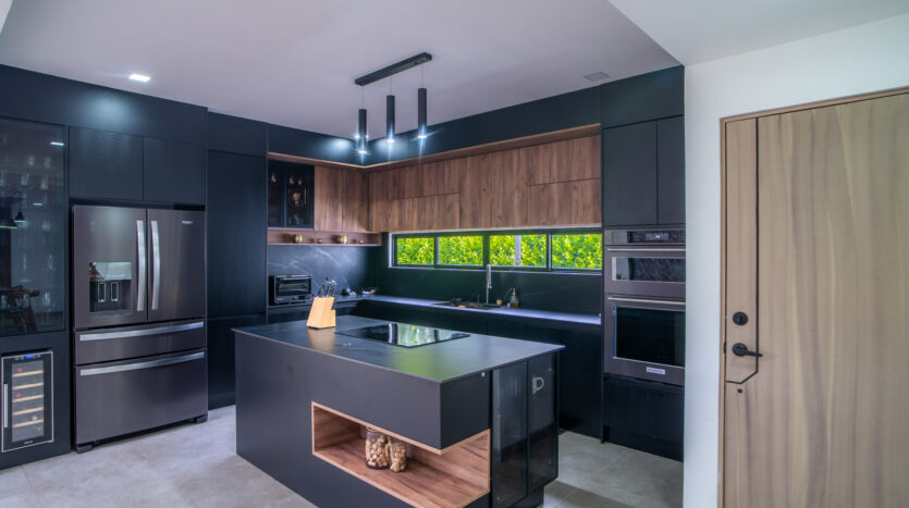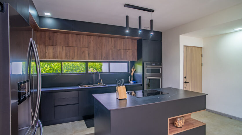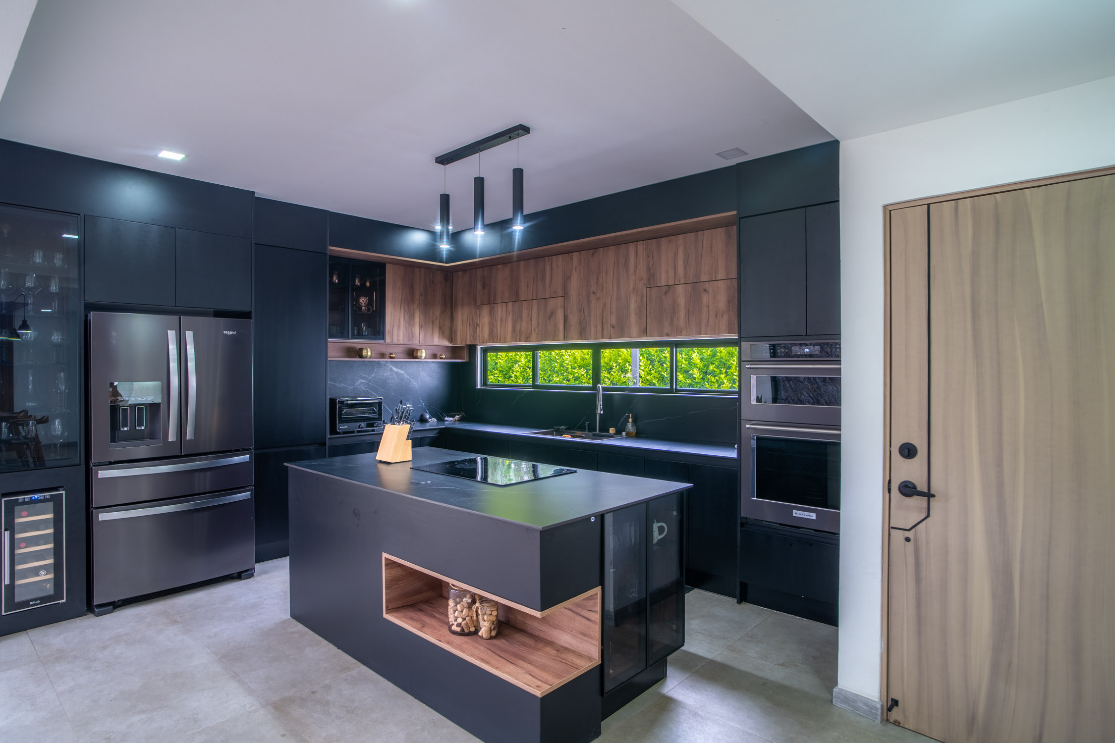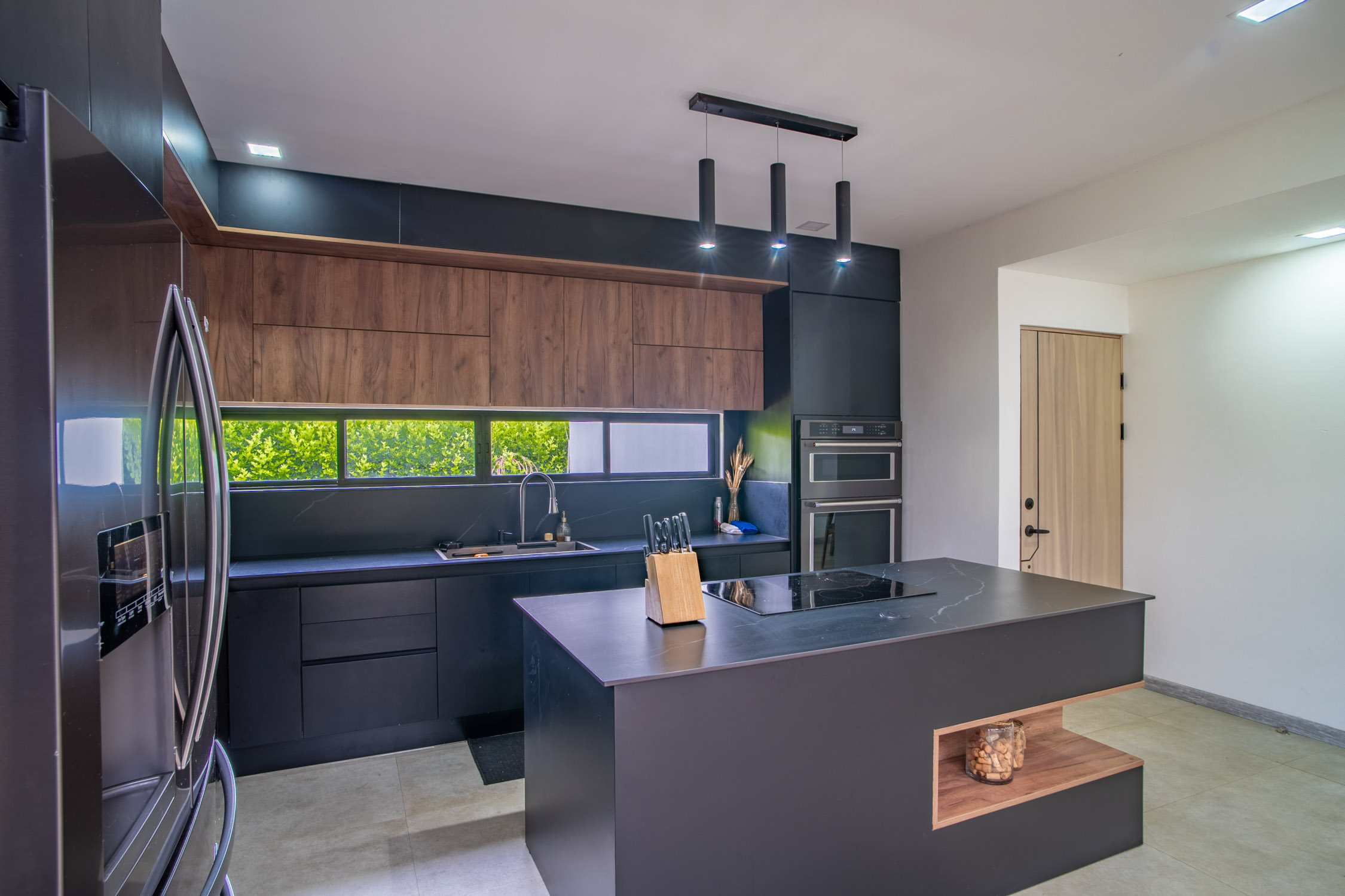 • Cocina moderna color negro con isla de porcelanato, perfecta para compartir momentos especiales.