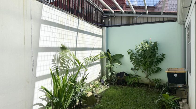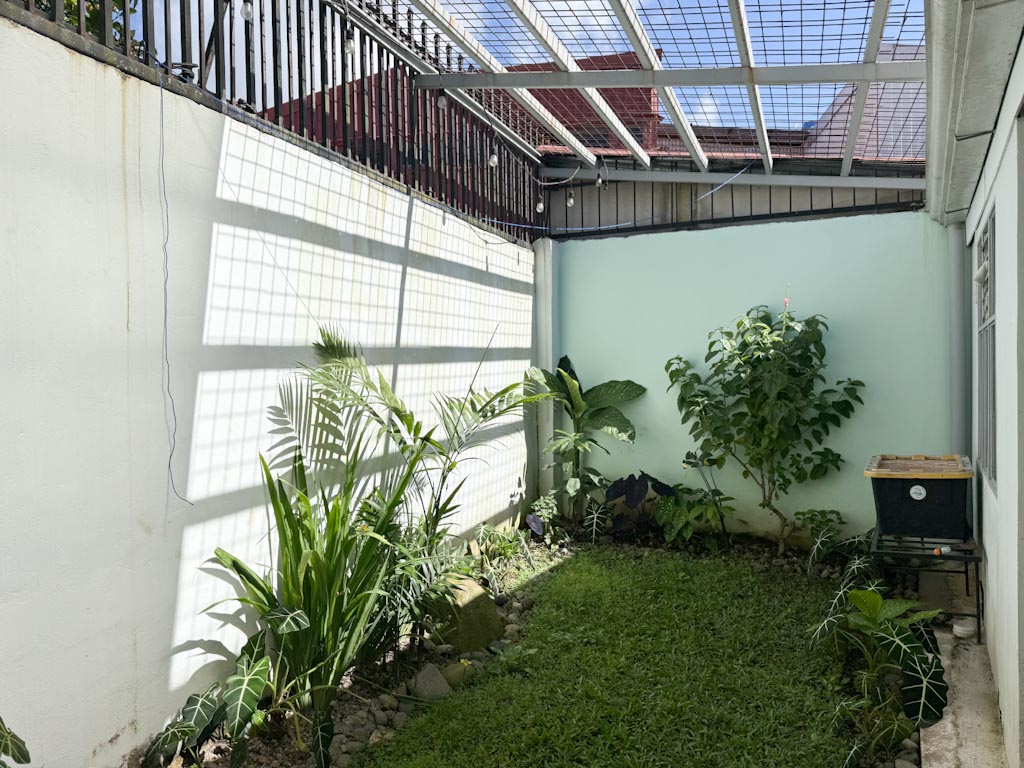 Cochera para 2 vehículos, patio con jardín y area de pilas techada.