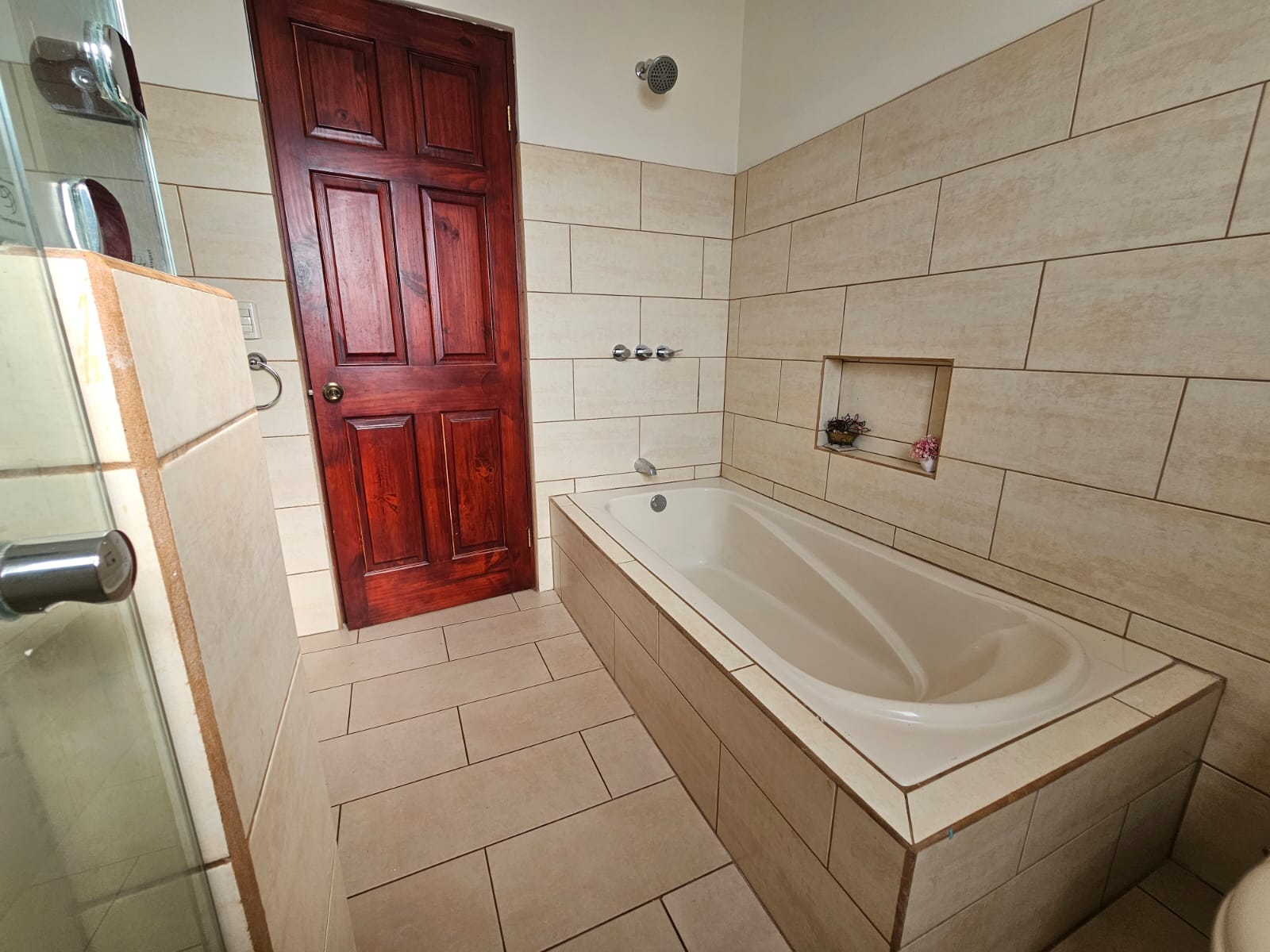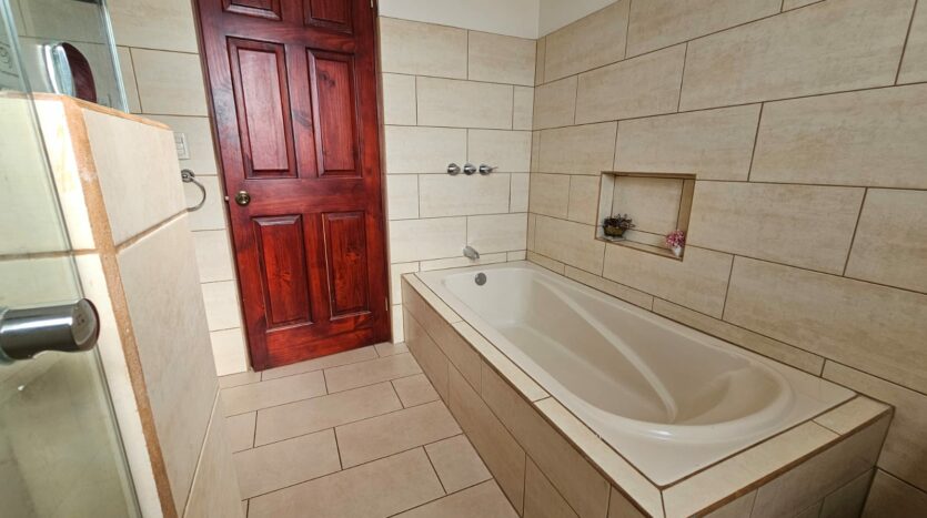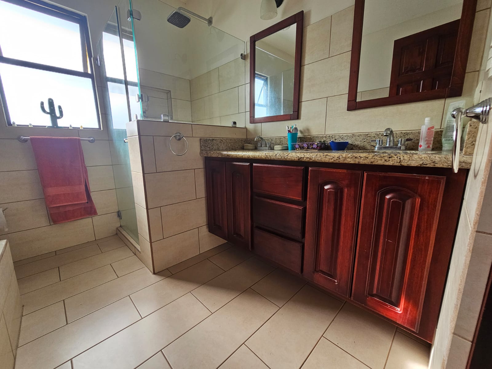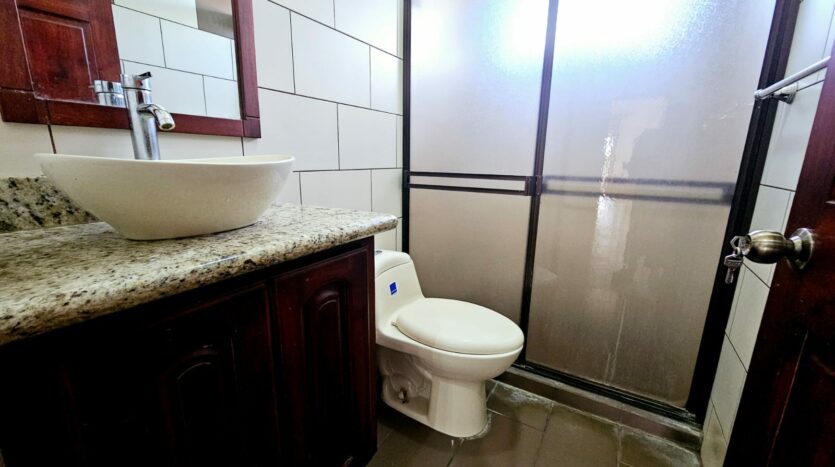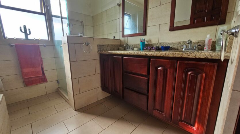 - Baño completo compartido con sobres en granito y muebles de madera.