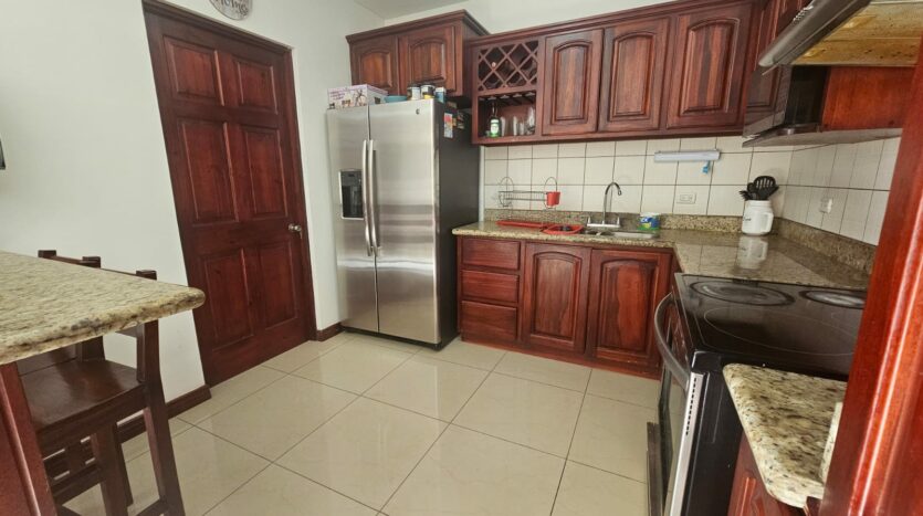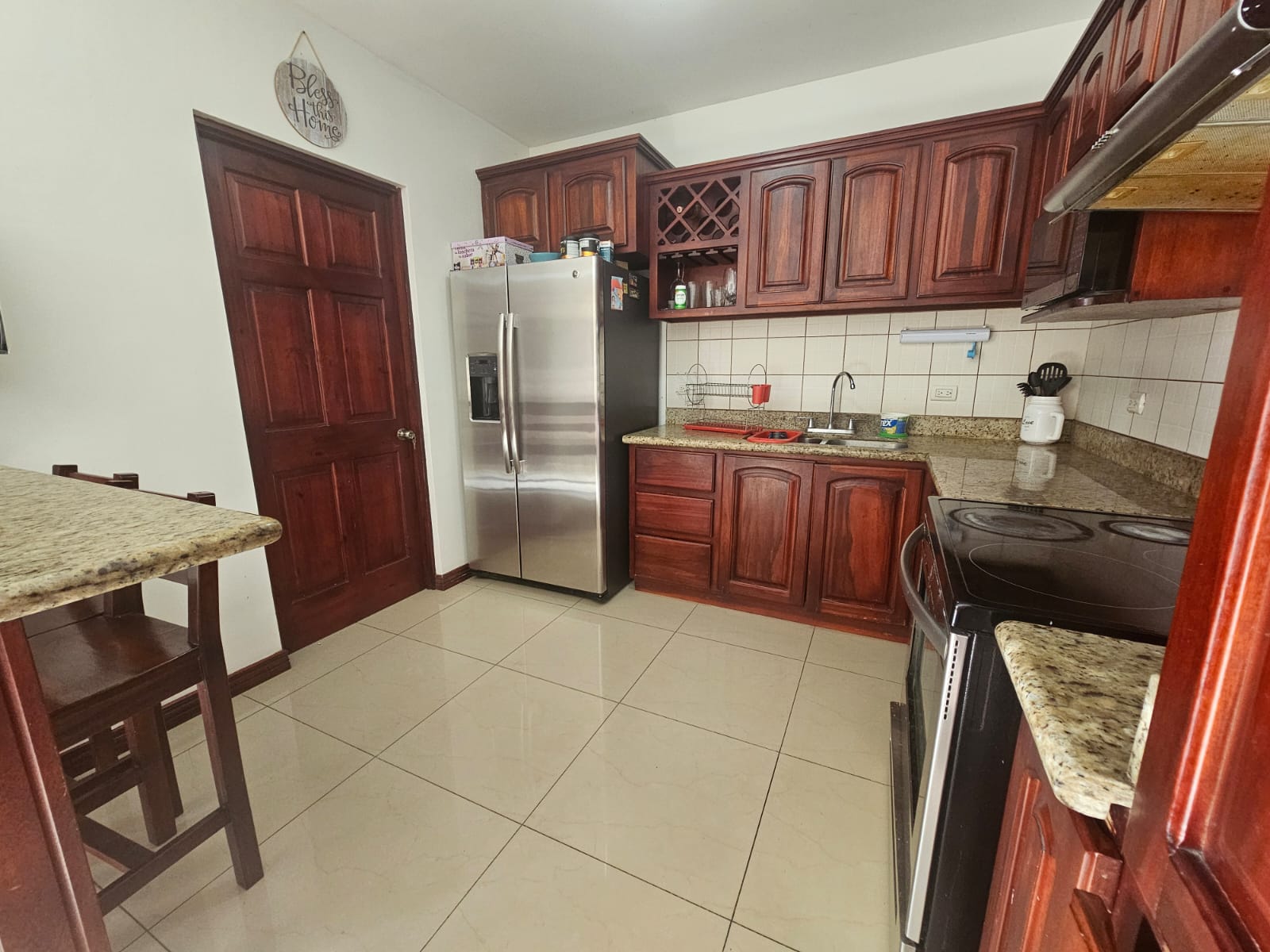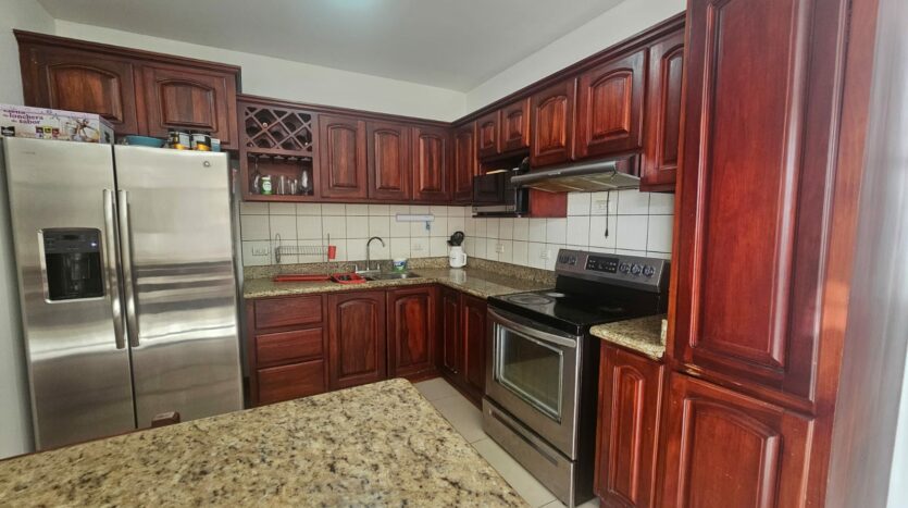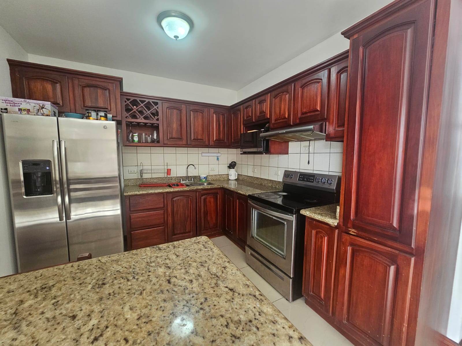 - Cocina amueblada con muebles de madera y sobres en granito, incluye desayunador.