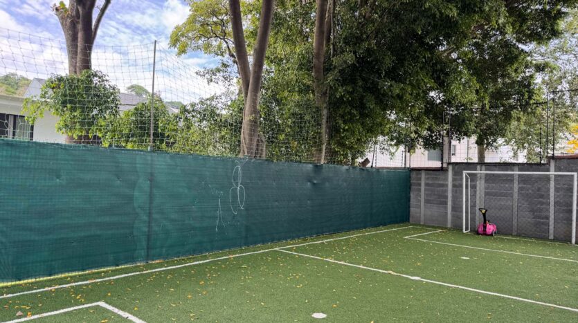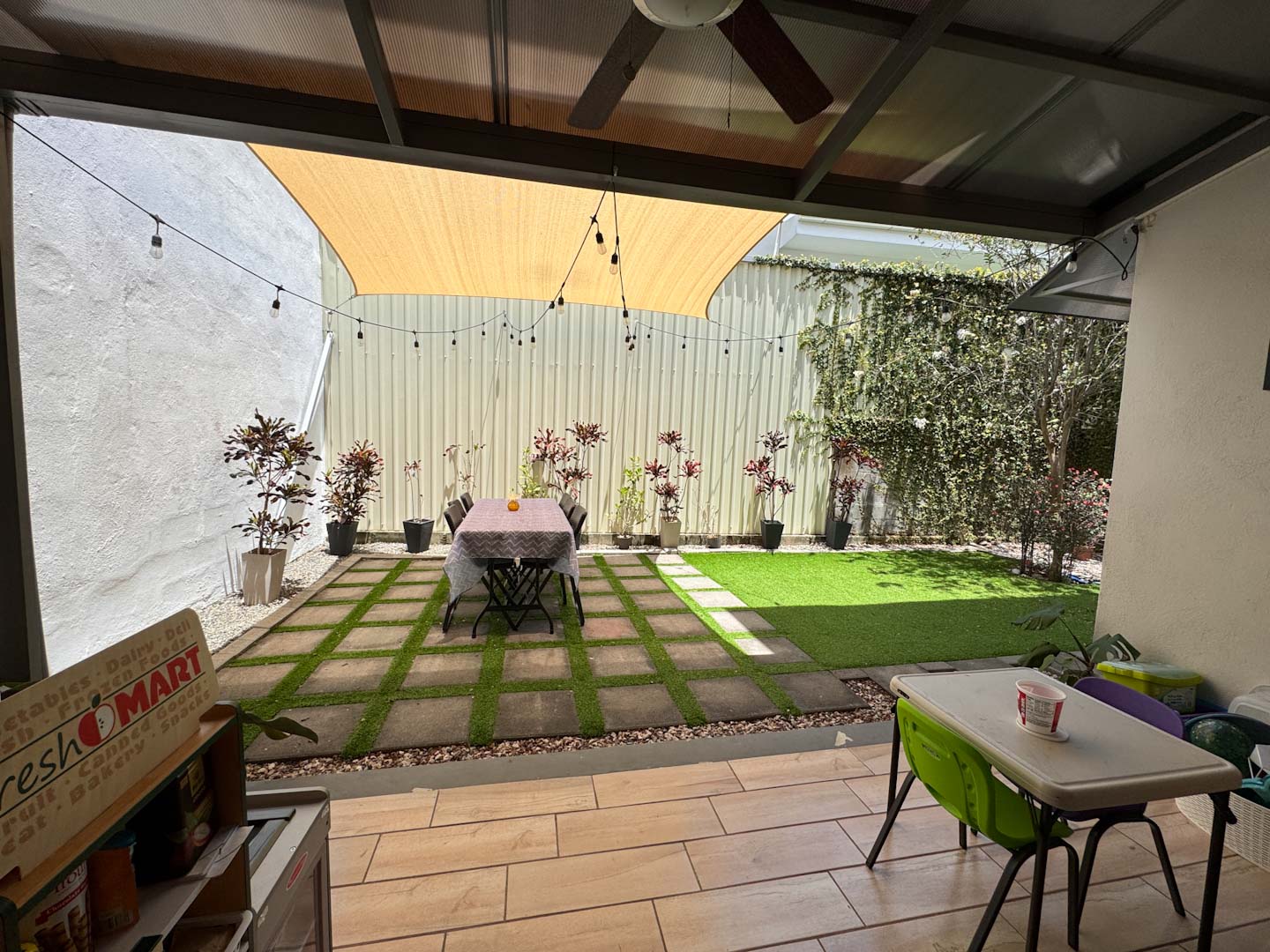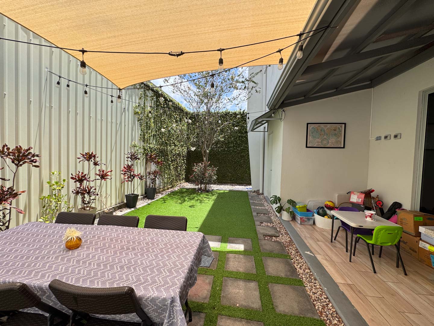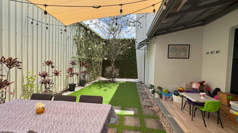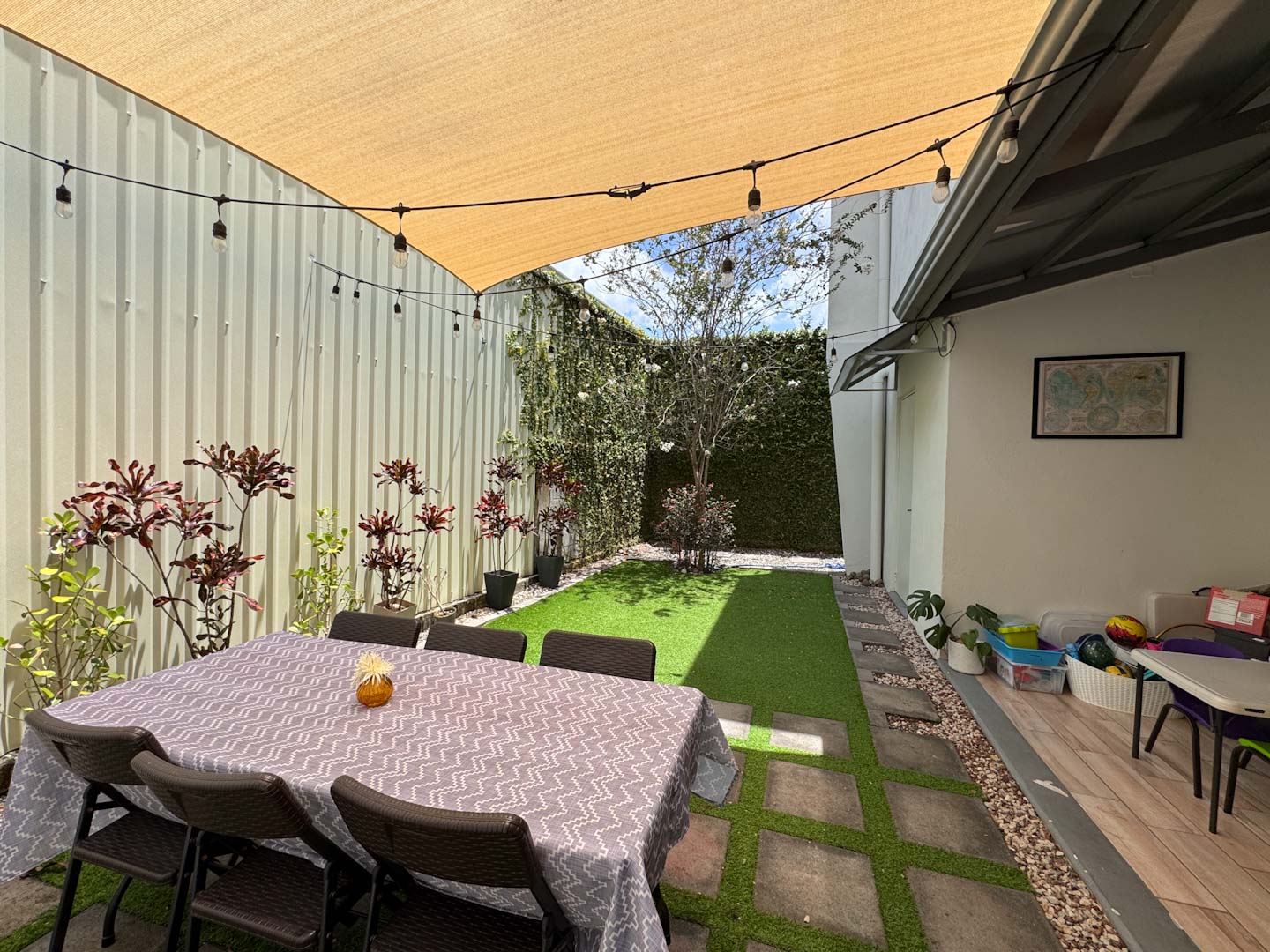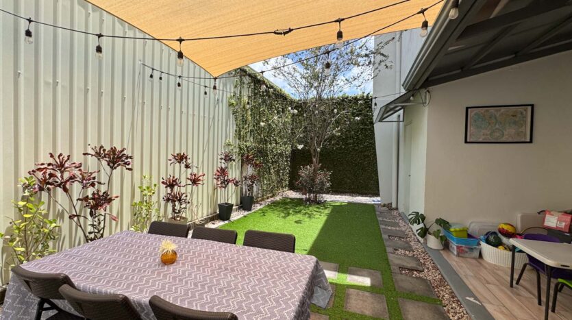 Jardín trasero con zacate sintético, toldo y acceso lateral independiente para jardinería