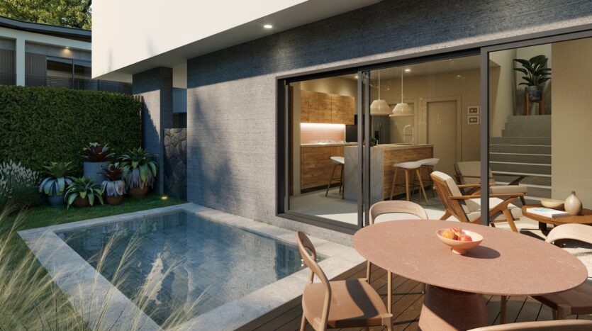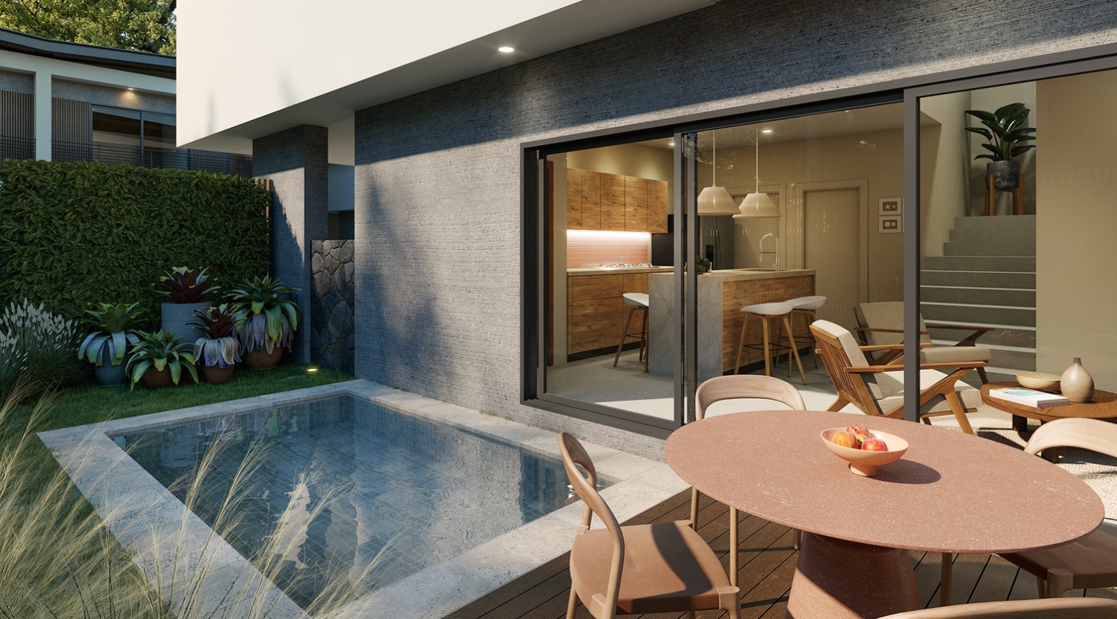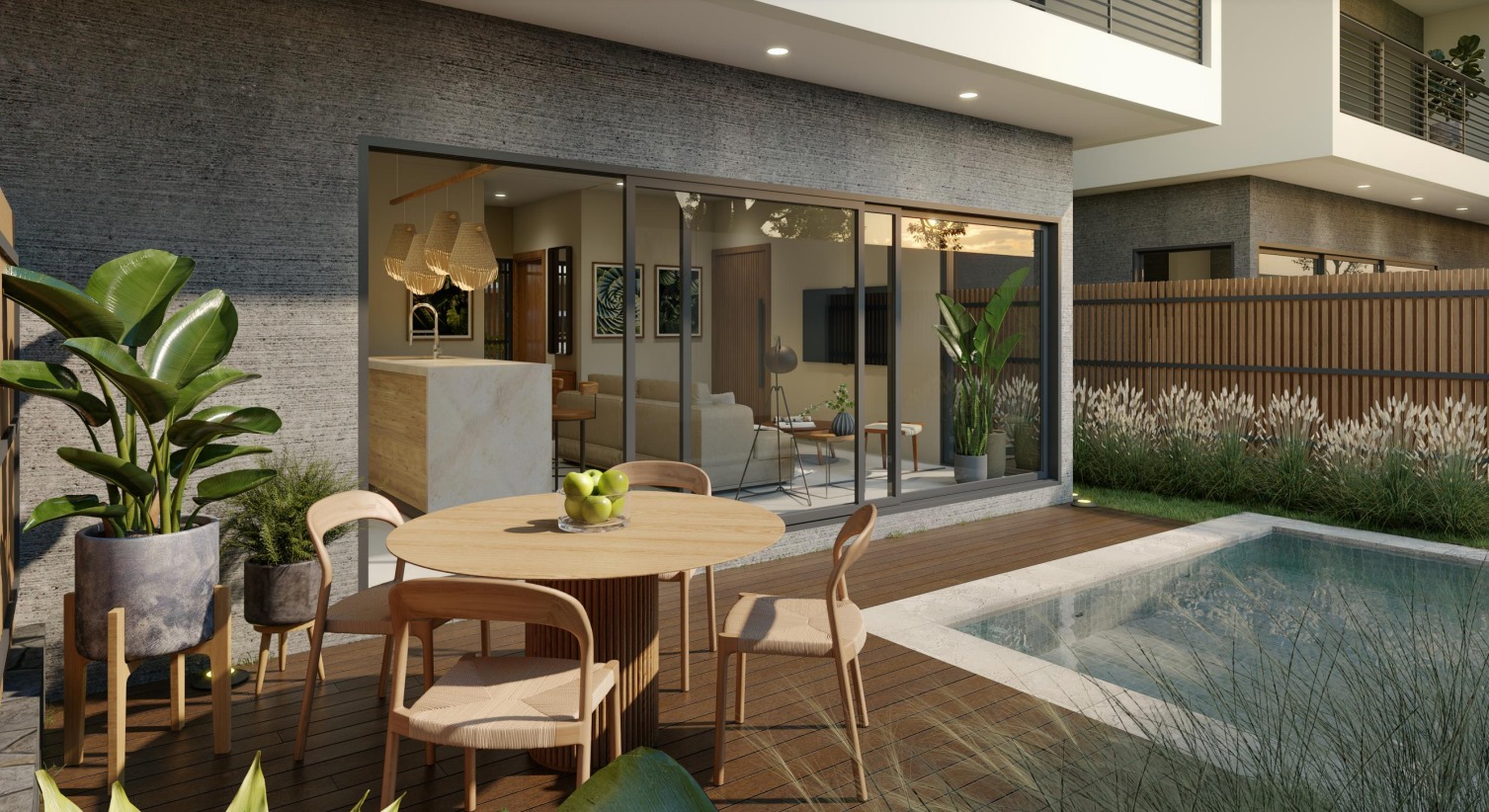 Tenemos disponibles 2 modelos de casas. La primera opción, Casa A, presenta un diseño con dos dormitorios cada uno con su baño privado, el cuarto principal cuenta walk in closet, medio baño en el primer piso, estacionamiento bajo techo para 2 vehículos, esta la casa ideal para parejas jóvenes, familias pequeñas o personas que buscan un espacio acogedor, adicionalmente el diseño cuenta con una amplia cocina completa, una cómoda sala de estar, balcones para disfrutar del aire fresco y una piscina privada.
