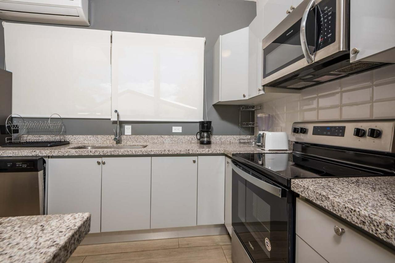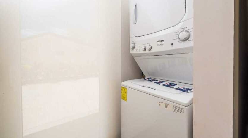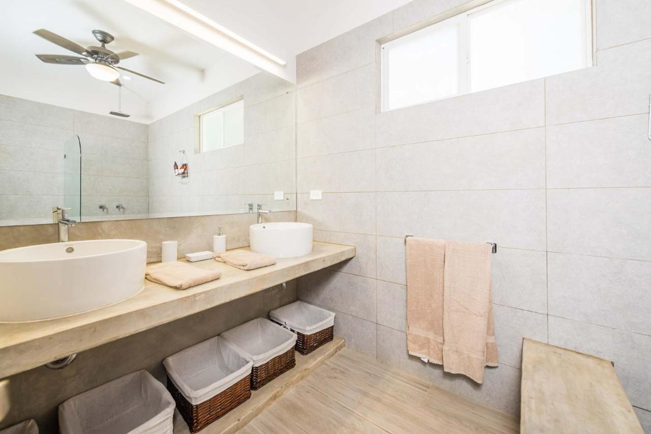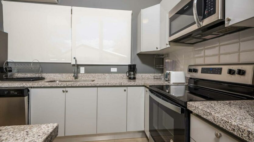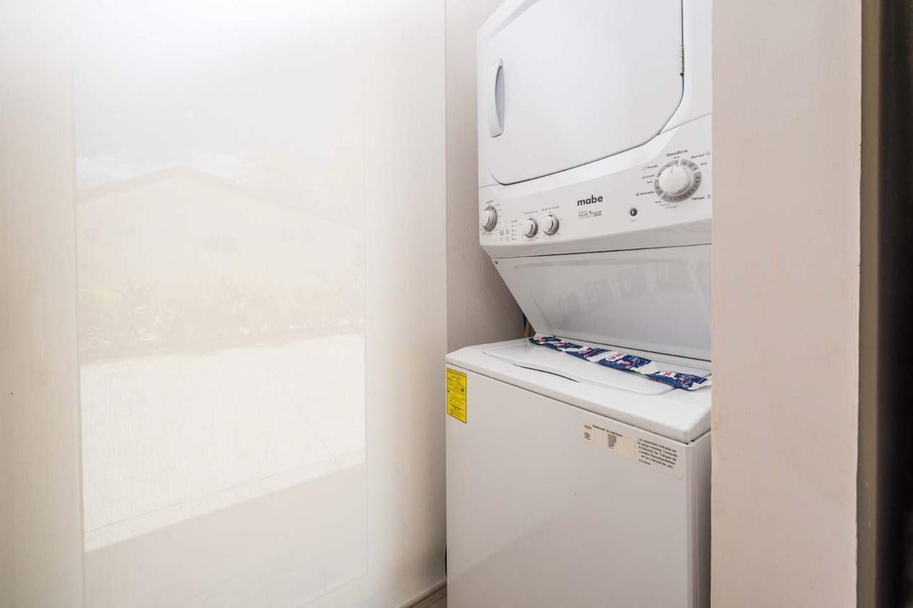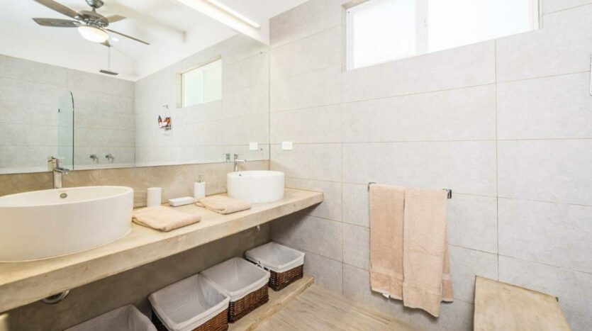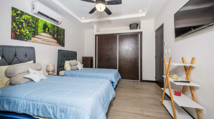 The villa features a sleek and modern design, boasting an open-concept living space that seamlessly integrates the living, dining, and kitchen areas, perfect for entertaining guests. The fully equipped kitchen makes cooking a breeze with its modern appliances. Both bedrooms open up onto a meticulously kept courtyard and one of the community pools, while the bathrooms are appointed with modern fixtures and distinctive tile work.