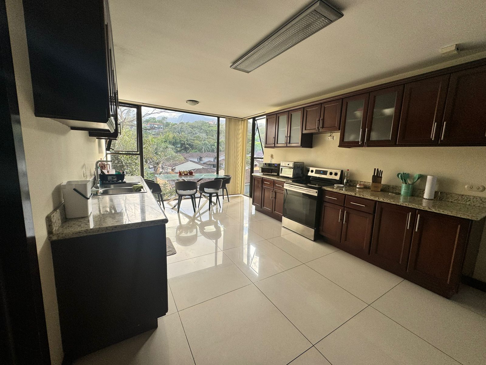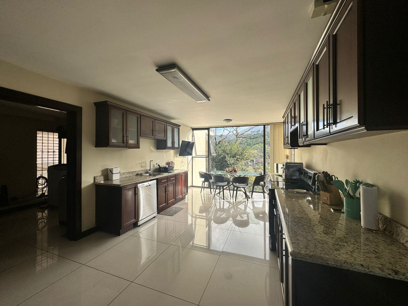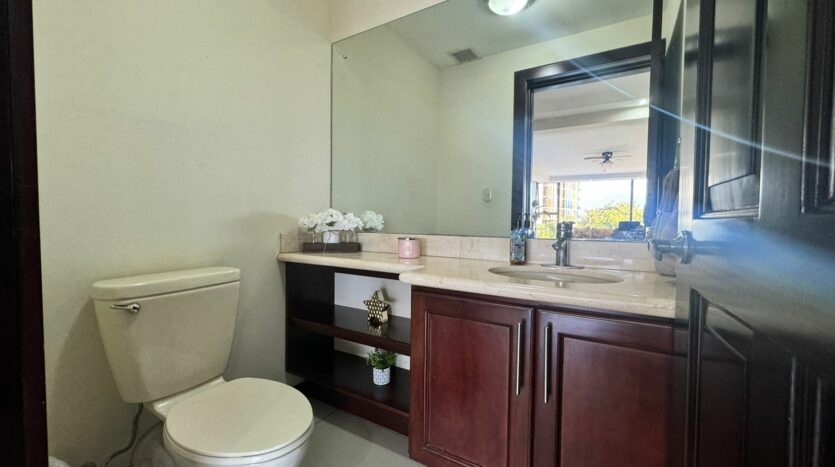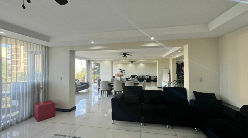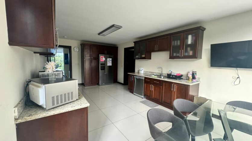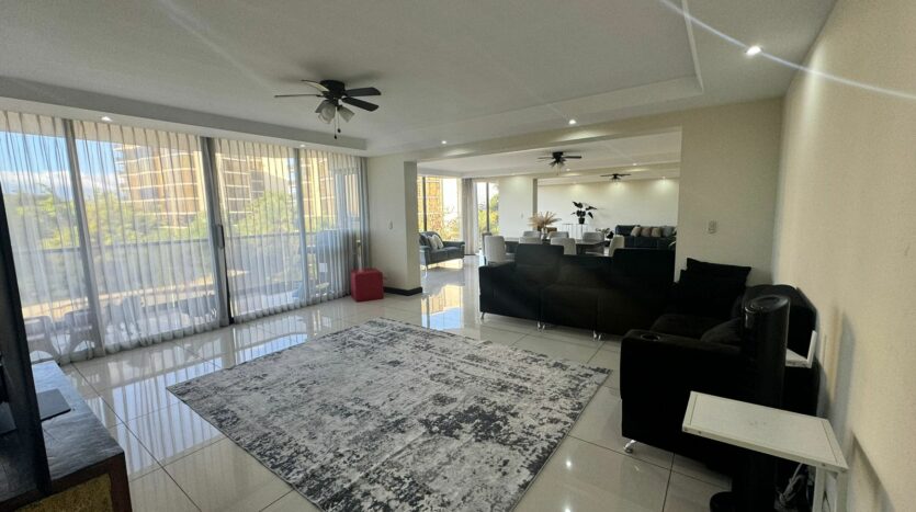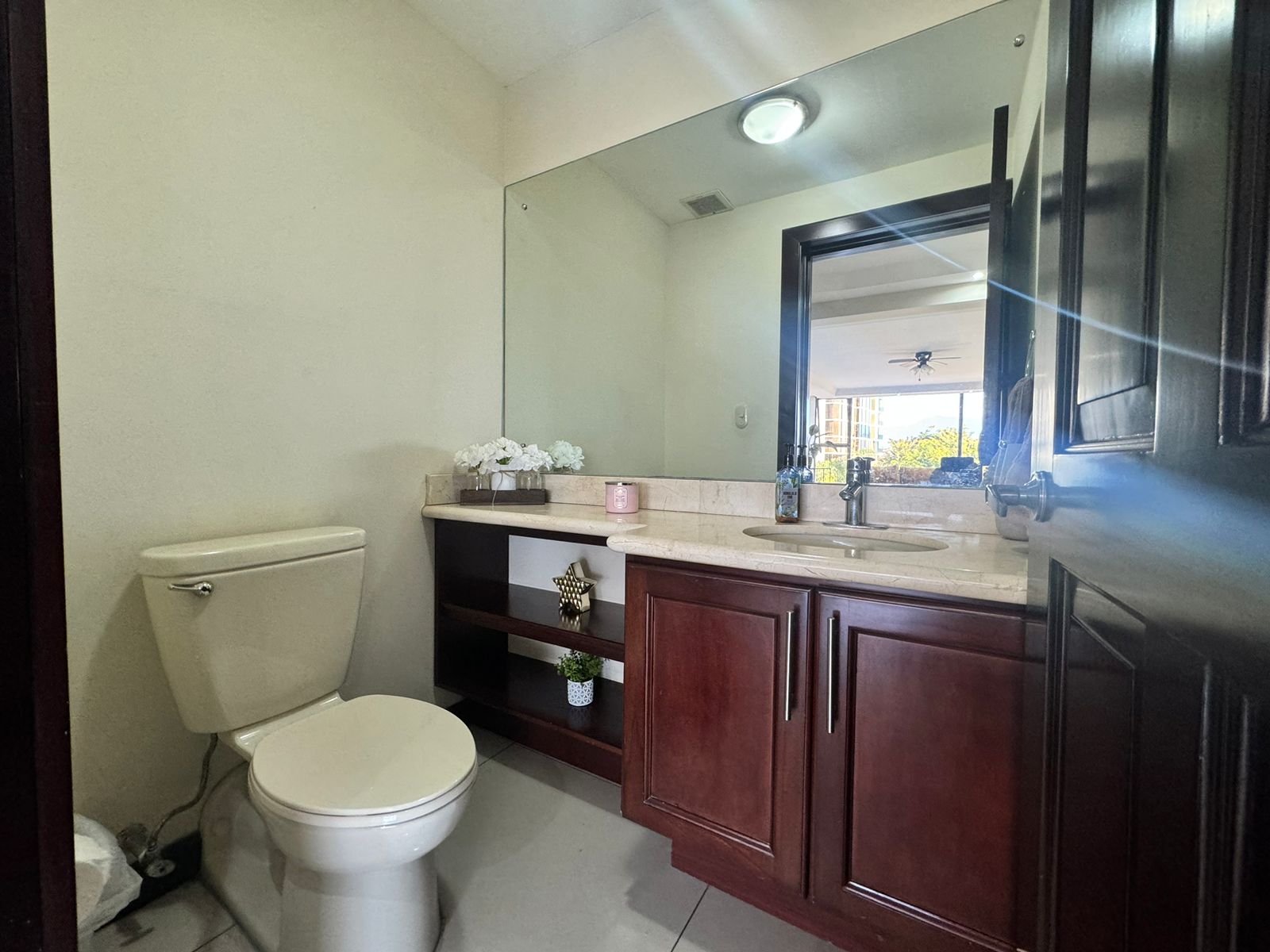 El acceso al apartamento debe registrar un código en el Lobby y al llegar al 4 piso encontrará su nuevo hogar, con 1/2 baño de visitas, espacio de sala, comedor y sala de tv grandes y cómodas con iluminación con altos ventanales, vistas al Oeste para disfrutar del atardecer desde cualquier de estos espacios. La cocina es amplia, con muebles de granito y madera finamente acabados, espacio para mesa redonda de desayuno.