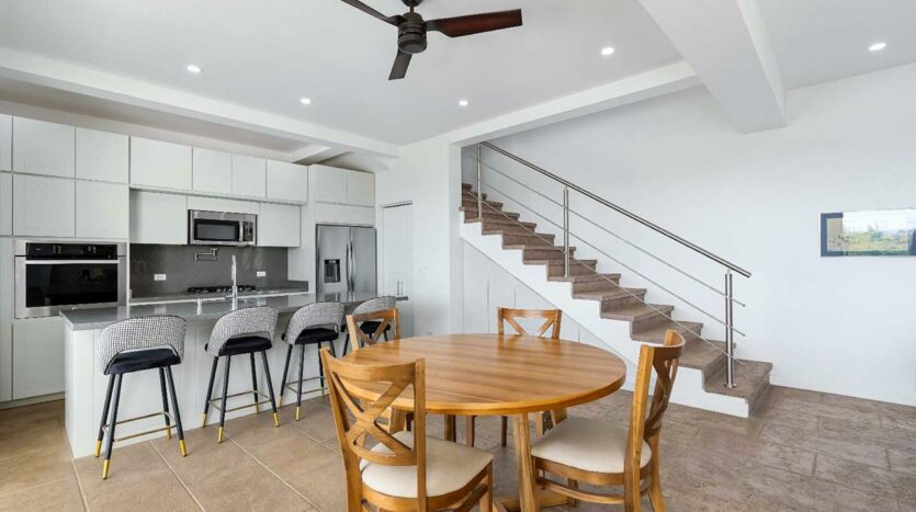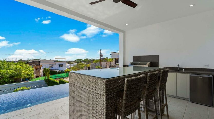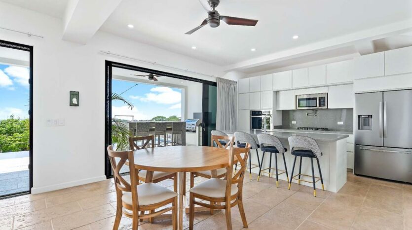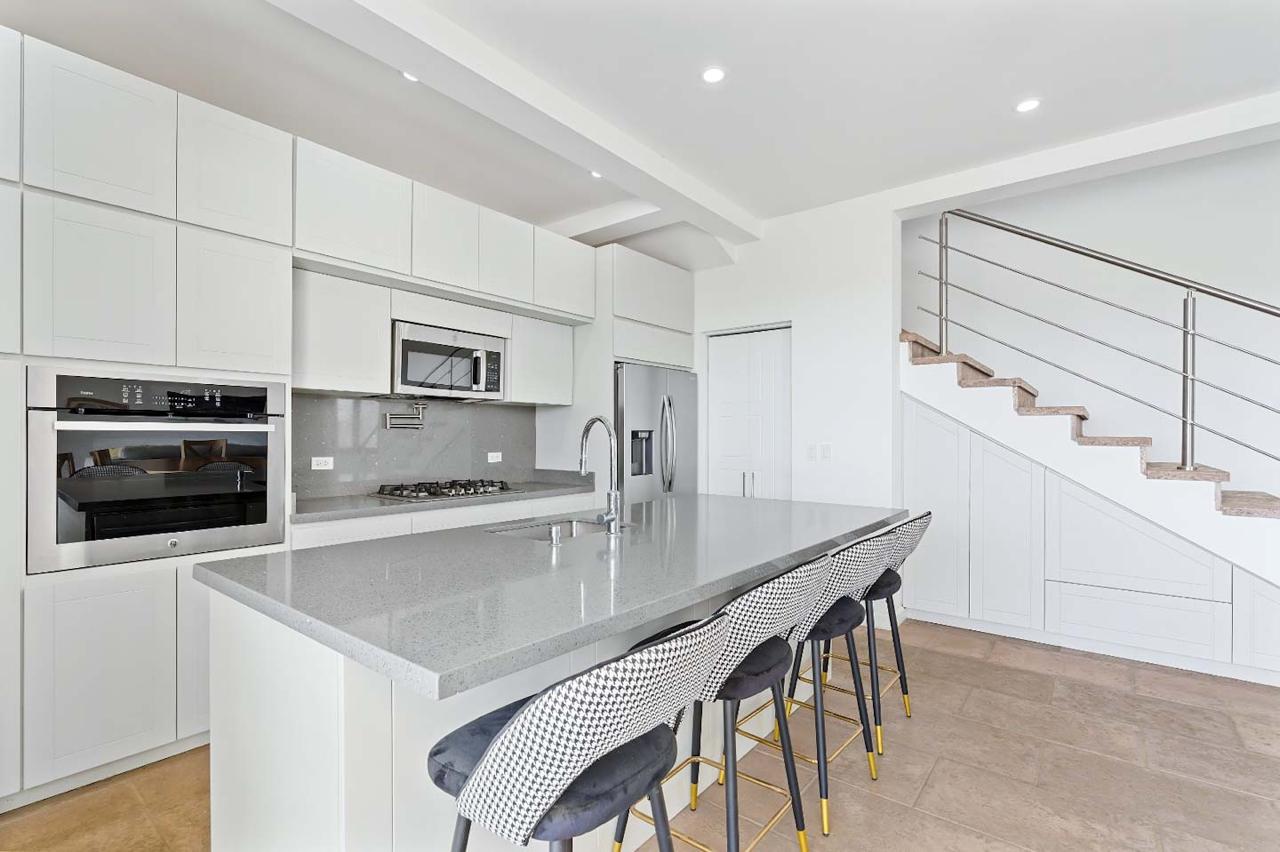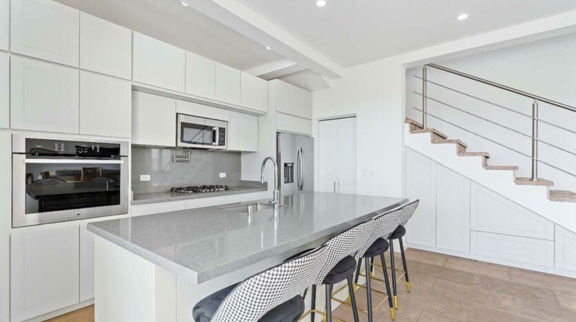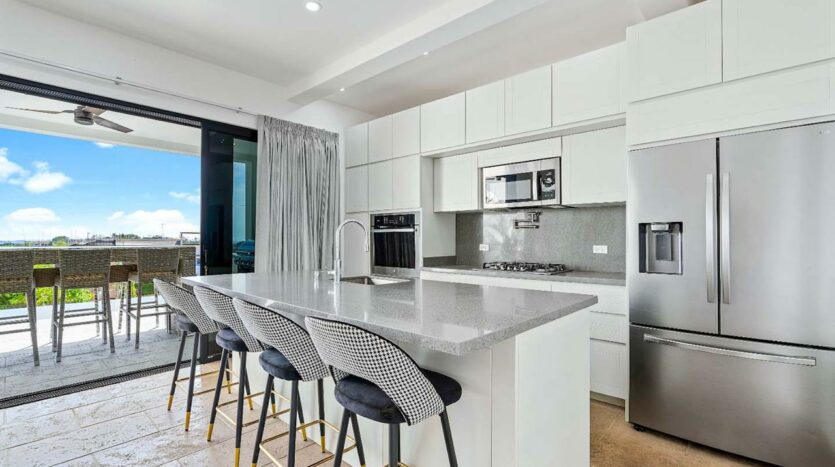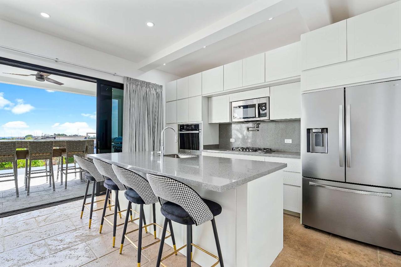 La cocina, diseñada para chefs, cuenta con electrodomésticos de acero inoxidable de alta gama, gabinetes personalizados y elegantes encimeras de cuarzo. Una amplia isla con barra desayunadora proporciona espacio adicional de trabajo y asientos. En el exterior, la terraza junto a la piscina ofrece vistas al océano y un entorno perfecto para cenas al aire libre y momentos de relajación.