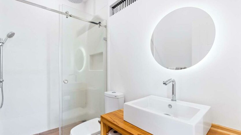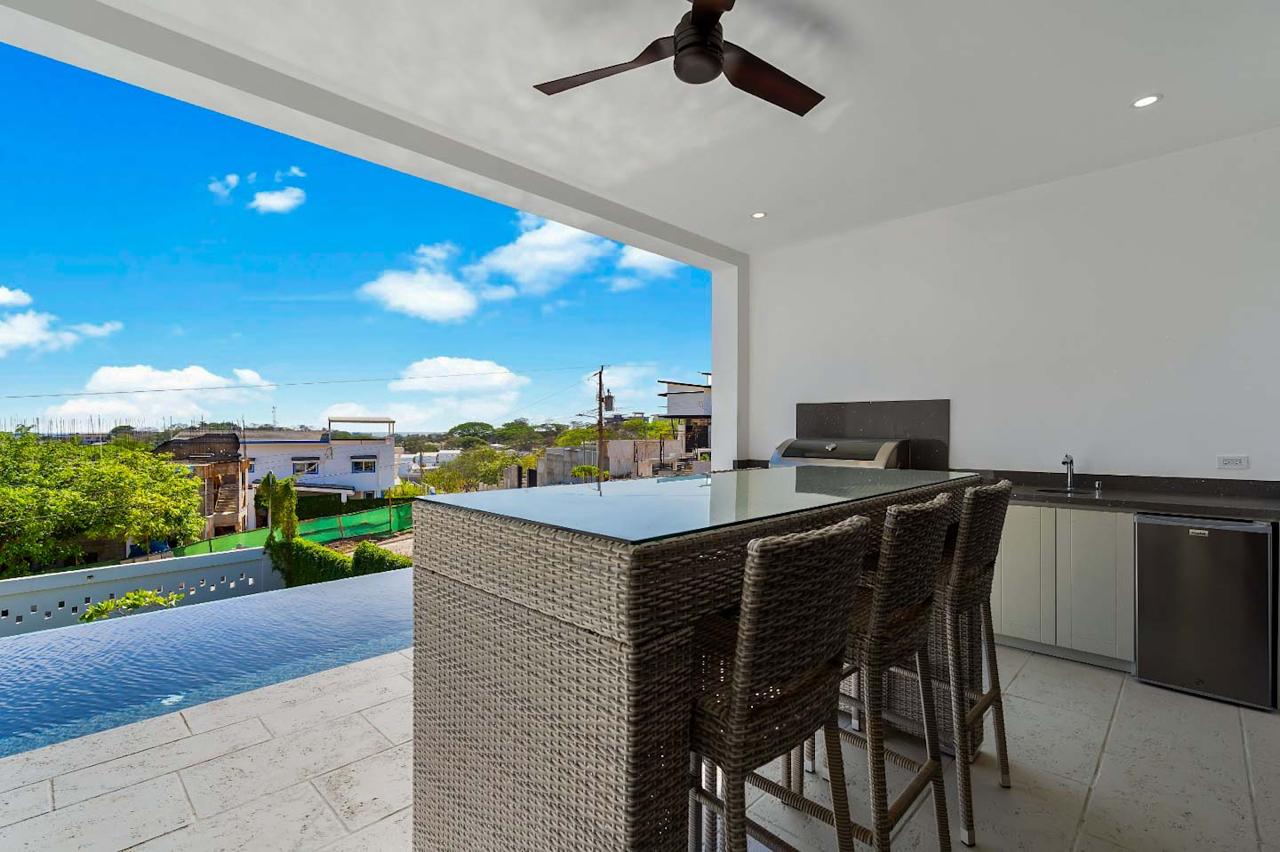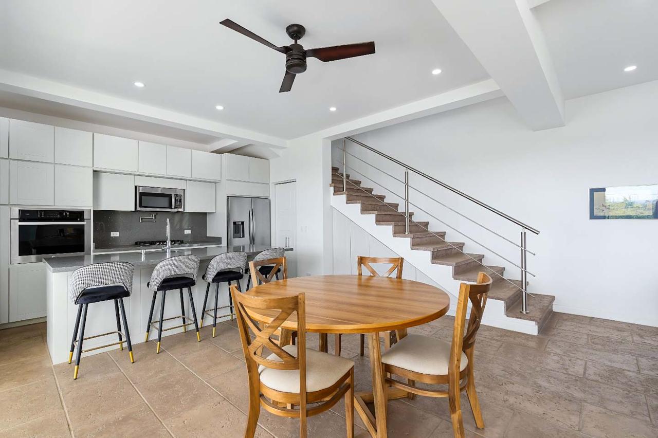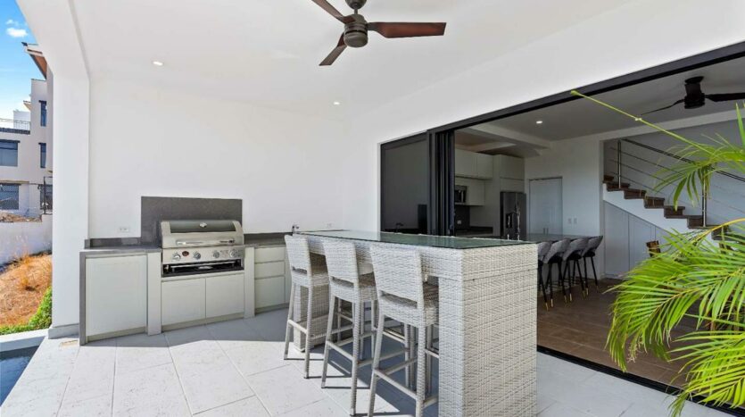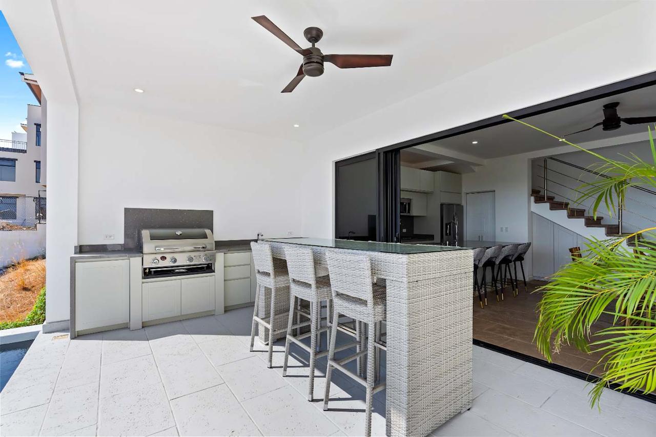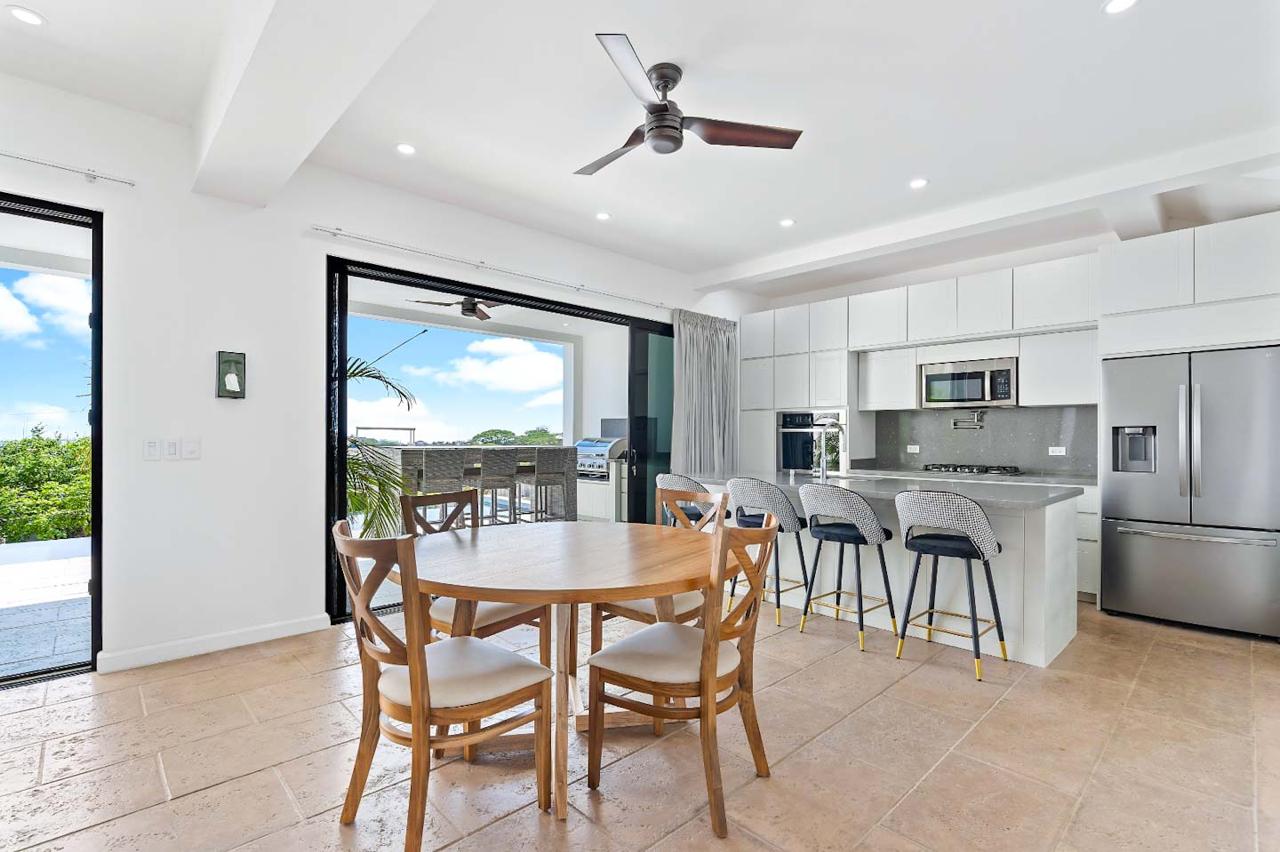 La cocina, diseñada para chefs, cuenta con electrodomésticos de acero inoxidable de alta gama, gabinetes personalizados y elegantes encimeras de cuarzo. Una amplia isla con barra desayunadora proporciona espacio adicional de trabajo y asientos. En el exterior, la terraza junto a la piscina ofrece vistas al océano y un entorno perfecto para cenas al aire libre y momentos de relajación.