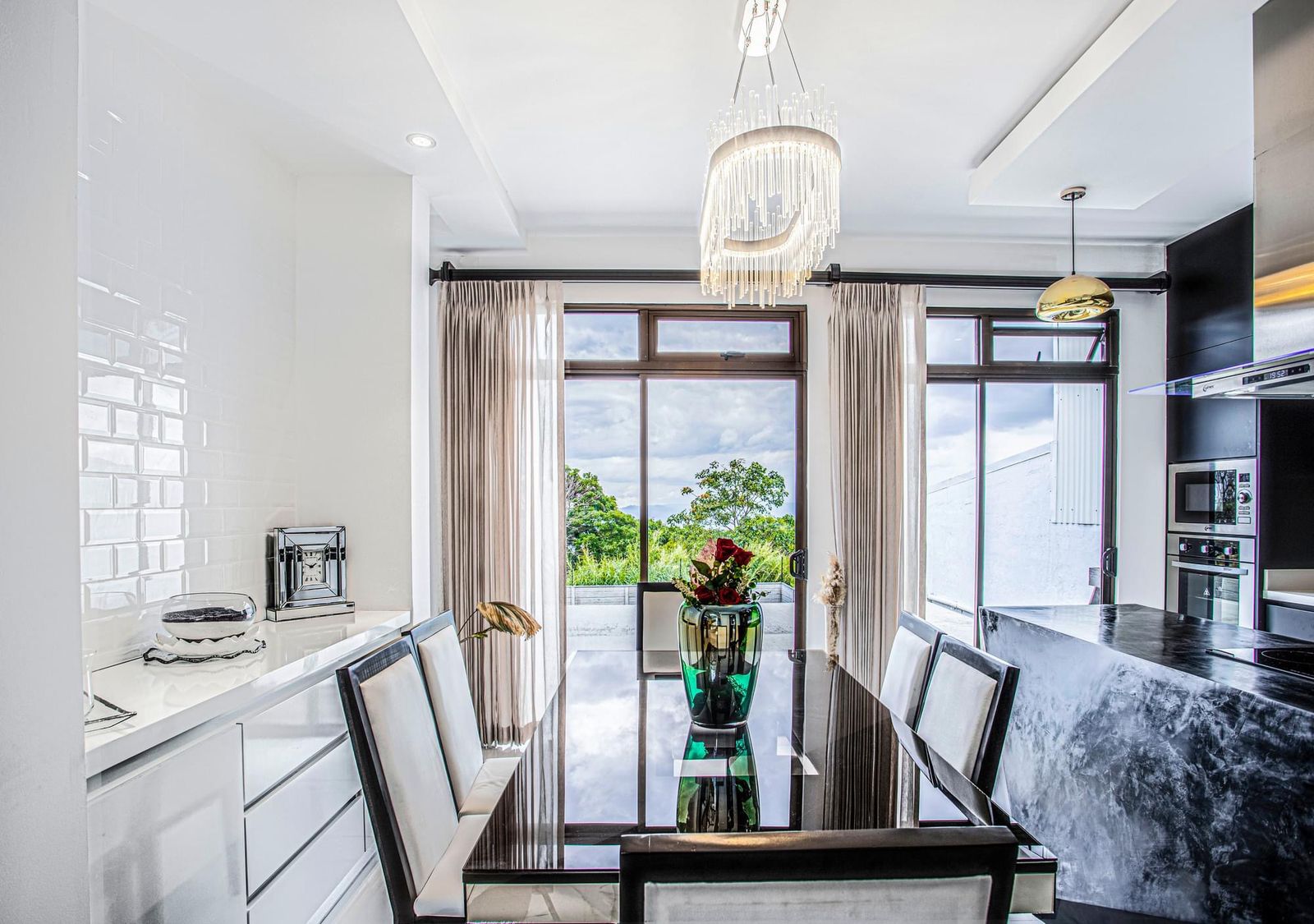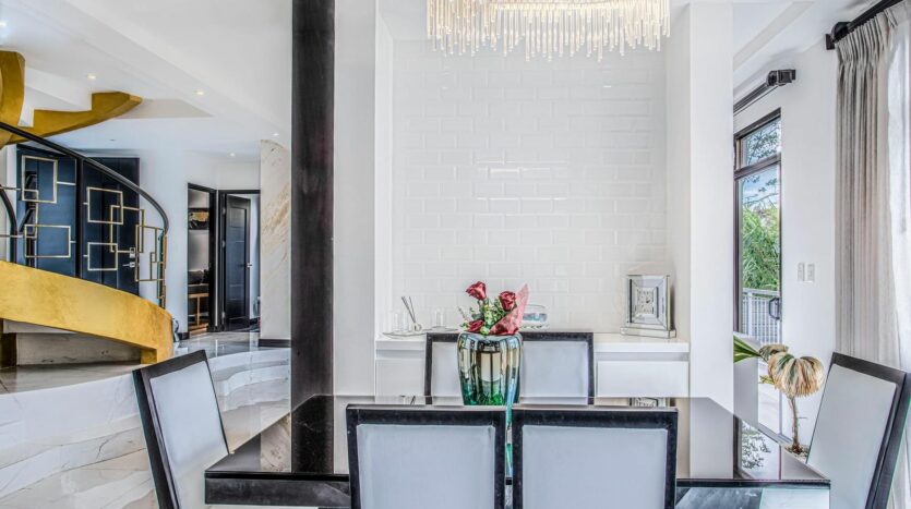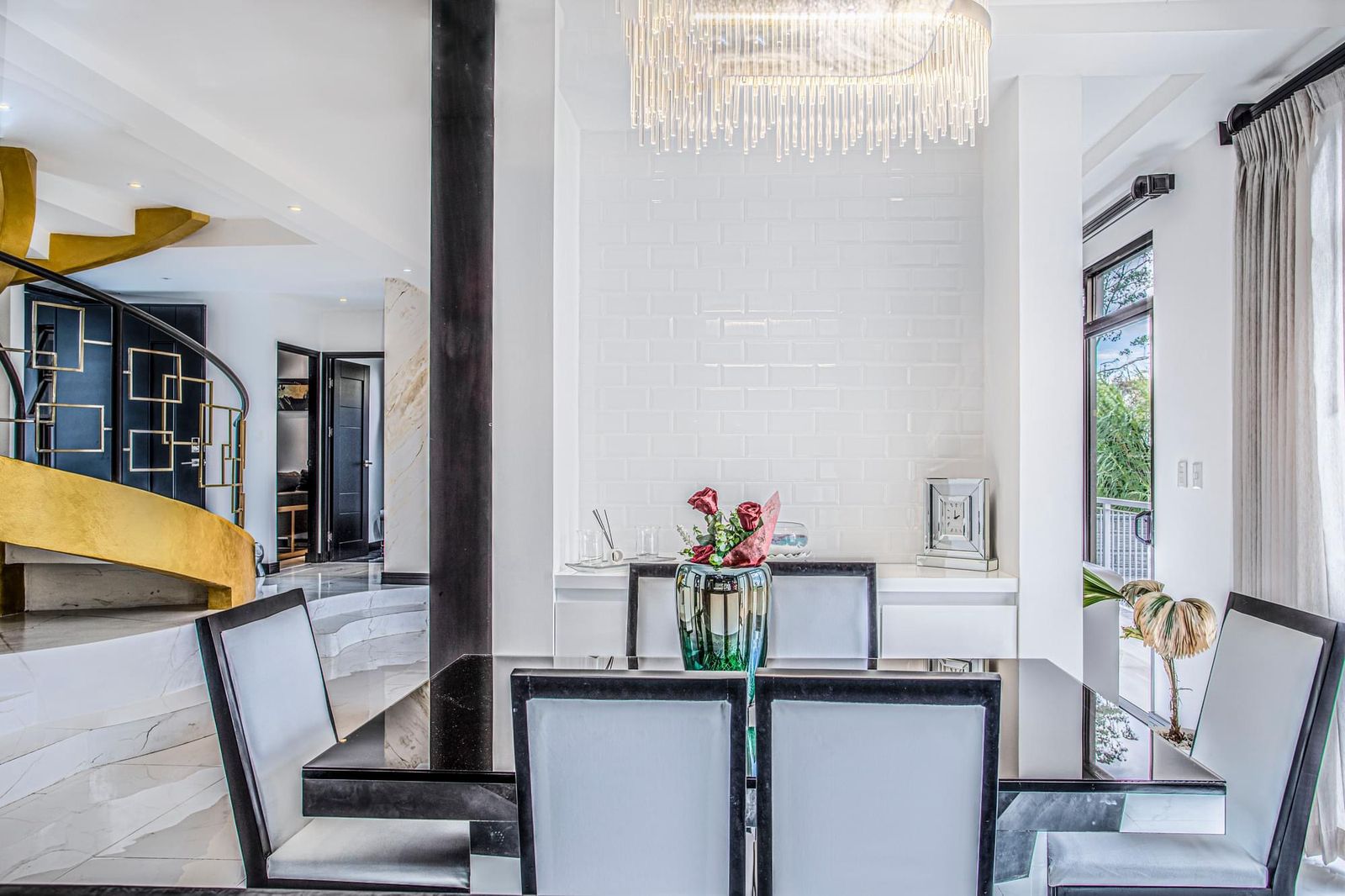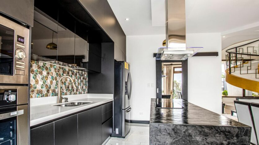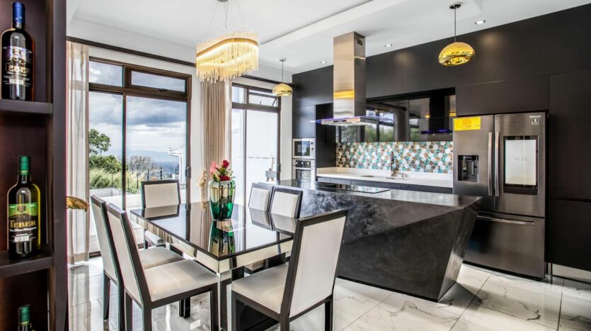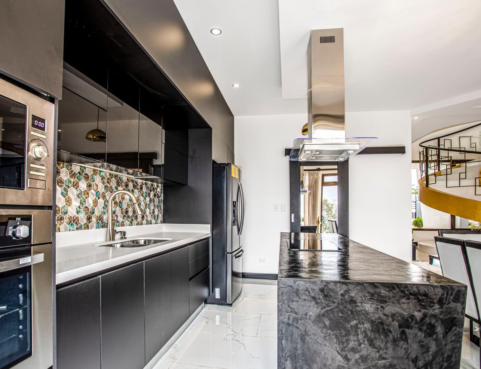 Cocina de ensueño con sobre de cuarzo, desayunador de lujo y electrodomésticos empotrados incluidos.