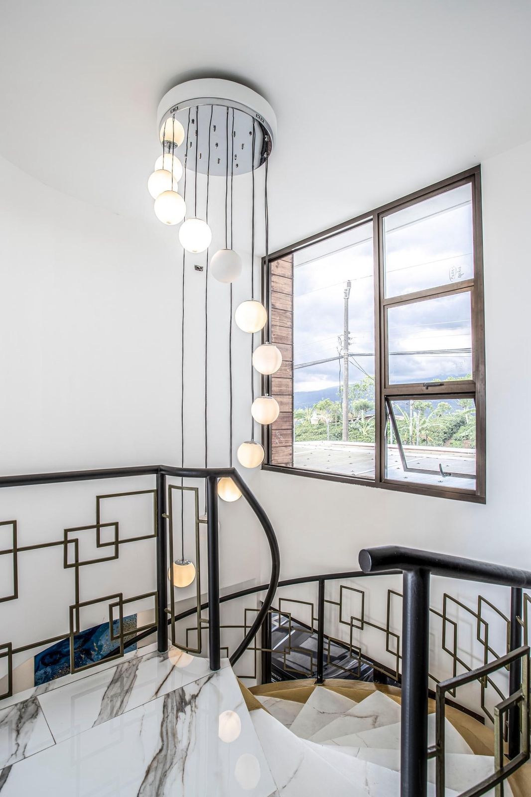 Lámparas y cielorrasos de lujo con diseño y detalles en paredes y gradas pintados a mano.