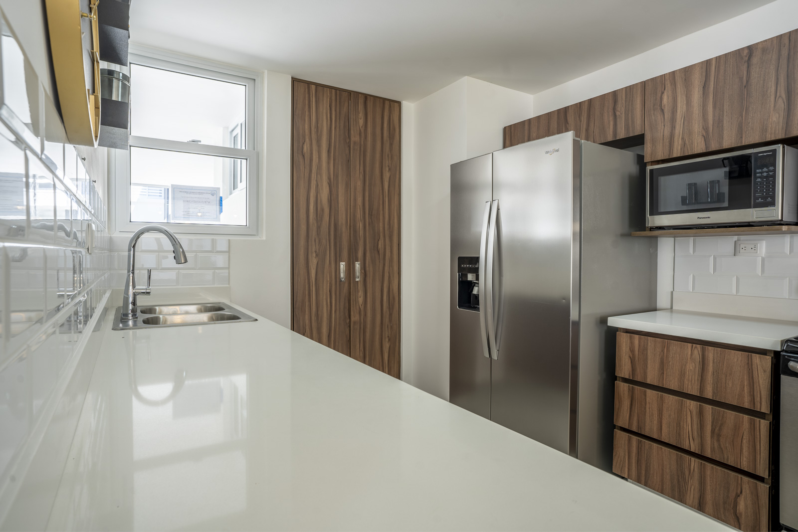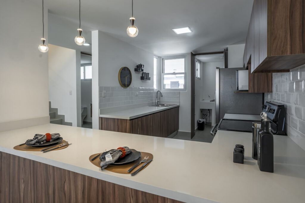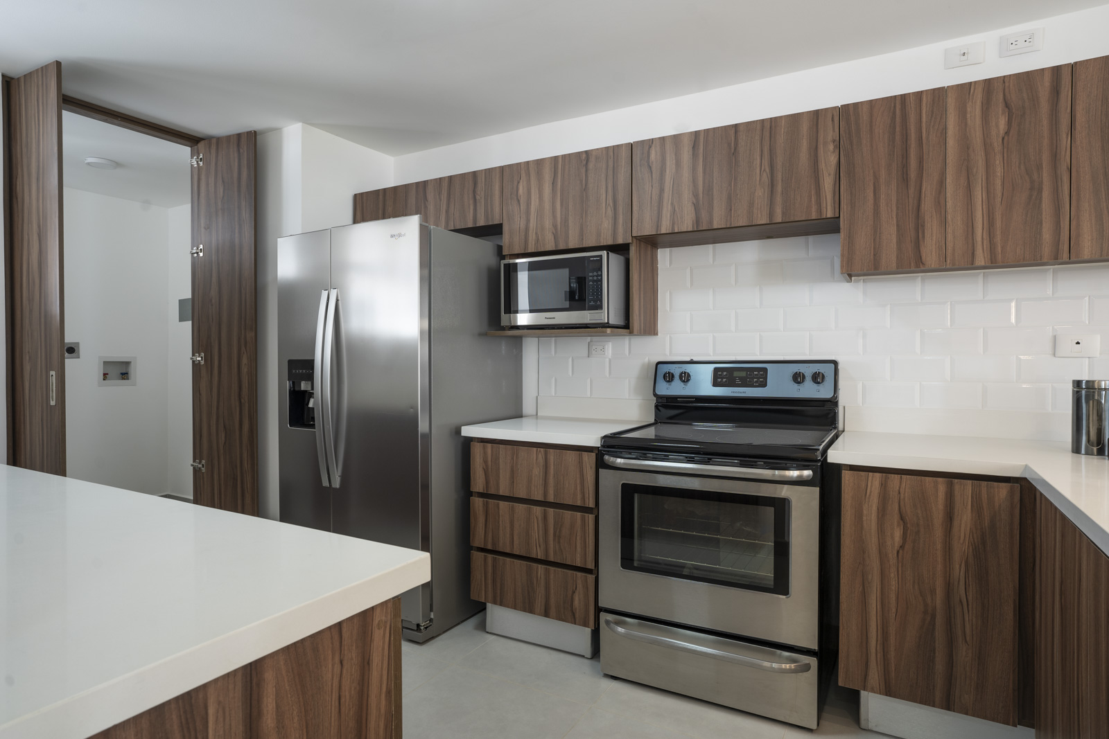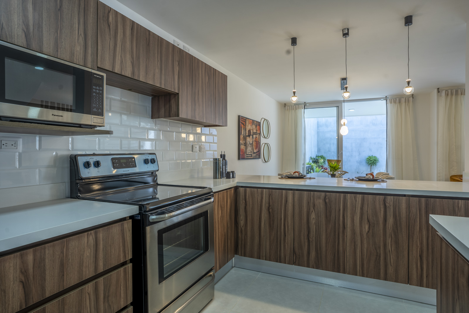 La cocina cuenta con un generoso espacio para preparar y disfrutar los alimentos, adicionalmente puede elegir entre distintos acabados para que sus muebles combinen con sus amplios sobres.
