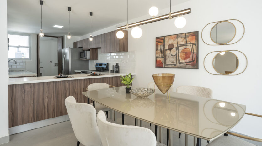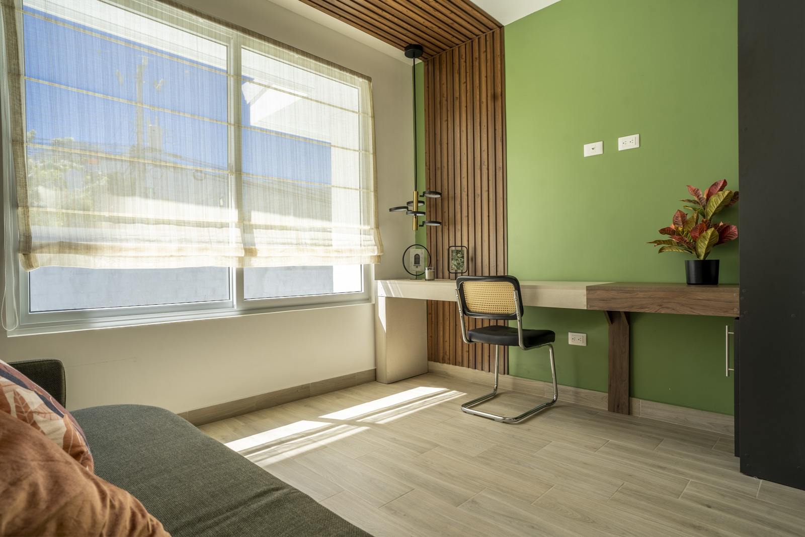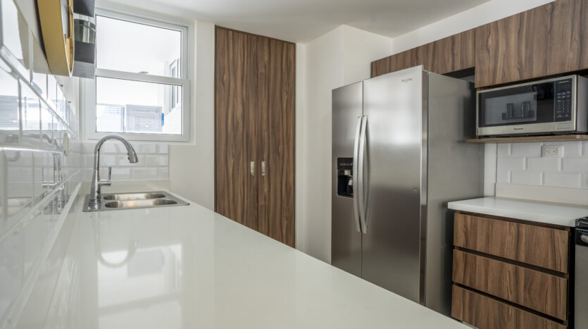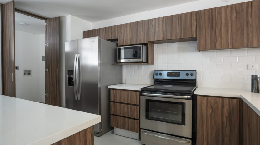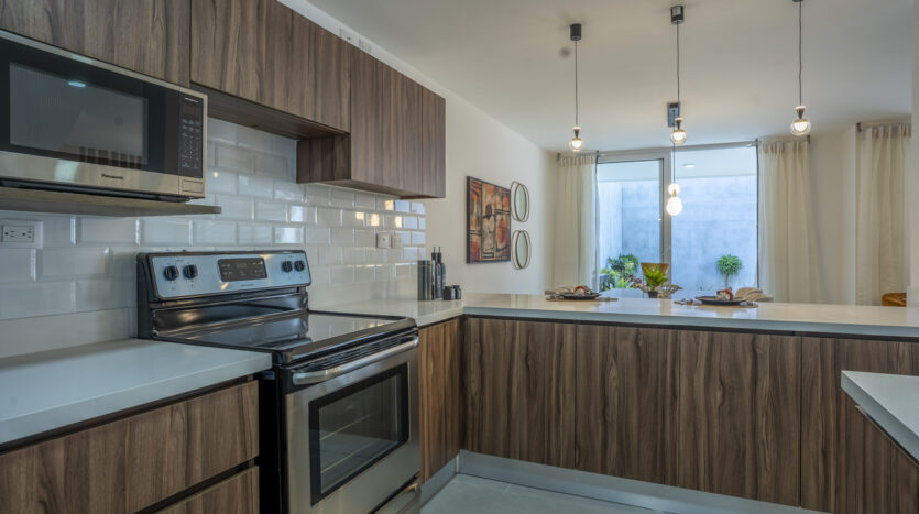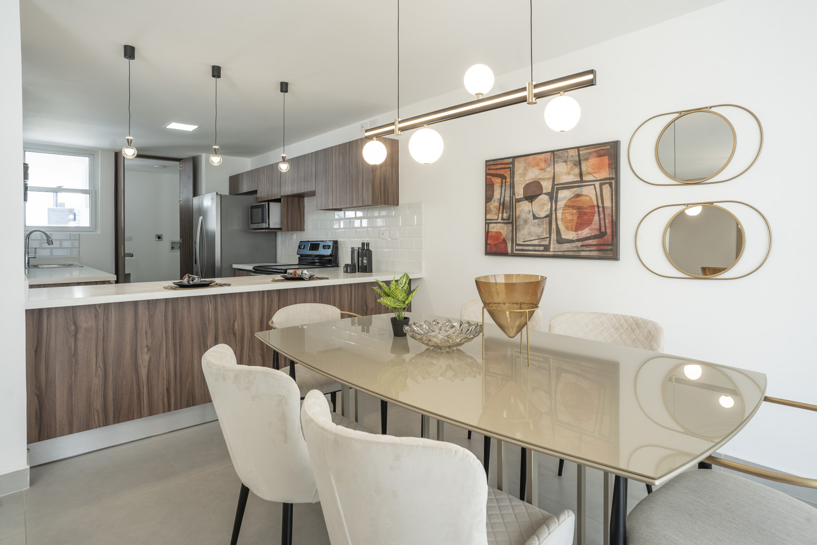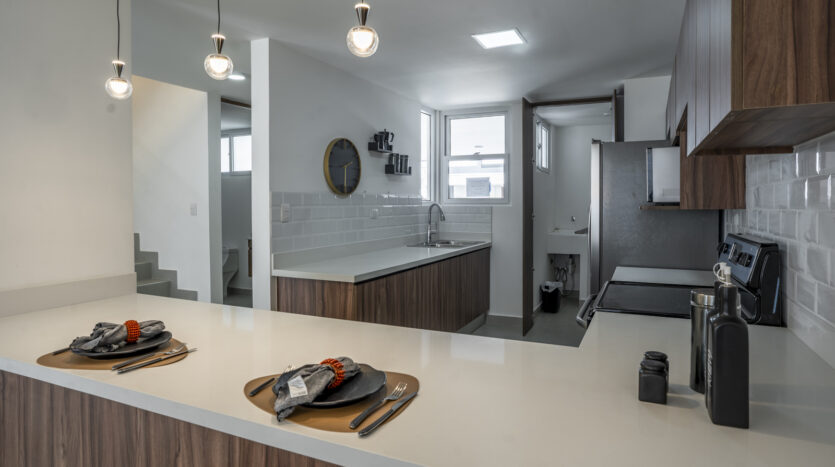 La cocina cuenta con un generoso espacio para preparar y disfrutar los alimentos, adicionalmente puede elegir entre distintos acabados para que sus muebles combinen con sus amplios sobres.