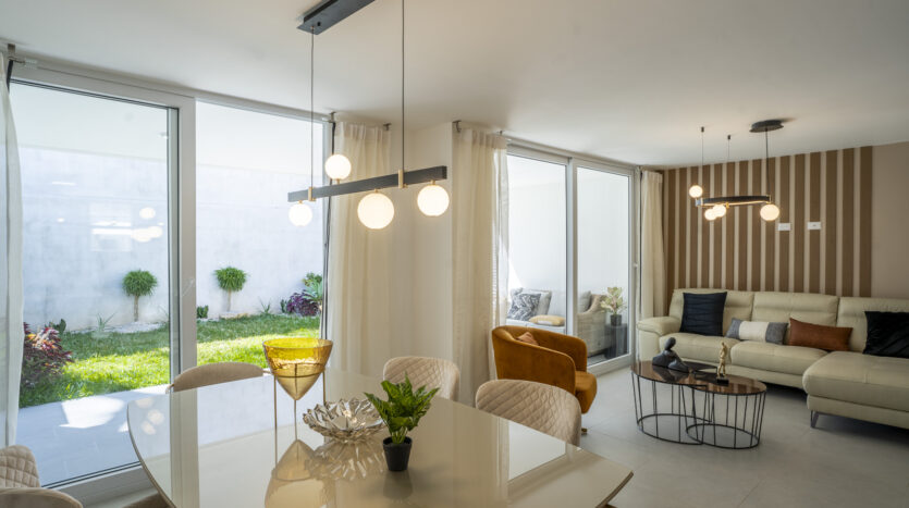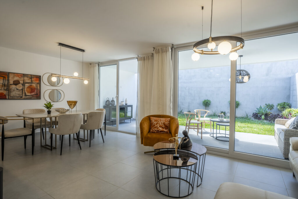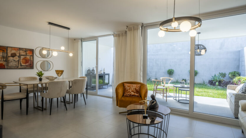 Su sala y comedor conectan a la terraza y jardín por medio de puertas de vidrio, lo que le da amplitud a sus espacios y facilita el disfrute de su tiempo de calidad en cada cena o en cada parrillada, con un área verde de ensueño para sus hijos y mascotas 👦🏻👧🏽🐶⚽️