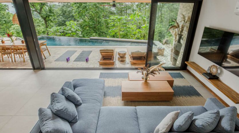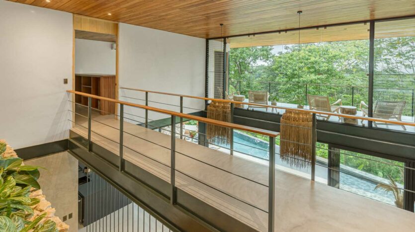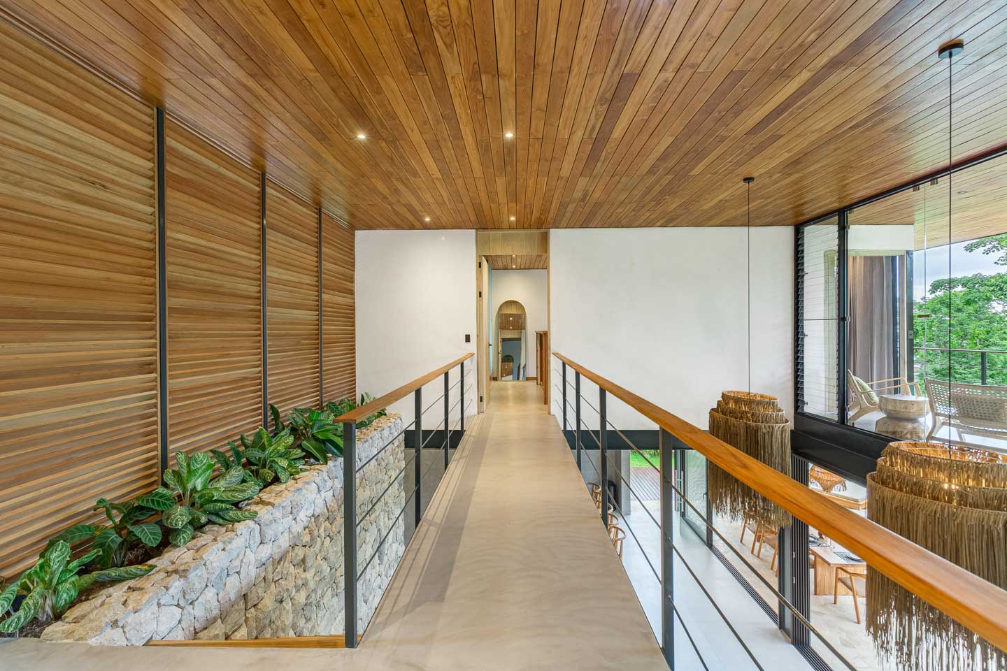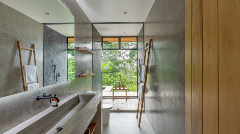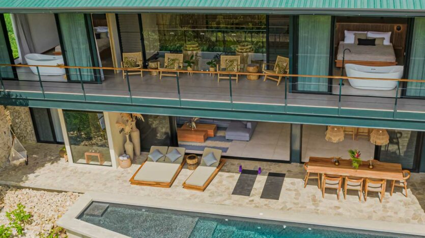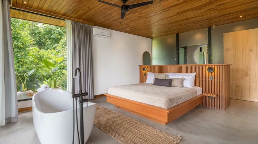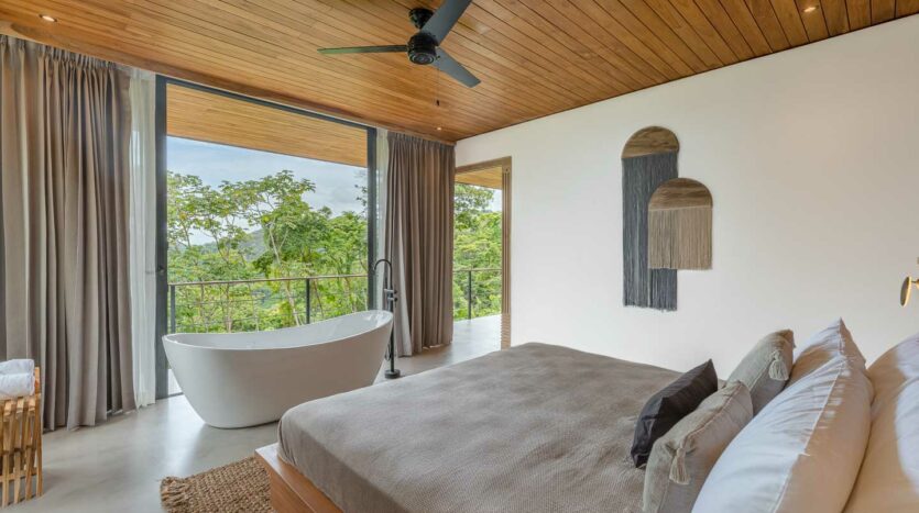 - Dormitorio principal en el nivel inferior con vistas a la piscina y al dosel de la jungla.