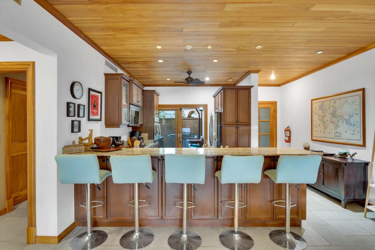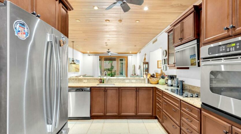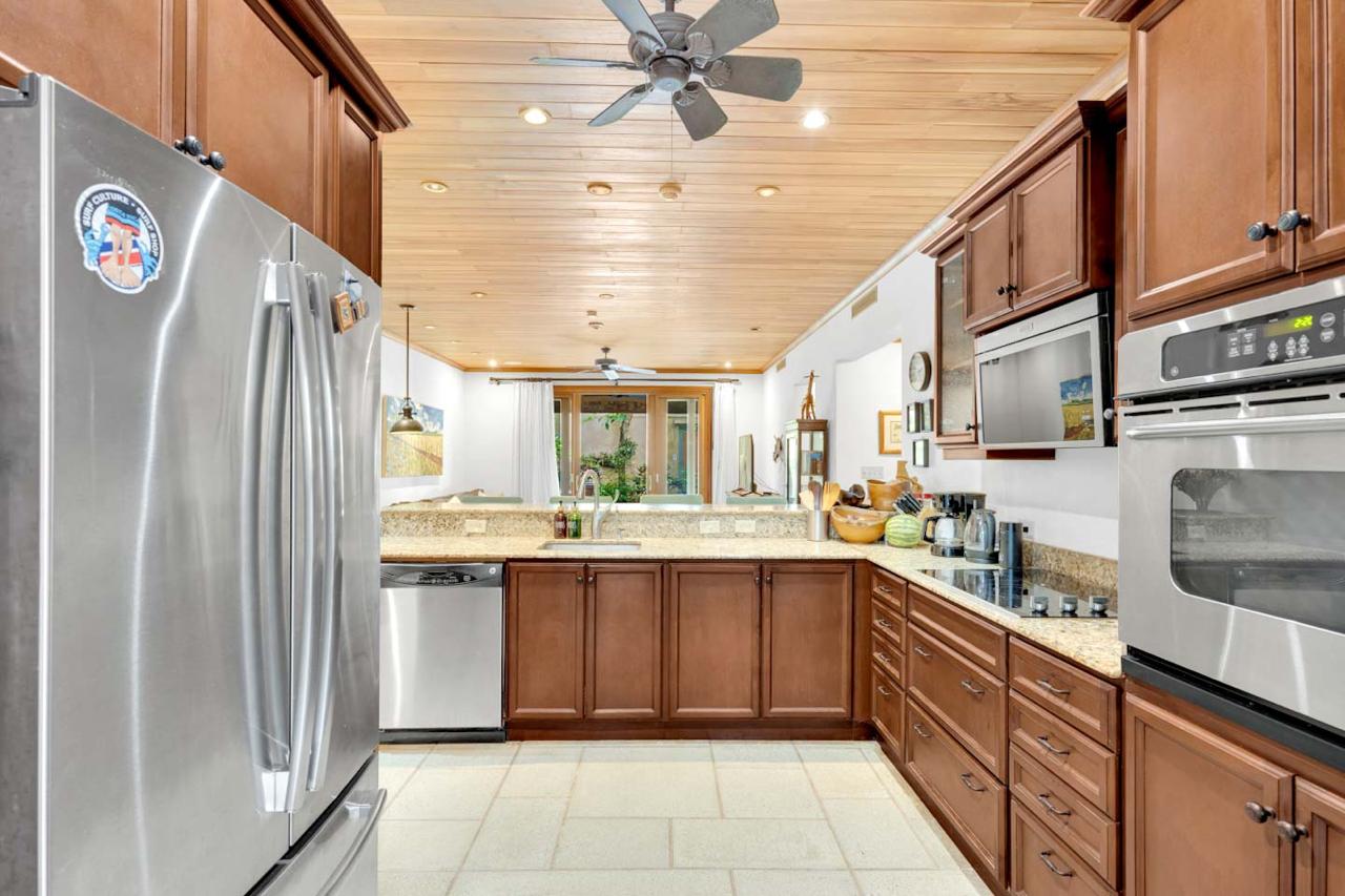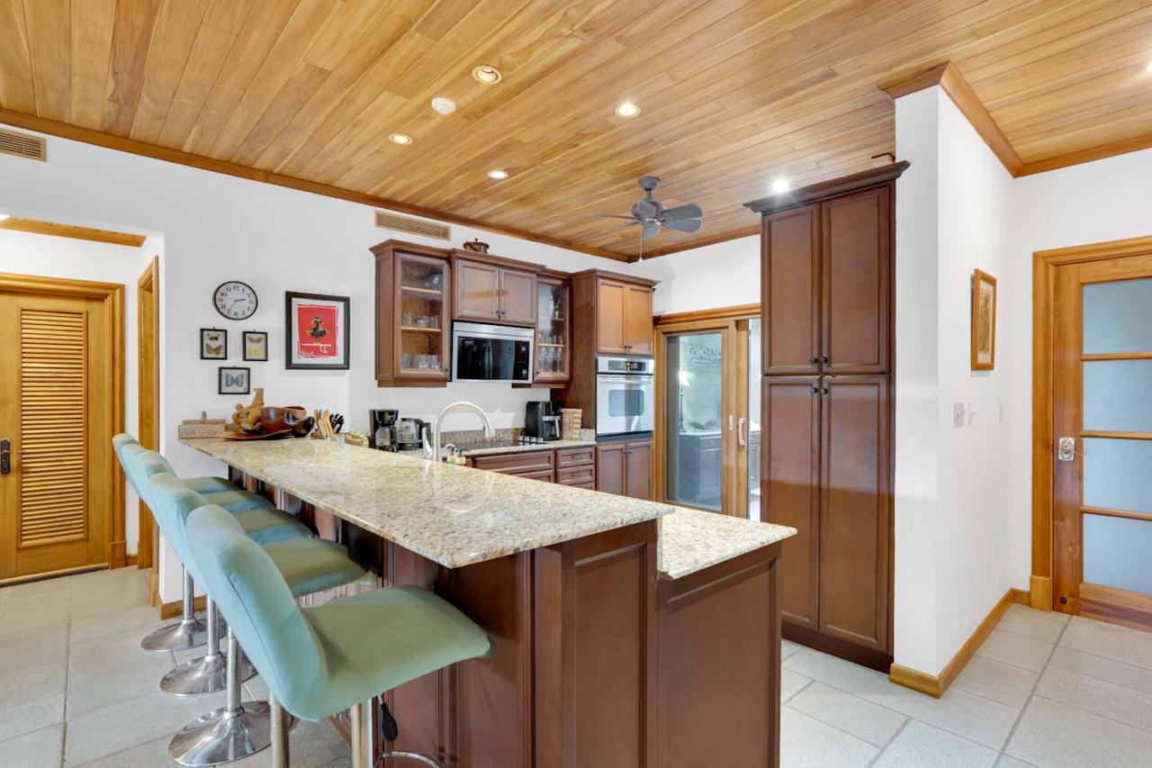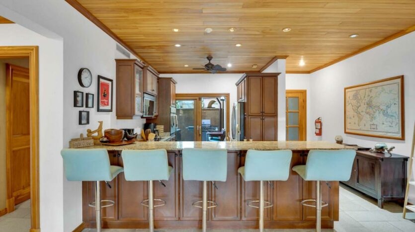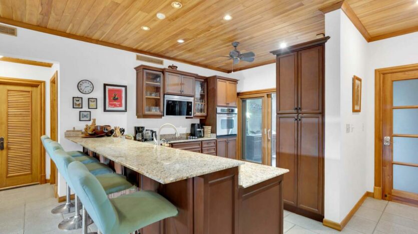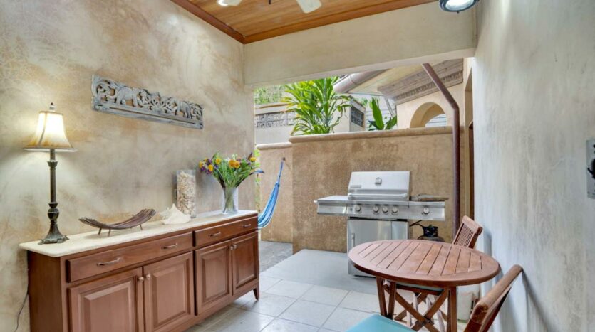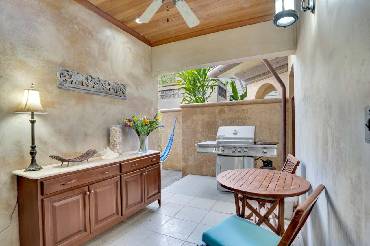 The kitchen is a masterpiece of design and functionality, featuring custom hardwood cabinetry, stainless steel appliances, and extended granite countertops with a breakfast bar that comfortably seats five. The rear patio, accessible from the kitchen, is an ideal space for outdoor dining and grilling, complete with a gas grill, a table for two, and a hardwood cabinet with a granite top for food preparation. Adjacent to this area is a private garden equipped with hammock hooks, perfect for unwinding in serene surroundings. This patio also connects to the guest bedroom through sliding glass doors.
