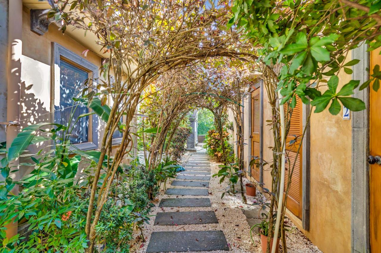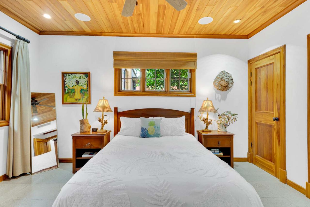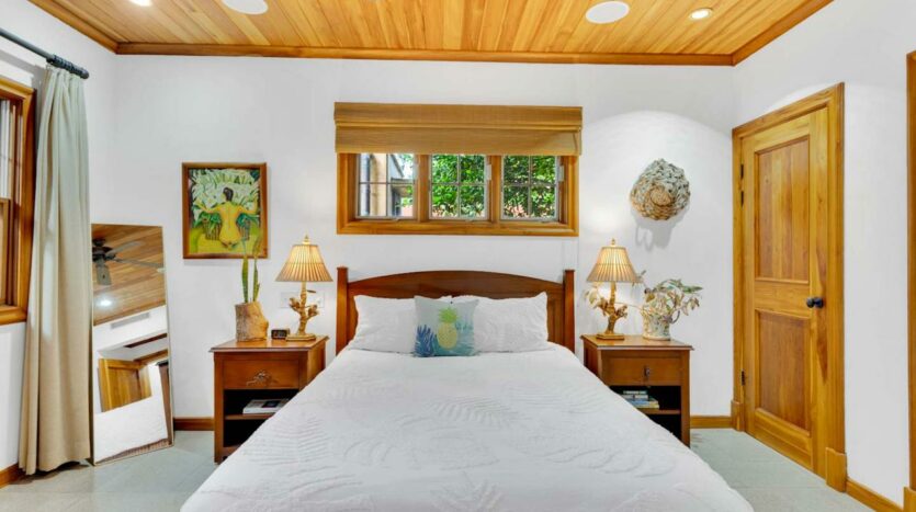 The guest bedroom, also filled with natural light, opens to the private back garden. Currently set up with two queen beds to maximize rental income, it includes a built-in closet and access to a unique indoor/outdoor garden bathroom with a shower and linen storage.
