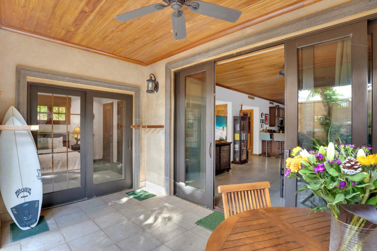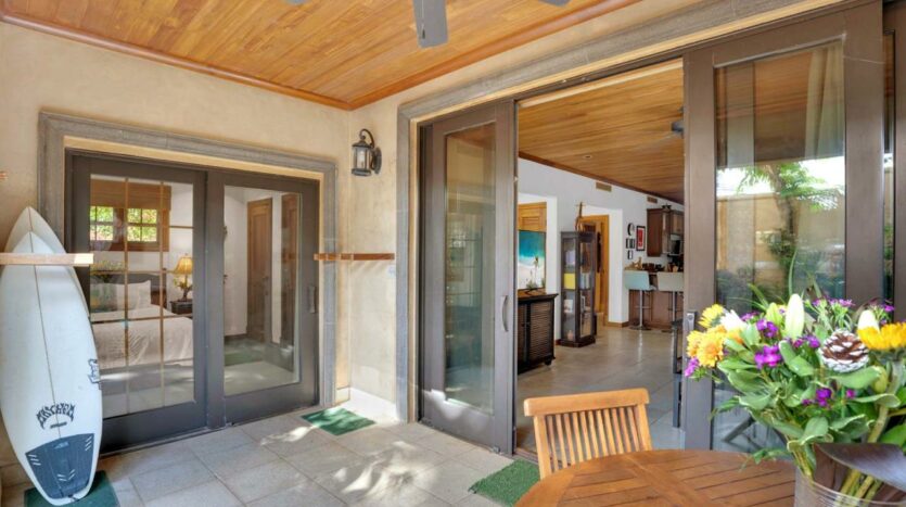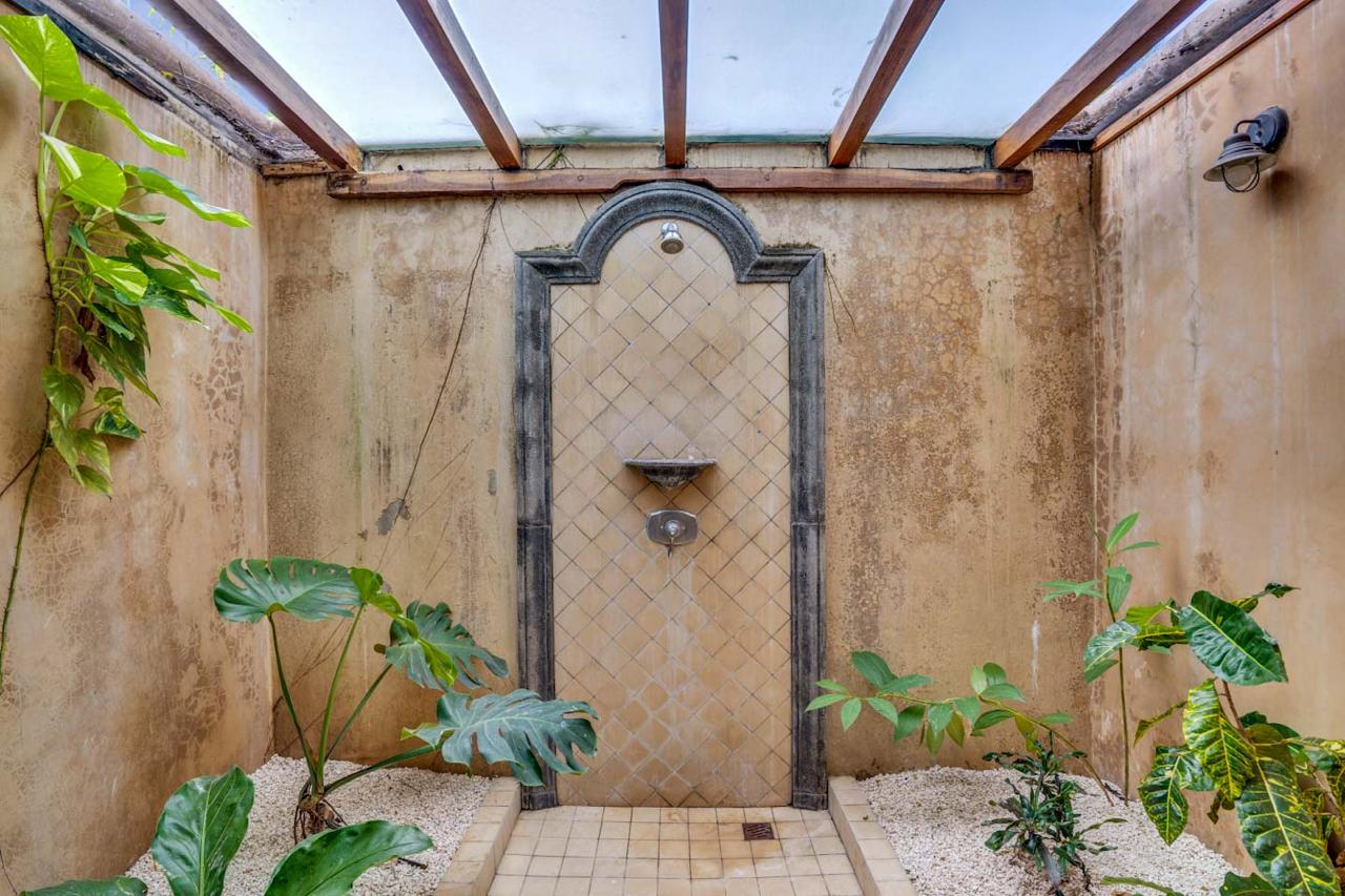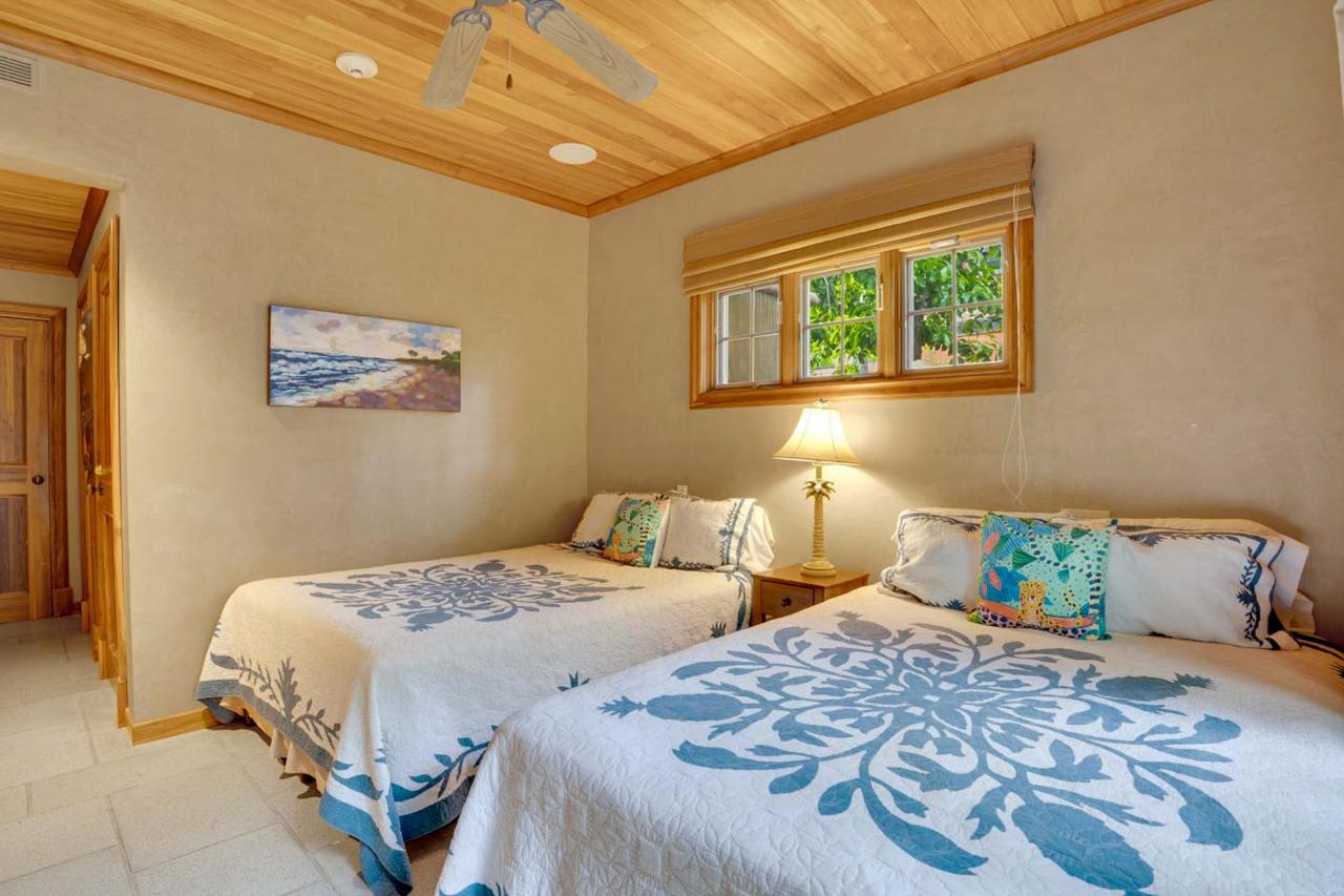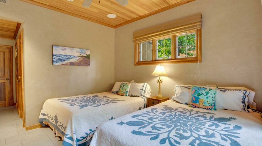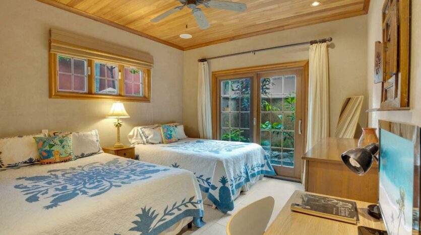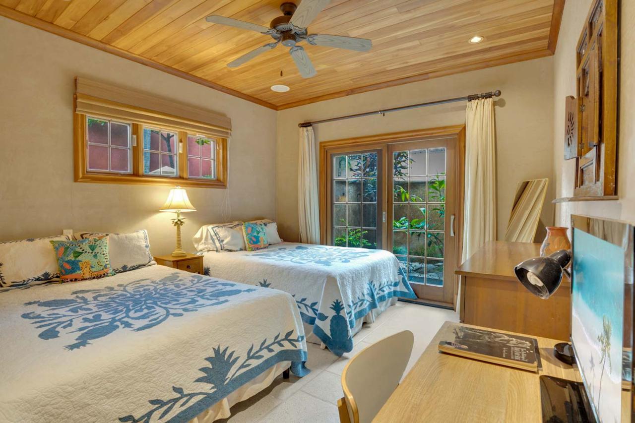 El dormitorio de invitados, con acceso al jardín privado, está preparado para maximizar los ingresos de alquiler, con dos camas tamaño queen, armario empotrado y un baño privado estilo indoor/outdoor, con ducha y espacio para almacenar ropa de cama.