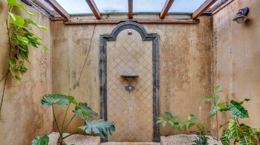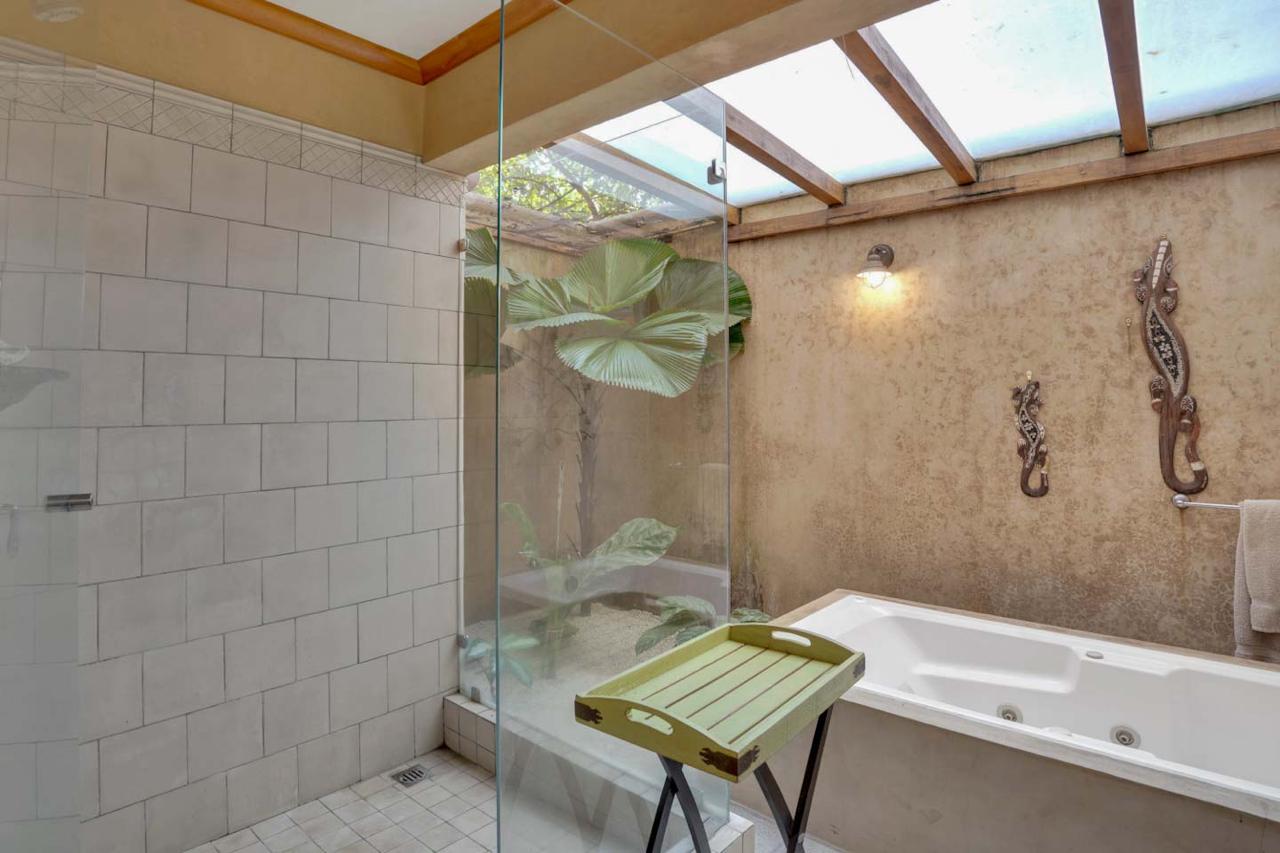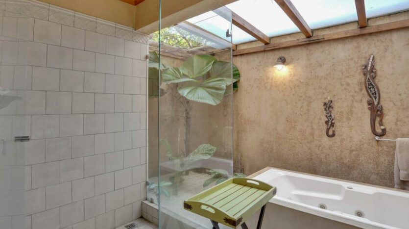 Both bathrooms are spacious and seamlessly blend indoor and outdoor elements, creating a tropical ambiance. The main bathroom features both a bathtub and a large shower.