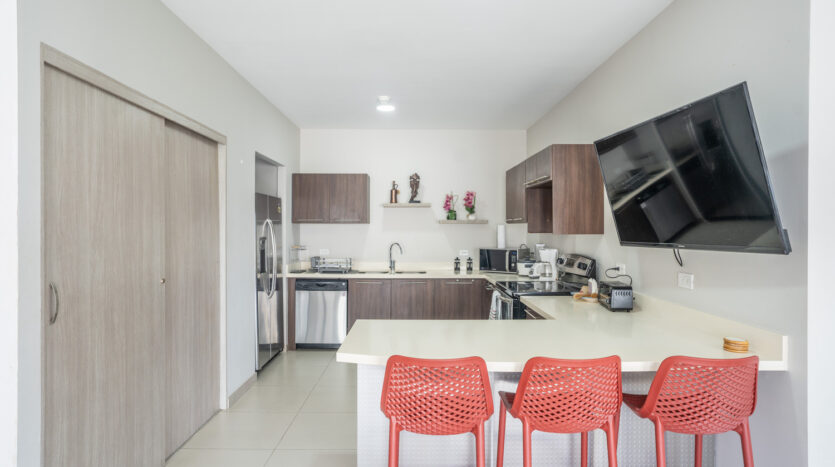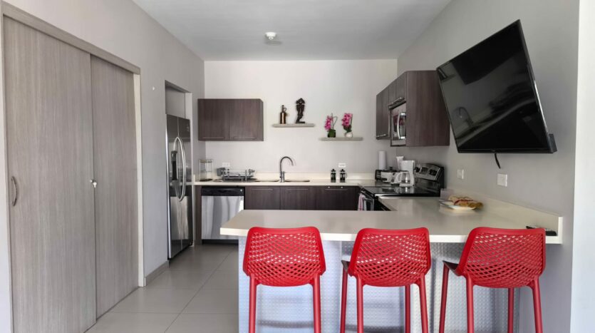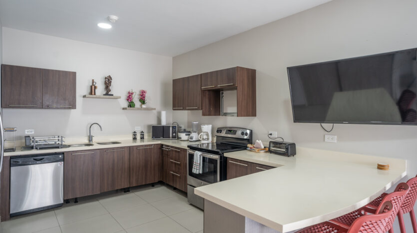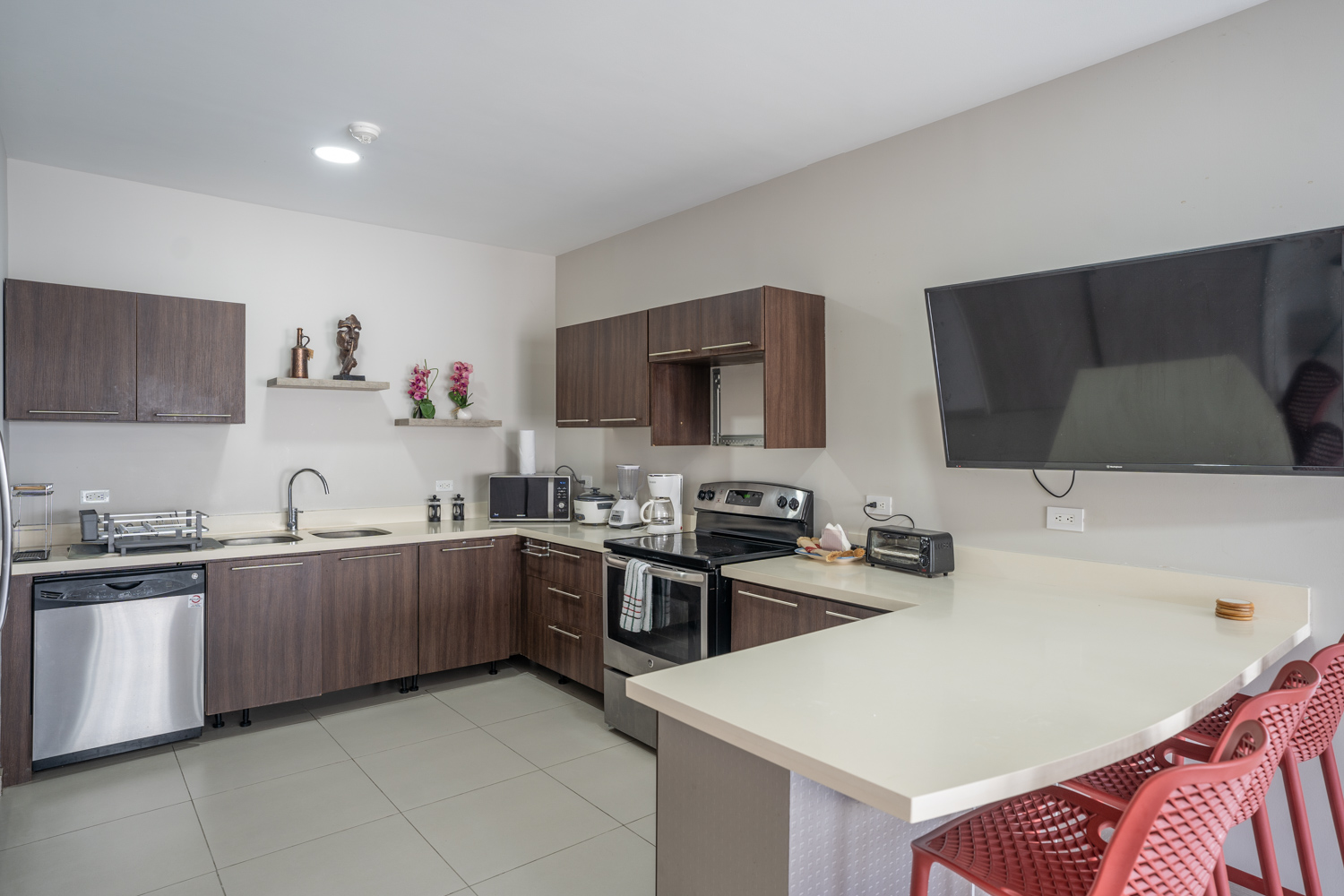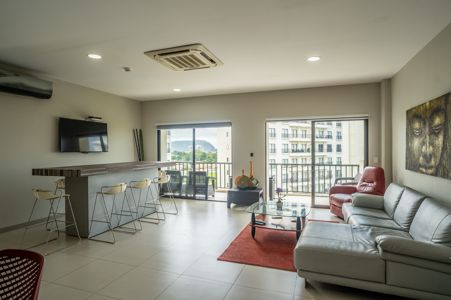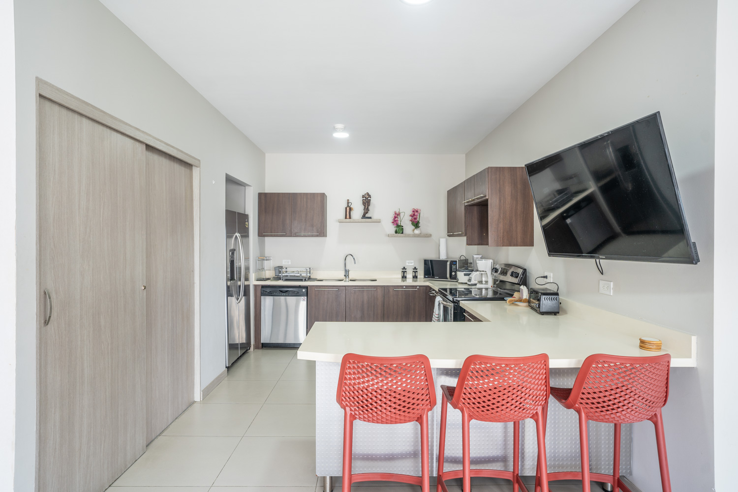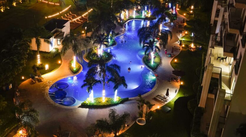 La gran piscina cuenta con zonas poco profundas para niños y jacuzzi para adultos. Hay zonas para pasear a tus mascotas y un parque infantil para los niños. Se encuentra a 1,5 horas del aeropuerto de San José, a 15 minutos de la Marina Los Sueños y a 15 minutos de la excelente playa de surf Playa Hermosa.