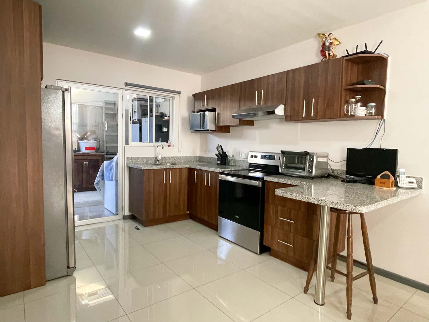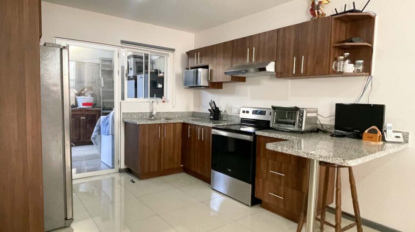 La cocina se encuentra completamente amueblada con muebles en melamina y sobres granito natural.