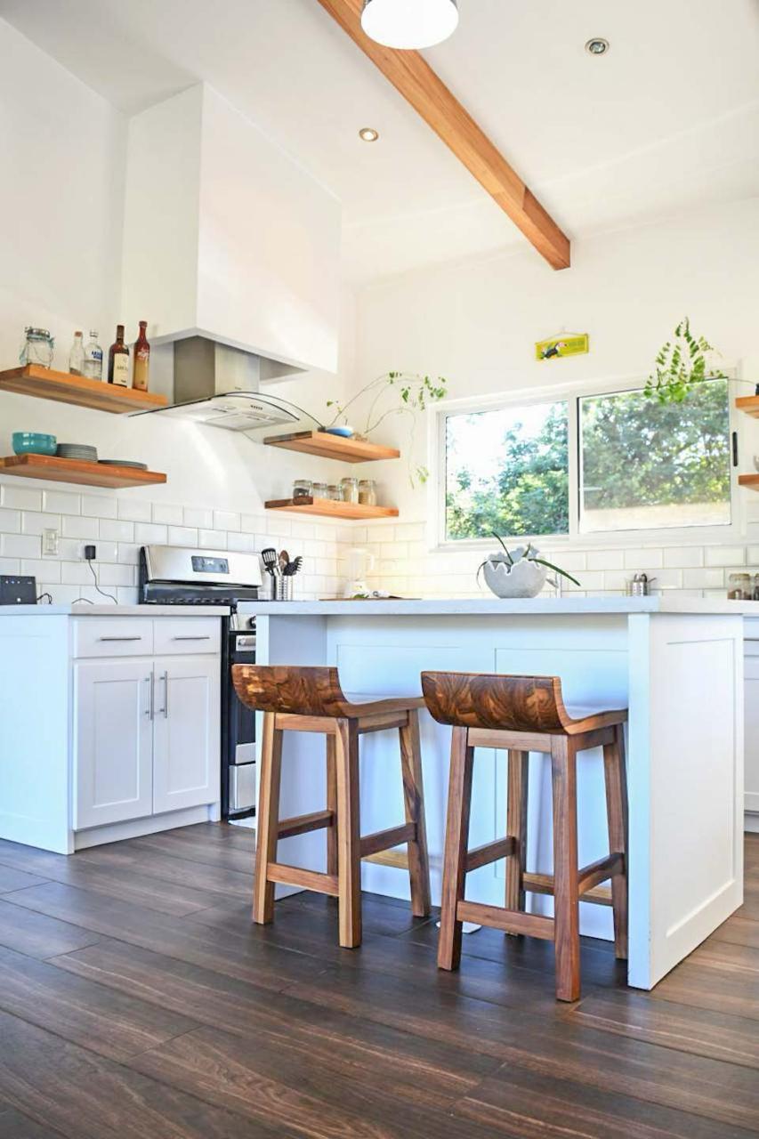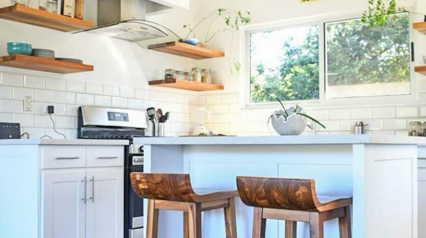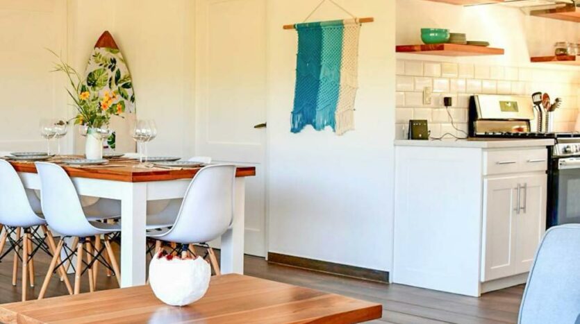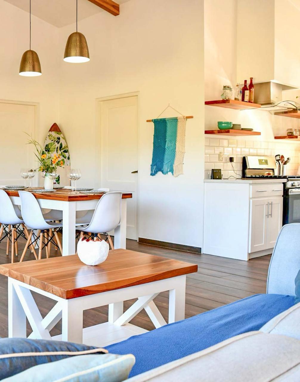 The home is further adorned with artful macrame accent pieces and modern furniture, adding to its beauty.