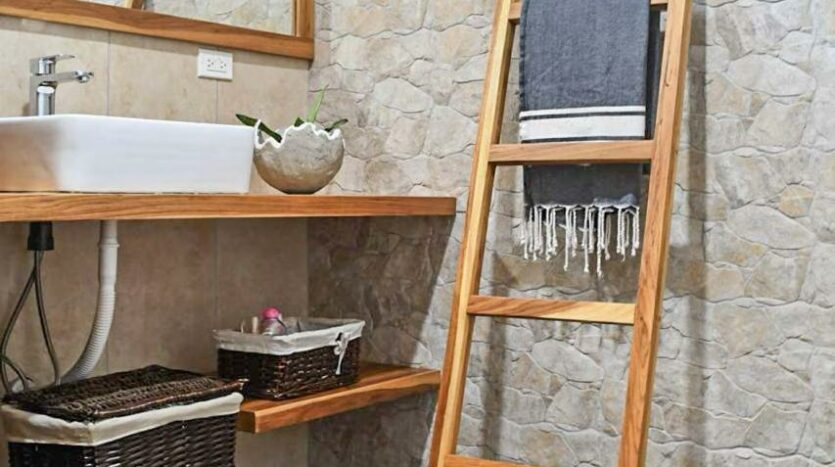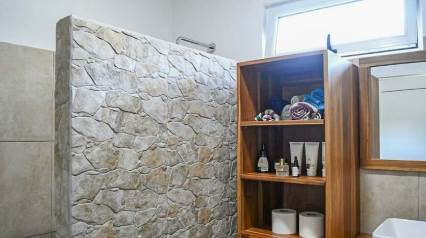 Amplio baño con una gran ducha, elaborada con materiales de lujo como piedra natural y madera que emanan sofisticación y conveniencia.