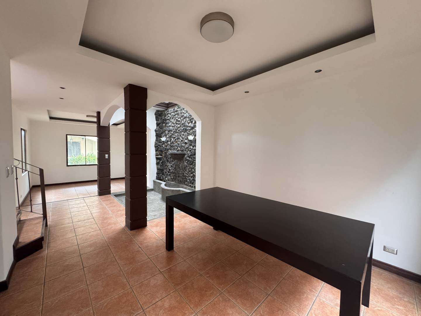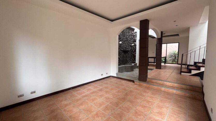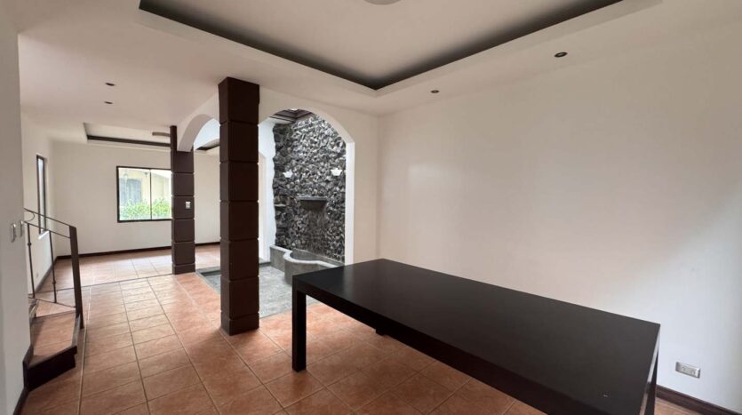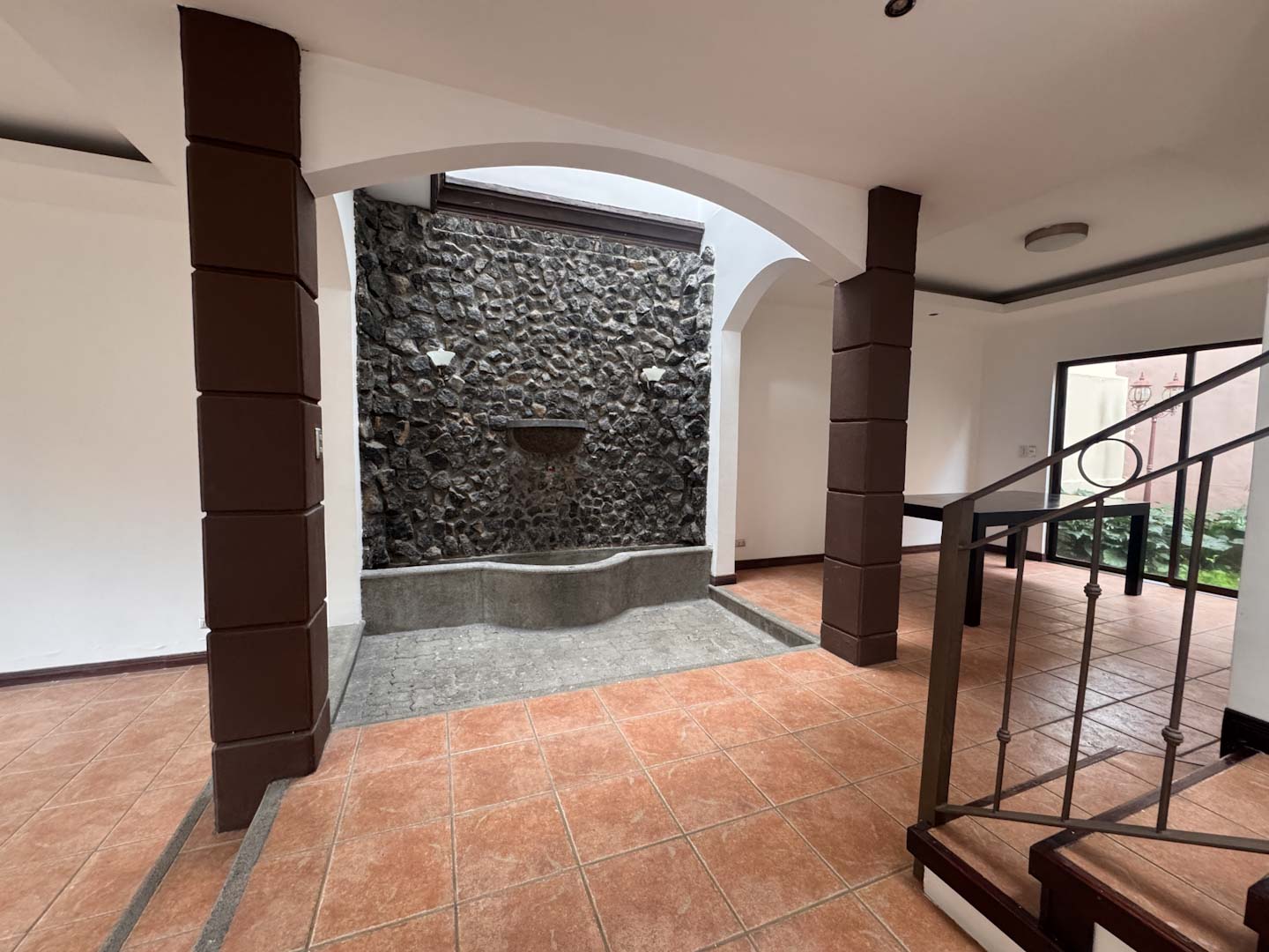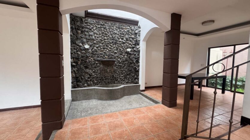 - Espacios sociales acogedores: Sala y comedor independientes, divididos por una fuente decorativa y una pared llorona que brindan un toque de distinción.