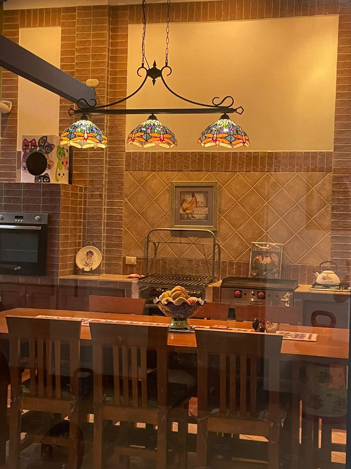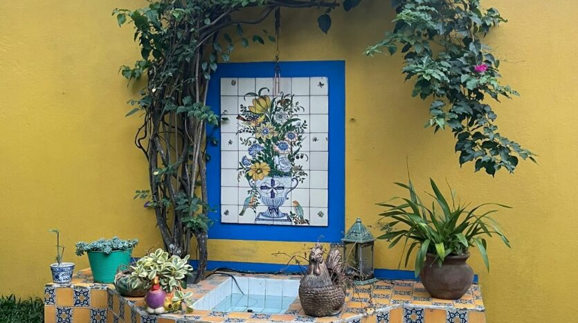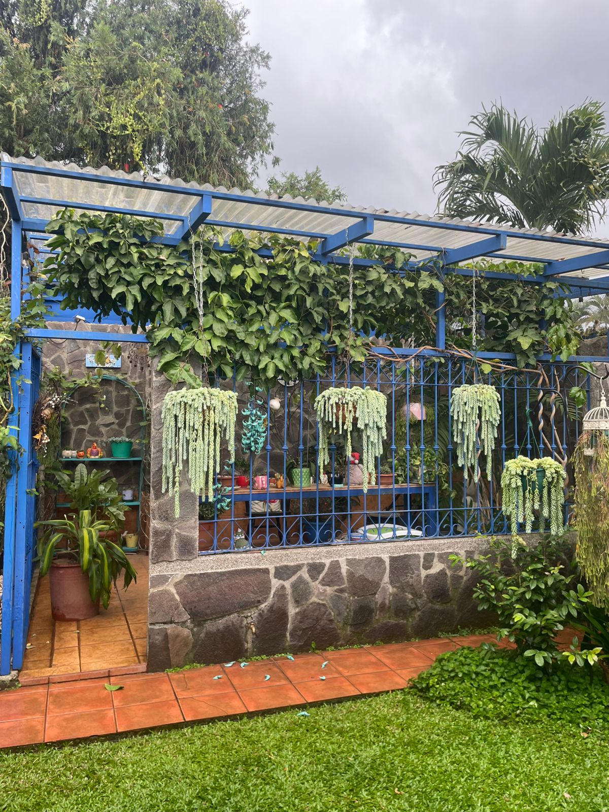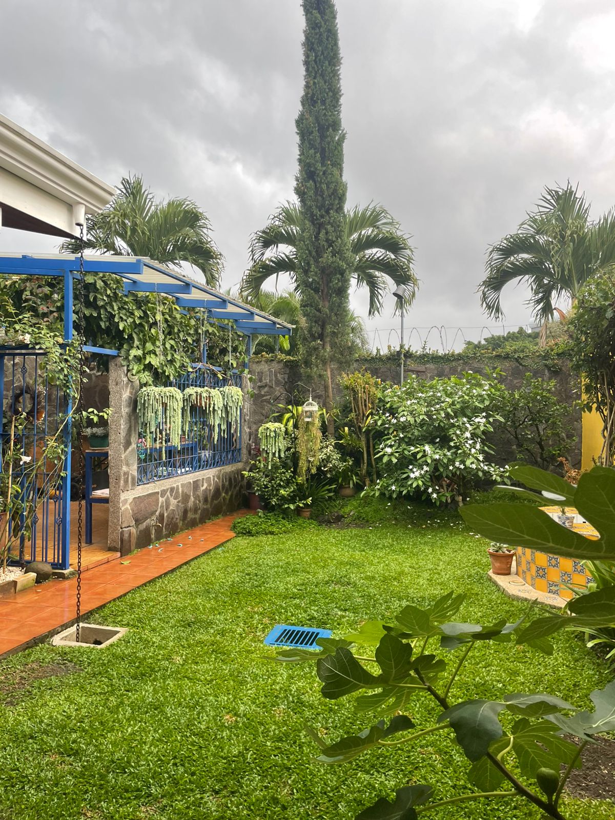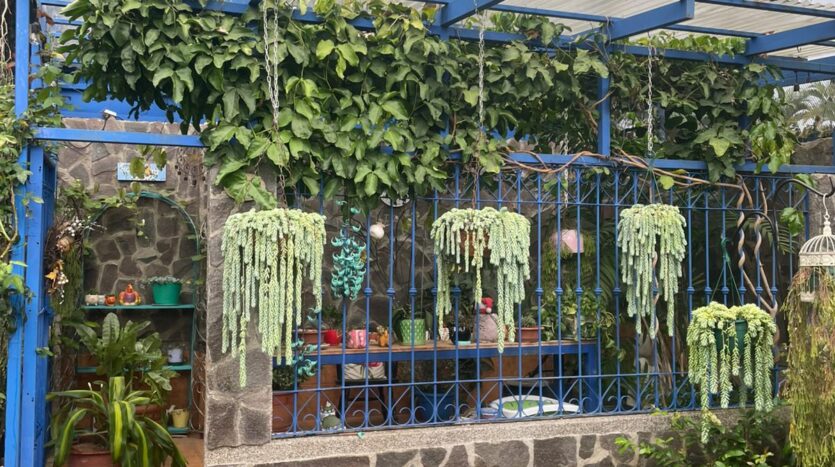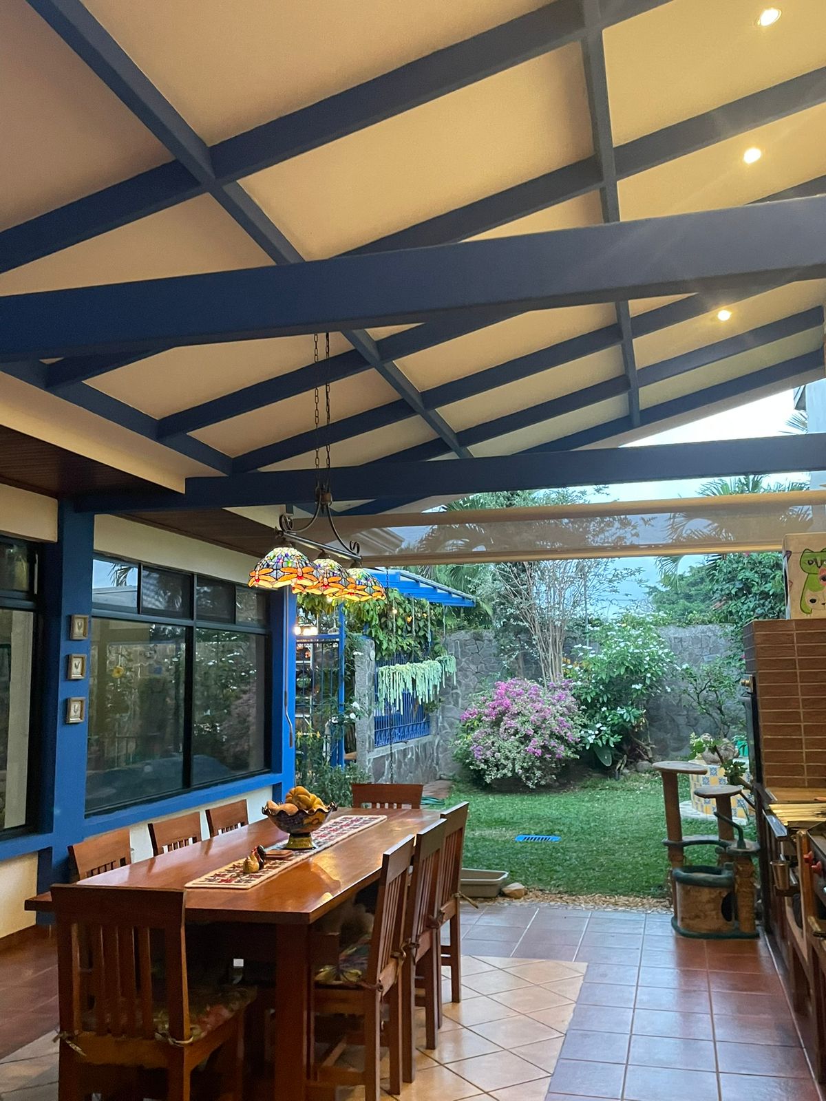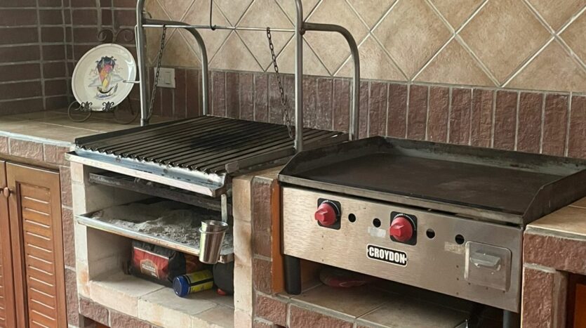 Terraza con parrilla, medio baño y salida al jardín trasero con fuente e invernadero