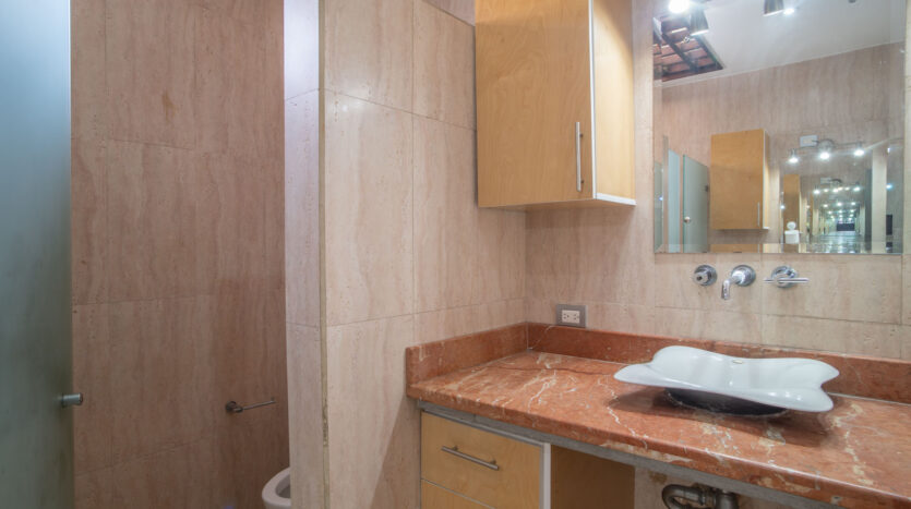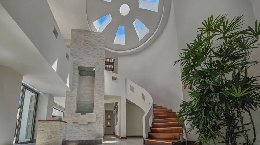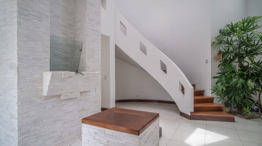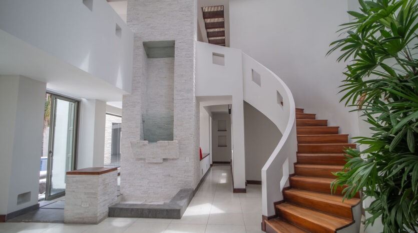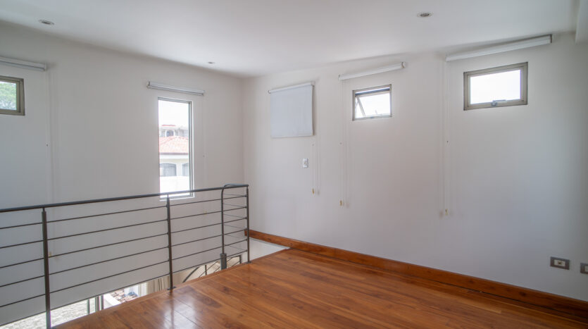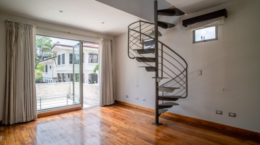 Una de esas habitaciones tiene unas gradas en espiral que llevan a un mezanine en tercer piso