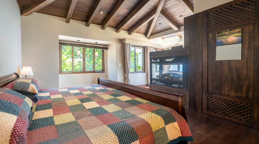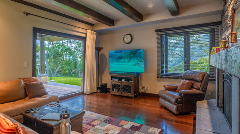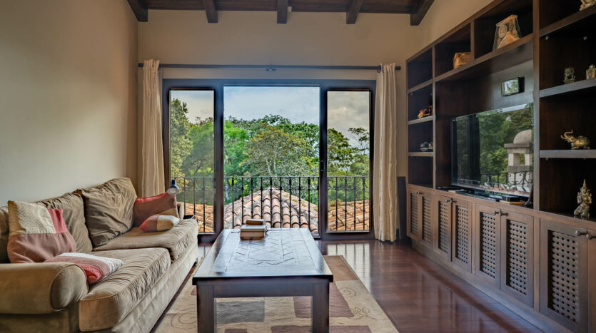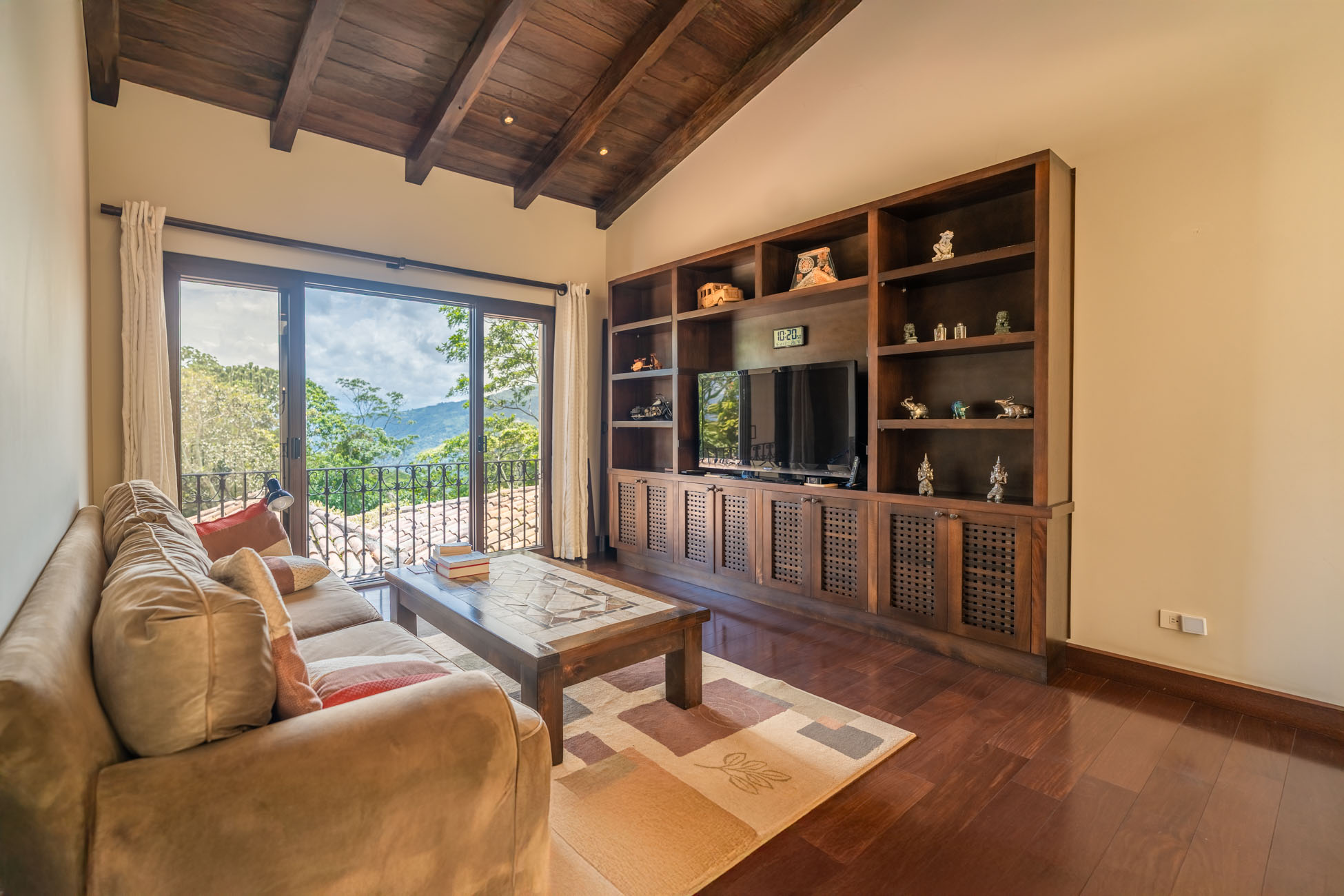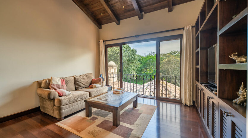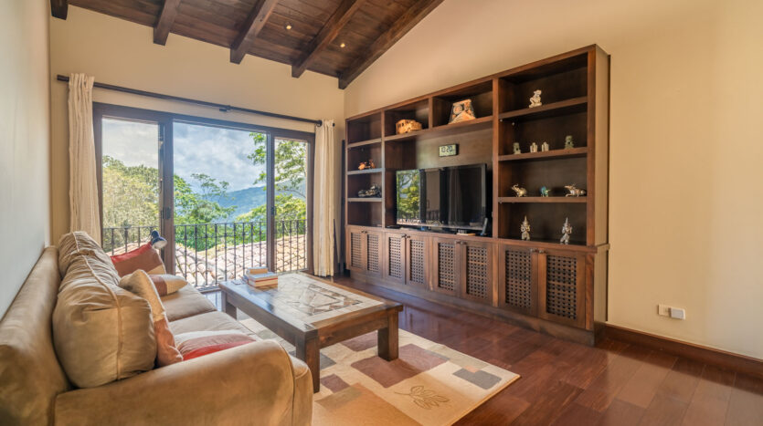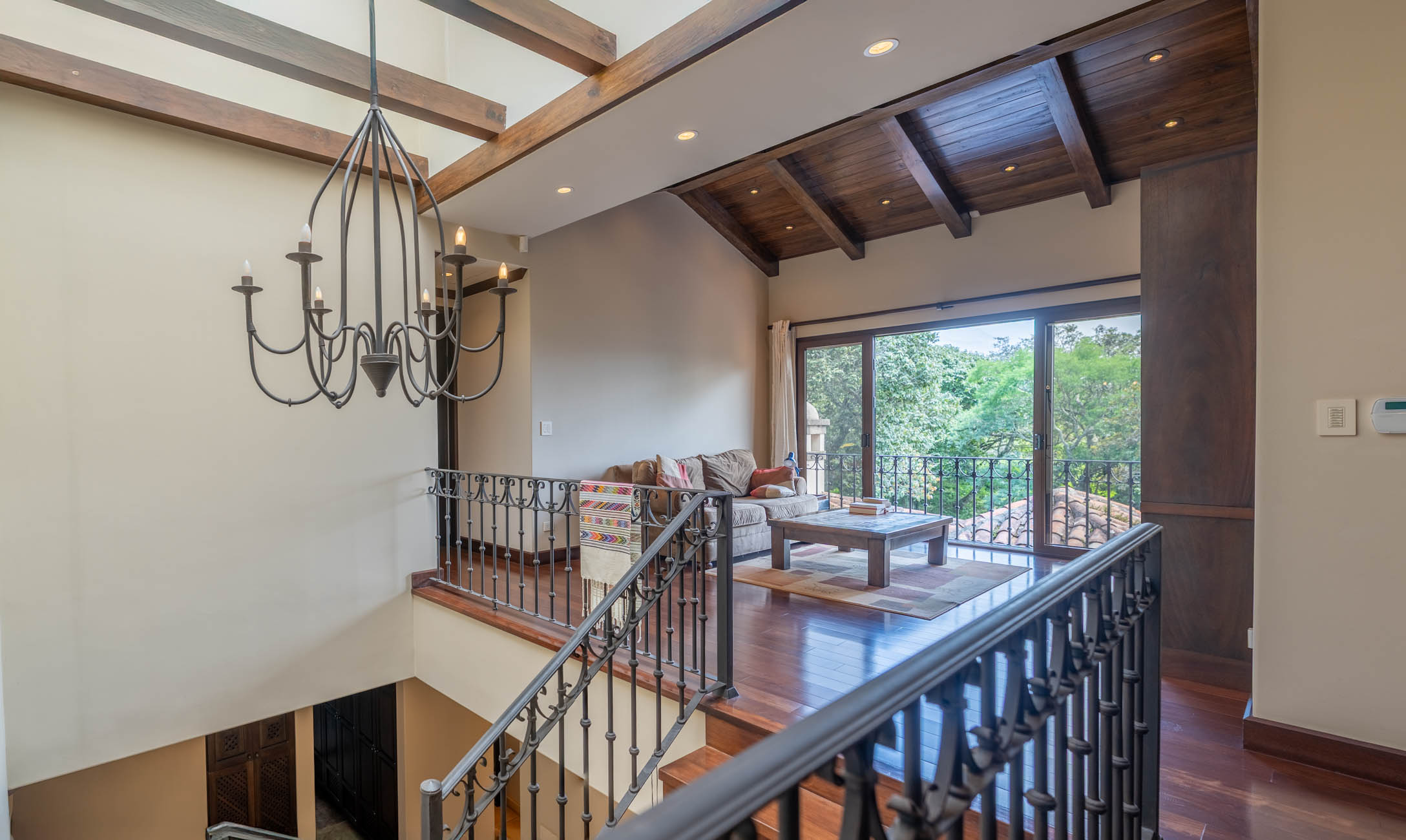 Sala de TV en segundo nivel con tragaluz y techos en madera.