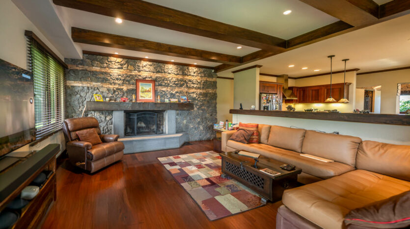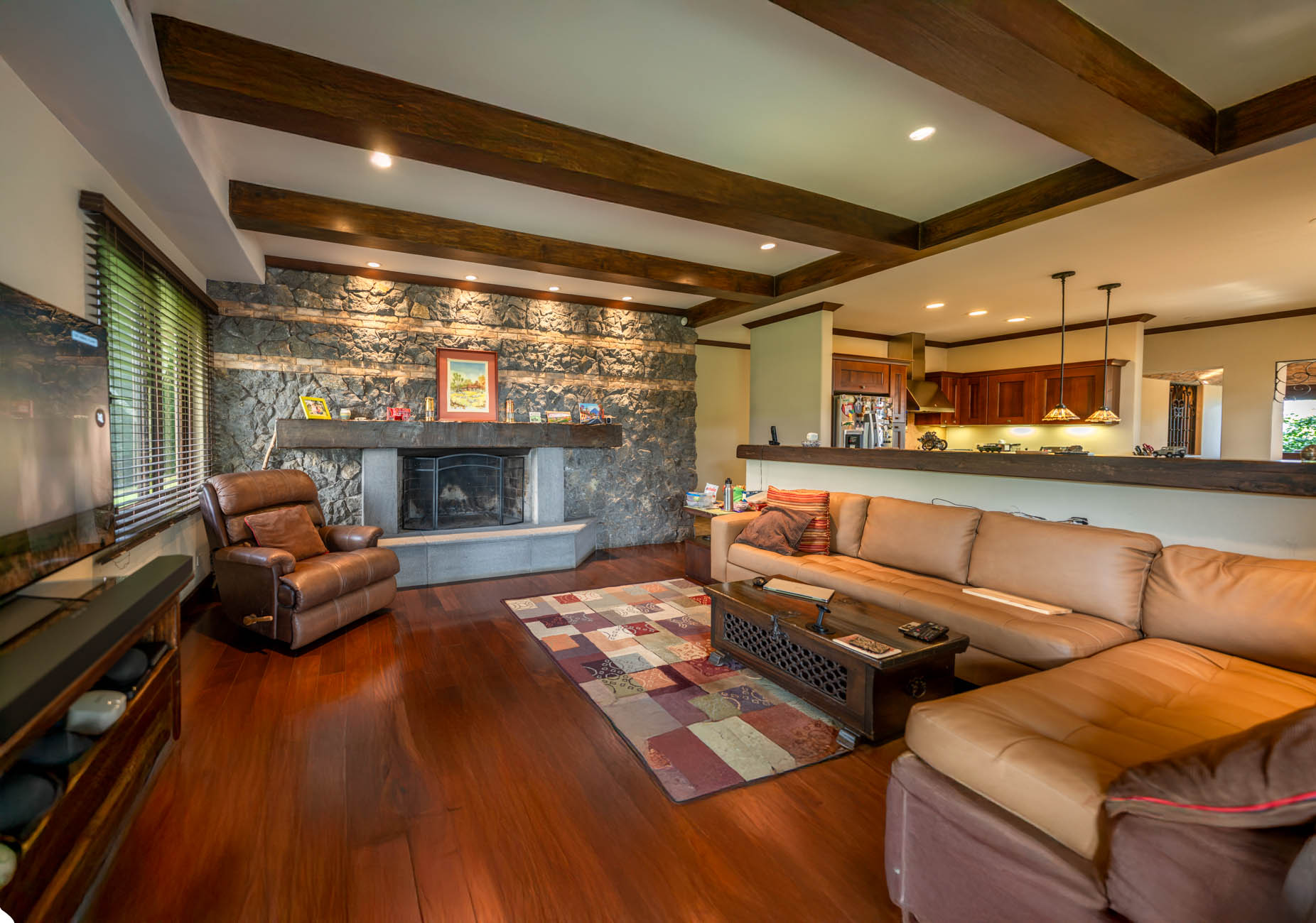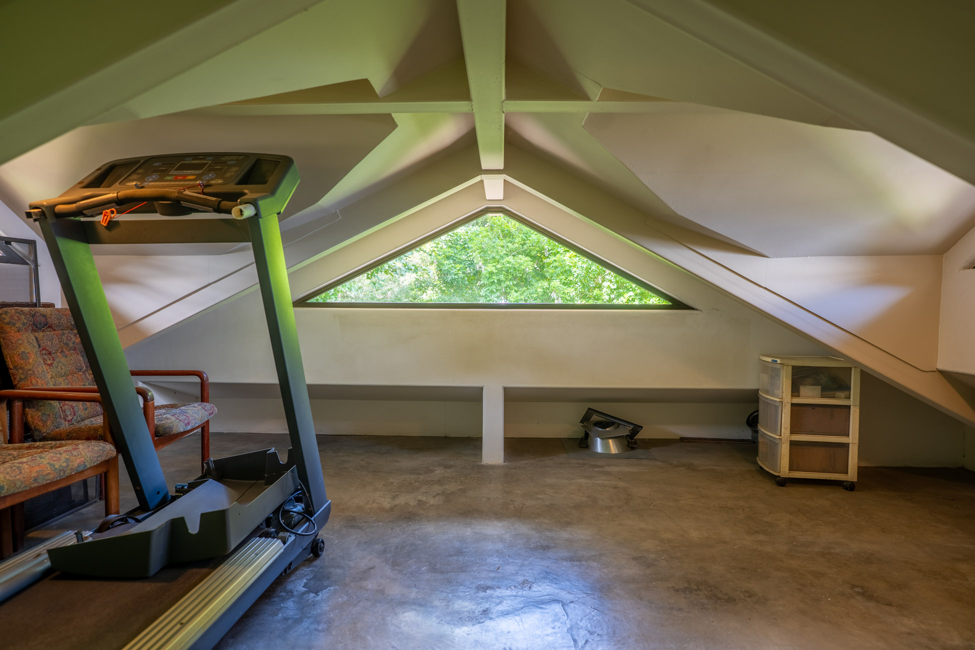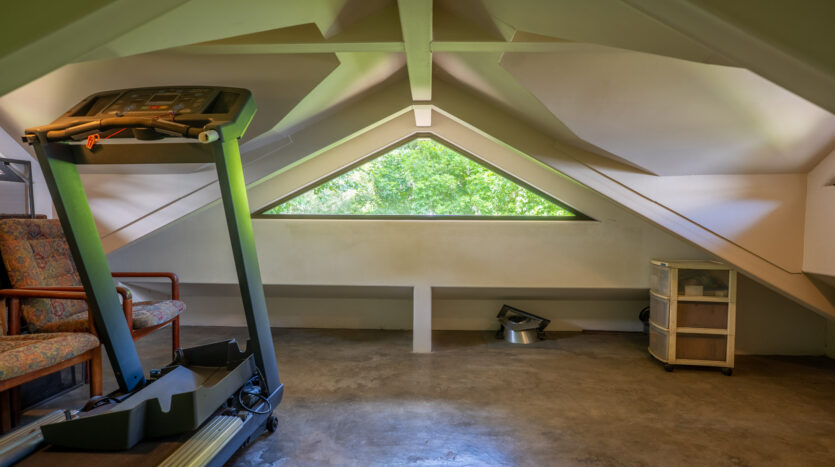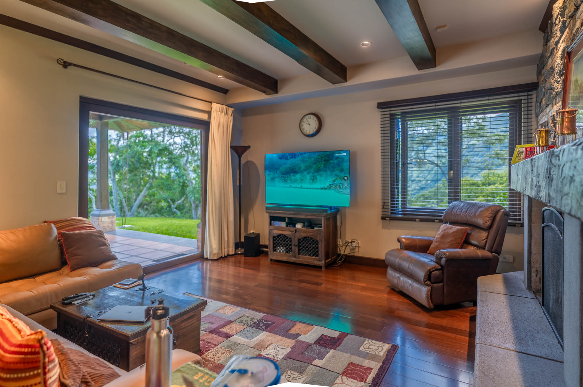 Sala de TV en segundo nivel con tragaluz y techos en madera.