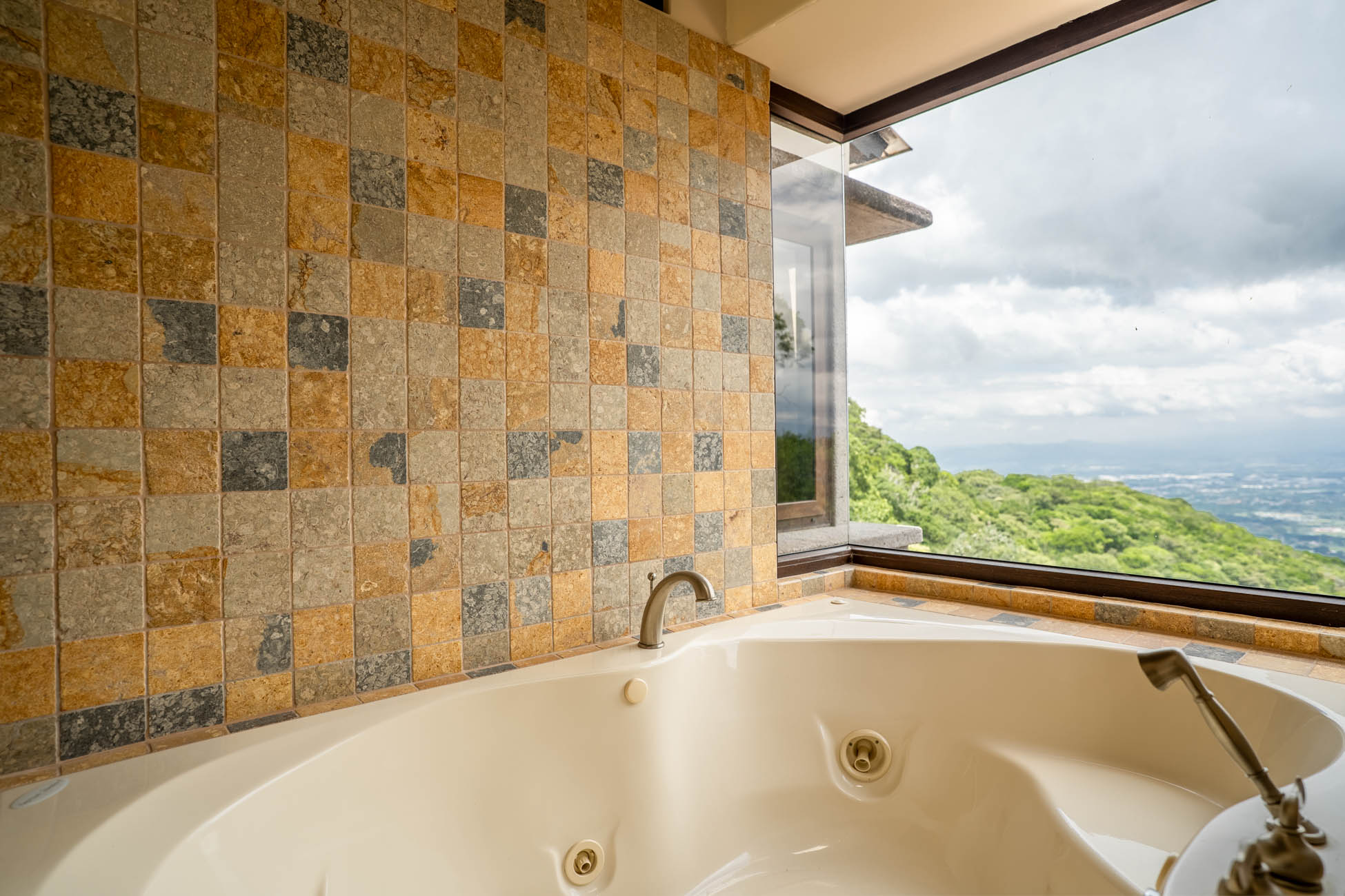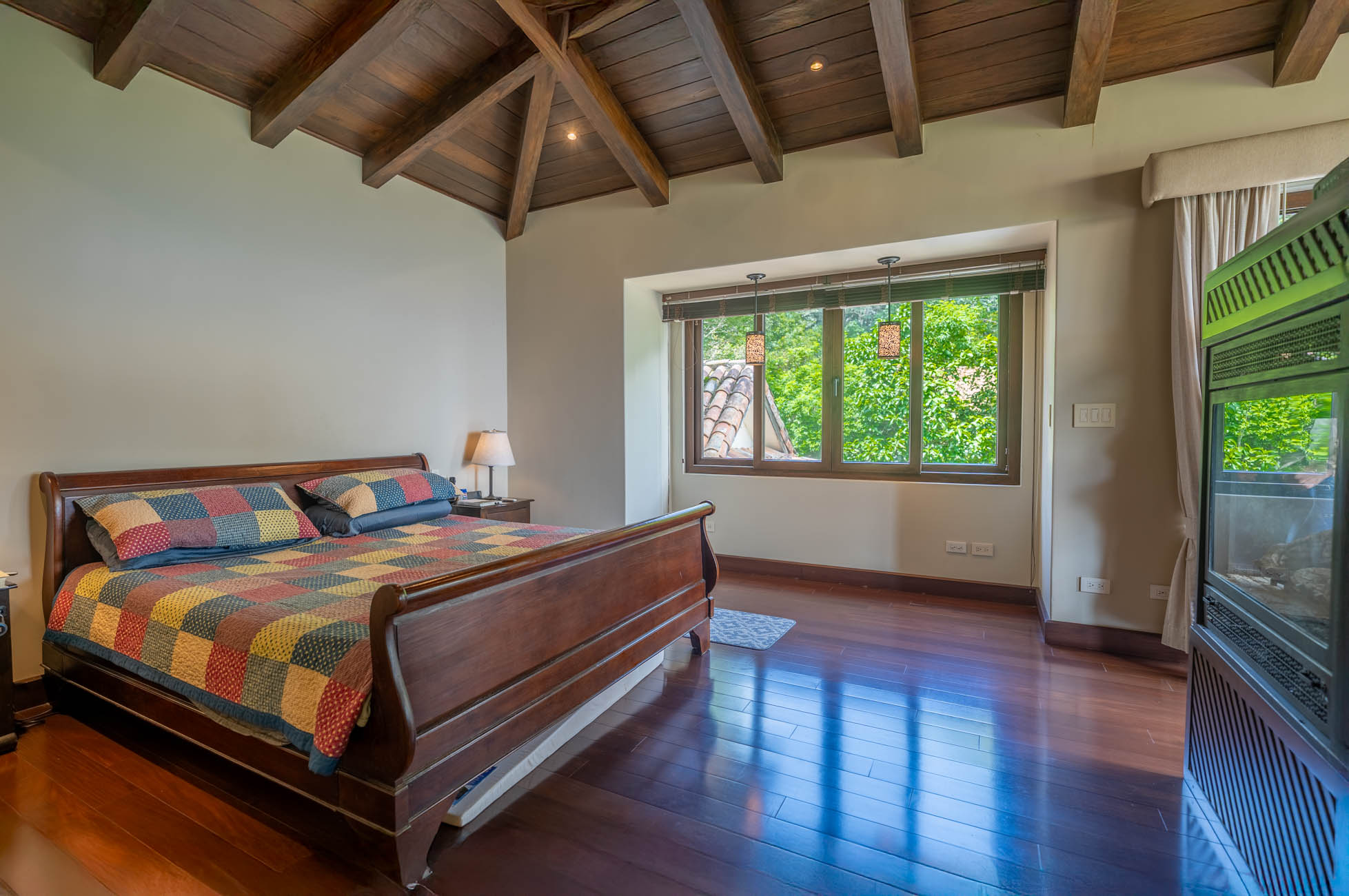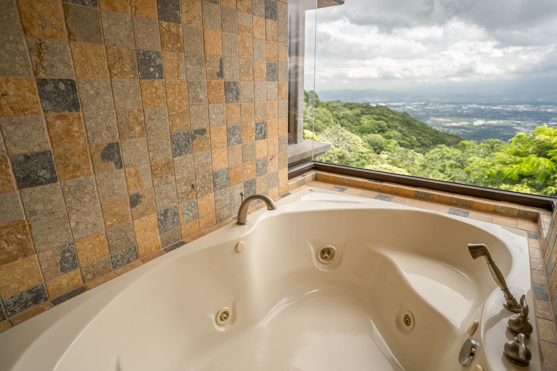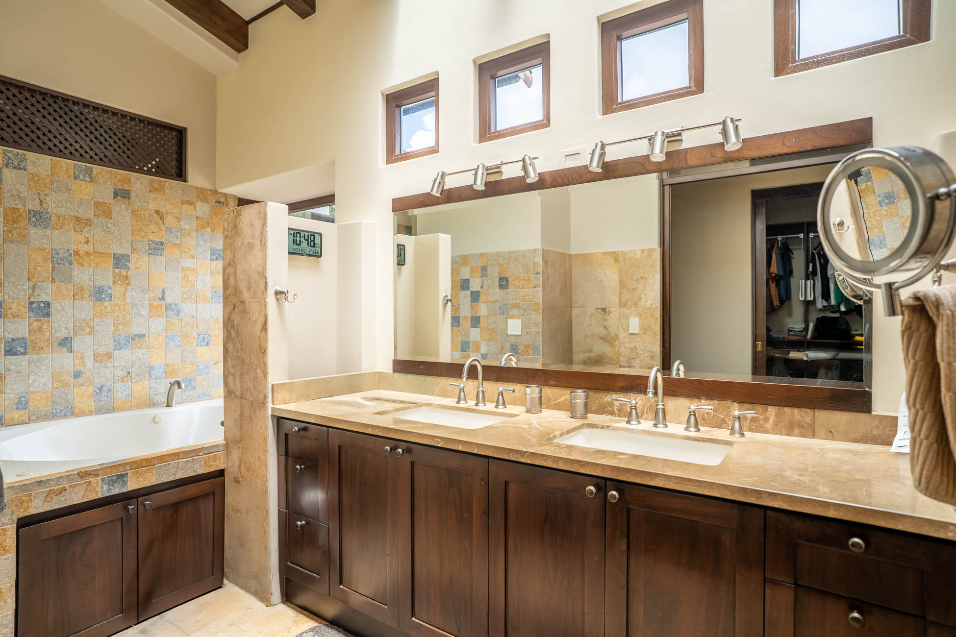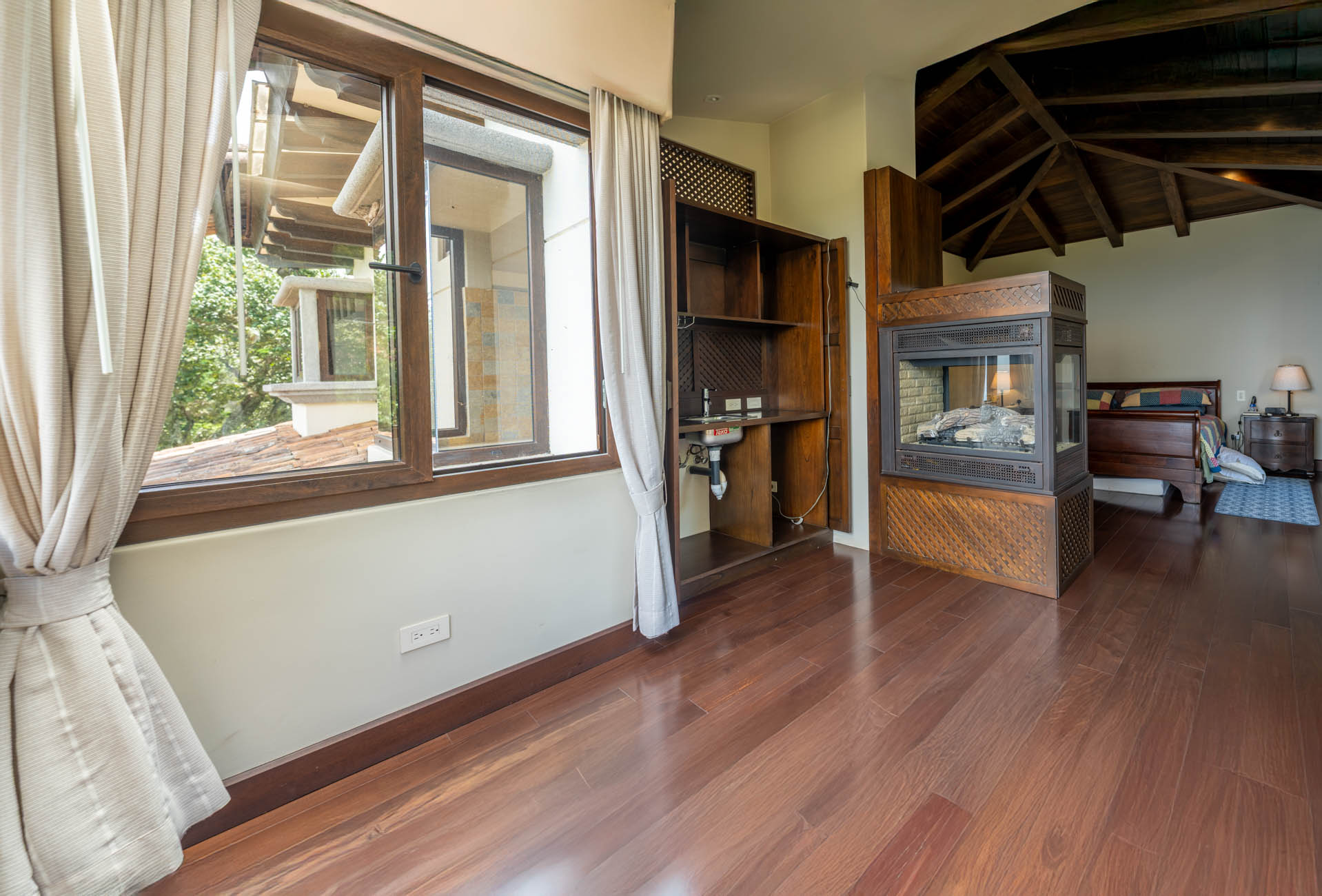 Master suite con pisos en madera, walk-in closet, área de lectura y baño en mármol con jacuzzi, ducha independiente y detalles de lujo como desempañador de espejo y calentador de paños.