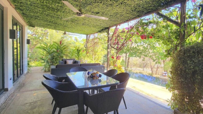 Ambas casas vienen completamente amuebladas con muebles de diseño y una gran cantidad de utensilios de cocina. La propiedad también cuenta con una piscina de borde infinito, temporizador para la bomba, luces de discoteca en la piscina con control remoto y árboles de sombra maduros. La piscina está rodeada de macetas decorativas de cerámica y plantas tropicales, lo que la convierte en un lugar perfecto para relajarse y disfrutar del impresionante entorno.
