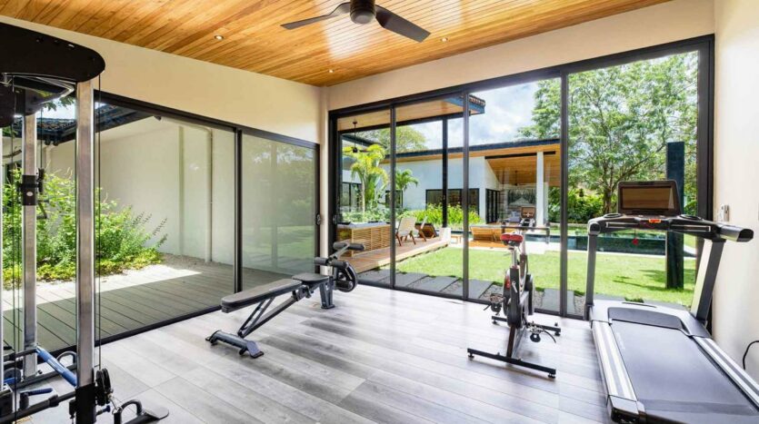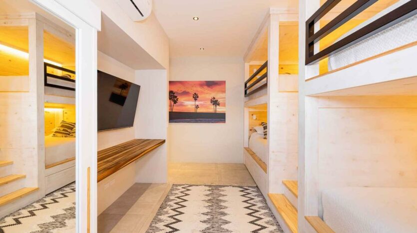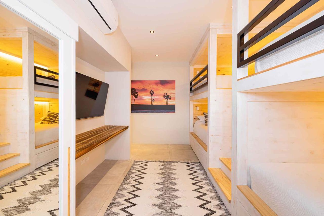 Cuenta con cuatro habitaciones espaciosas y cinco baños, incluyendo una habitación infantil con literas de madera local hechas a mano, que enamoran por su autenticidad. Además, un gimnasio completamente equipado con máquinas traídas desde Estados Unidos ofrece un espacio personal de bienestar —aunque también puede transformarse en una quinta habitación si así lo deseas.