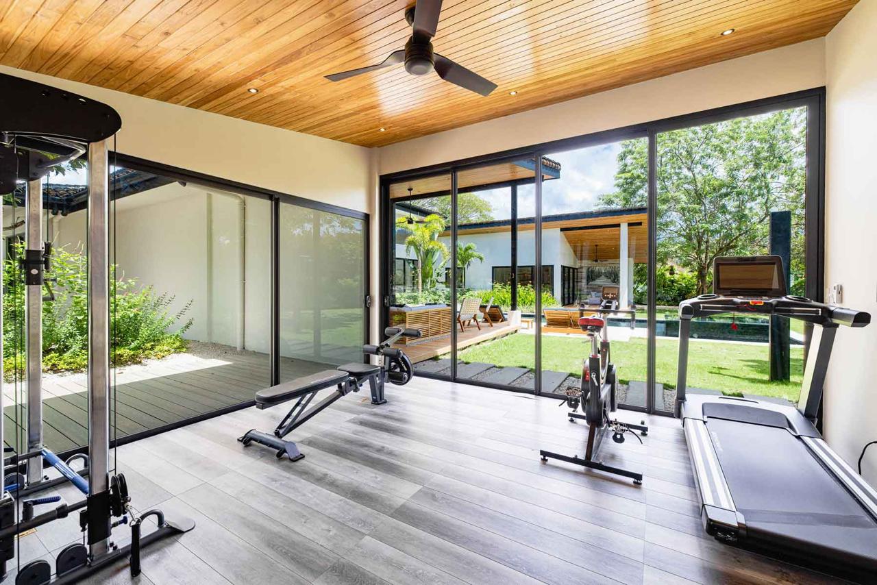 A dedicated home gym equipped with top-of-the-line U.S. machines provides a personal wellness space—or can be converted into a fifth bedroom. The property also features a two-car garage and a separate storage garage.