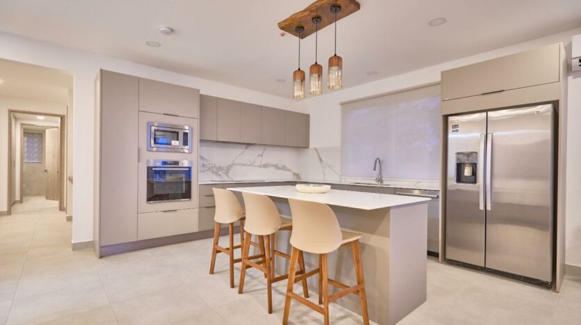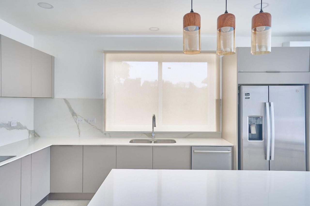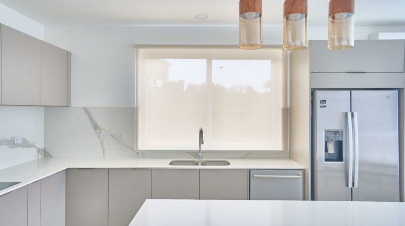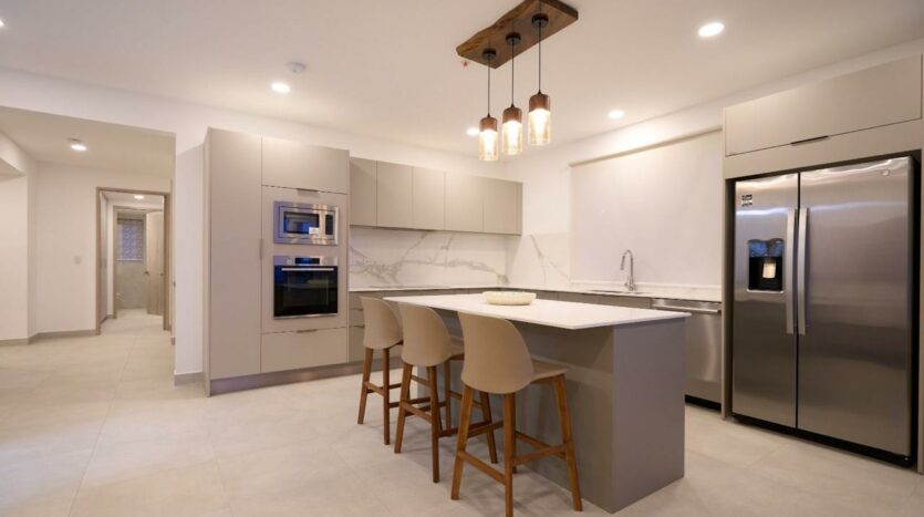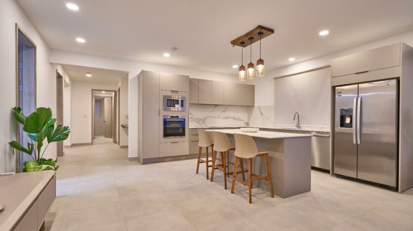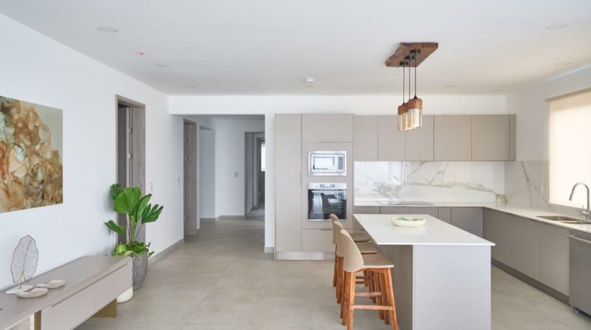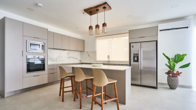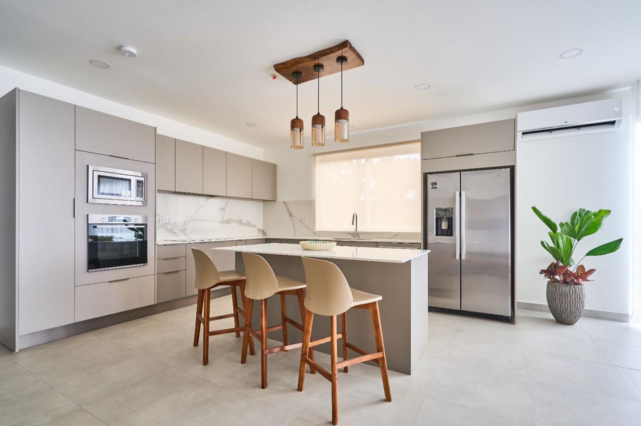 – Cocinas con superficies de cuarzo blanco, electrodomésticos empotrados y acabados en madera.