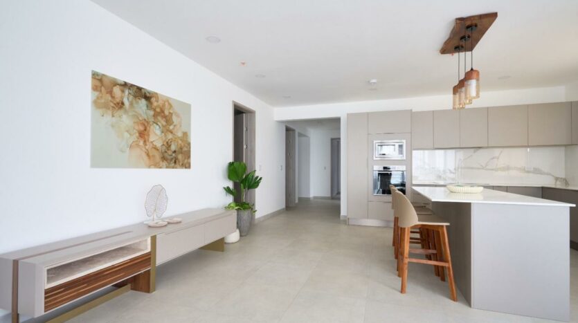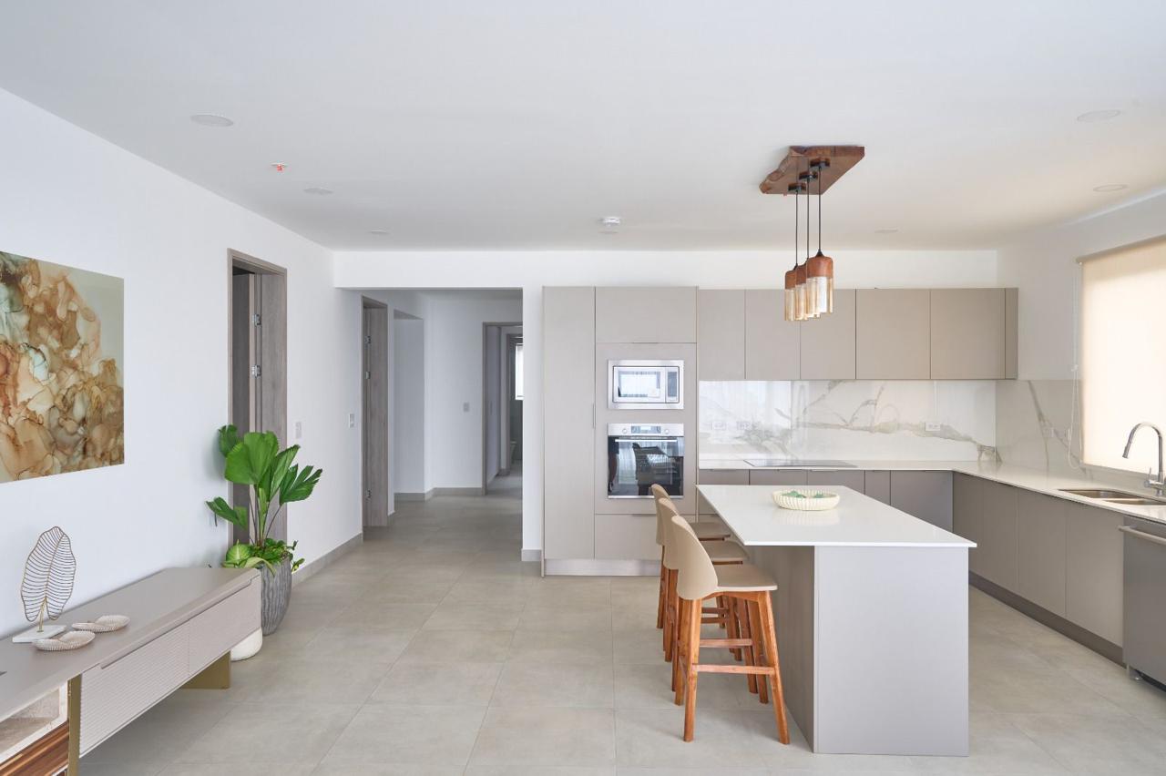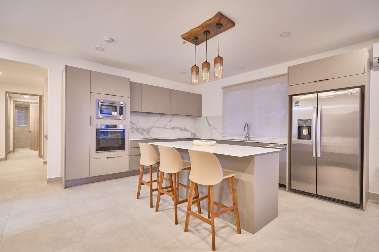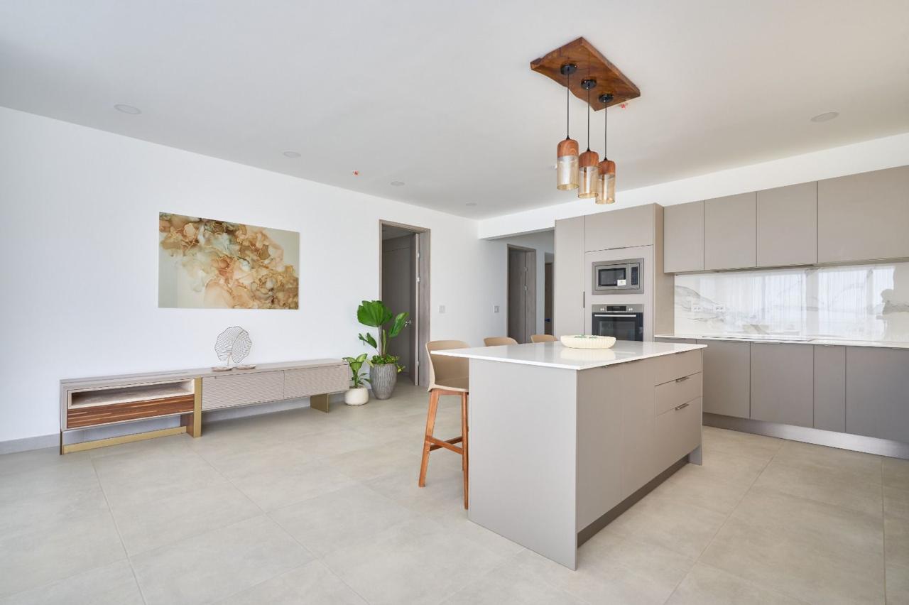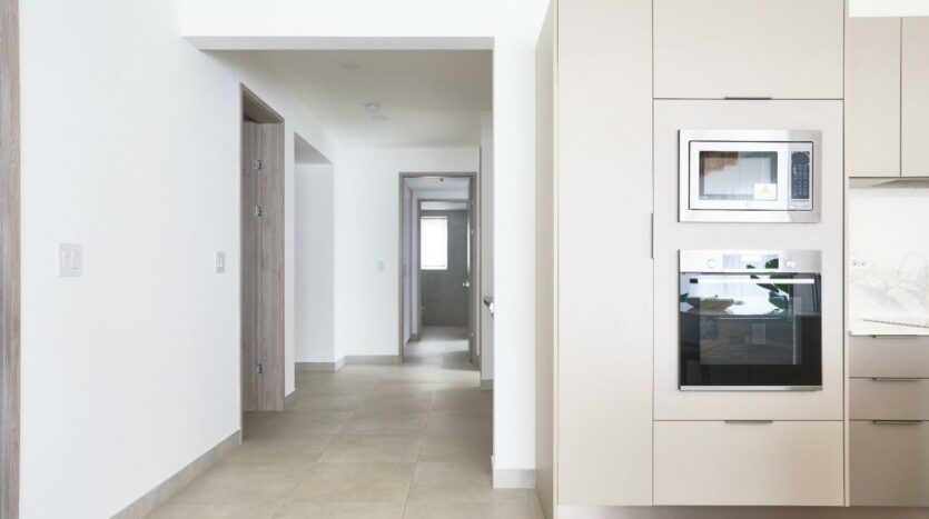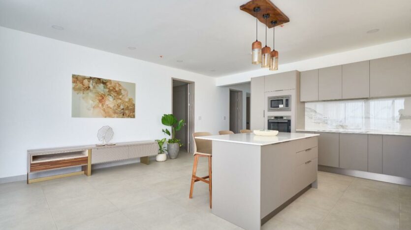 – Cocinas con superficies de cuarzo blanco, electrodomésticos empotrados y acabados en madera.