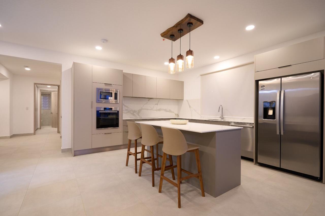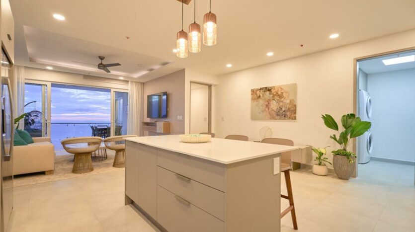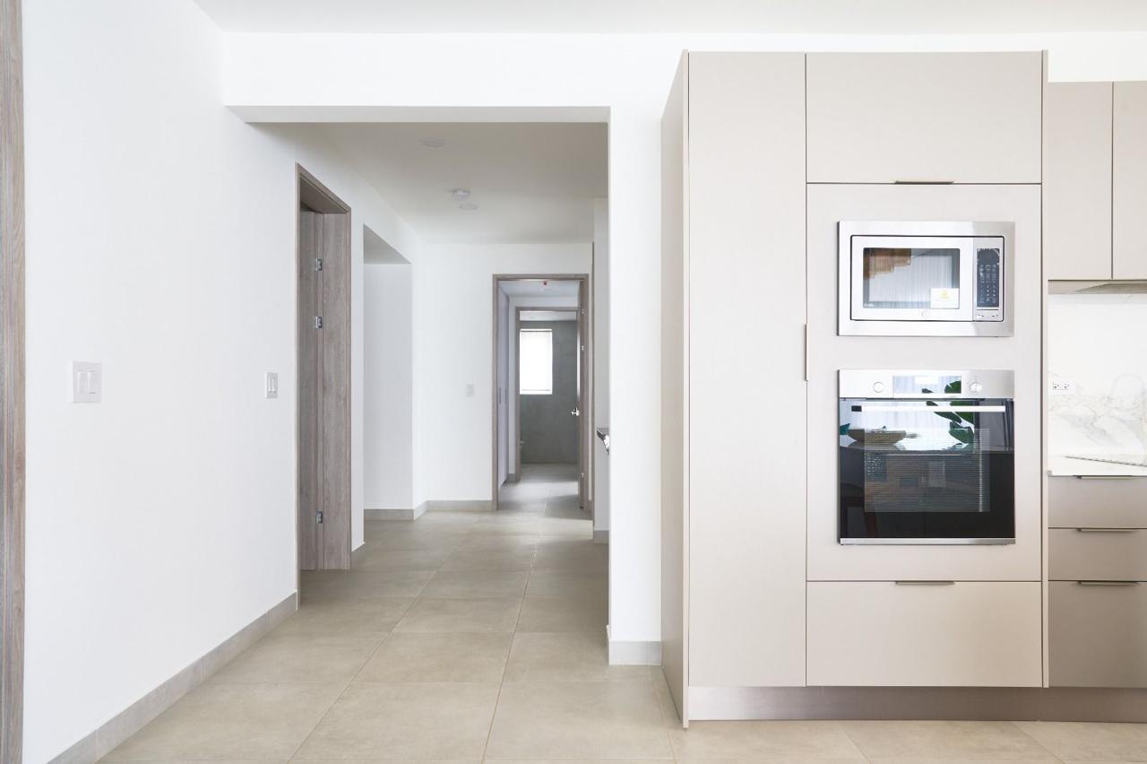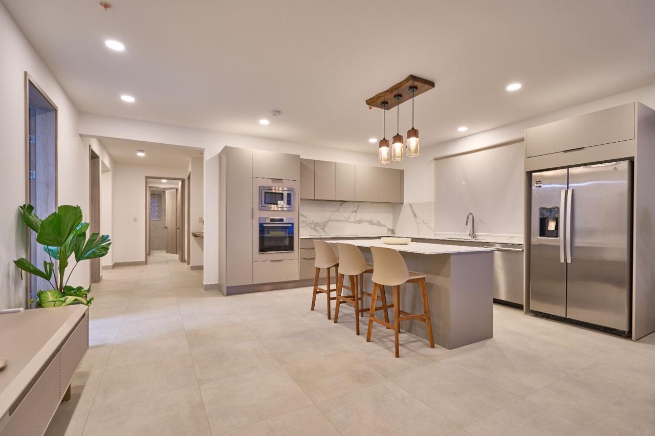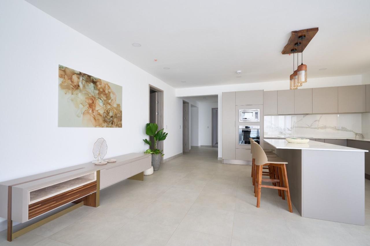 – Cocinas con superficies de cuarzo blanco, electrodomésticos empotrados y acabados en madera.
