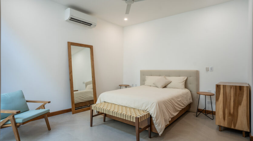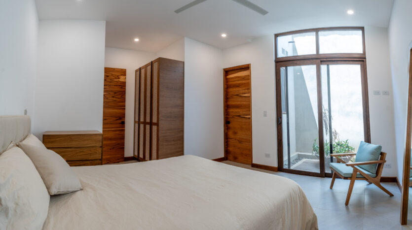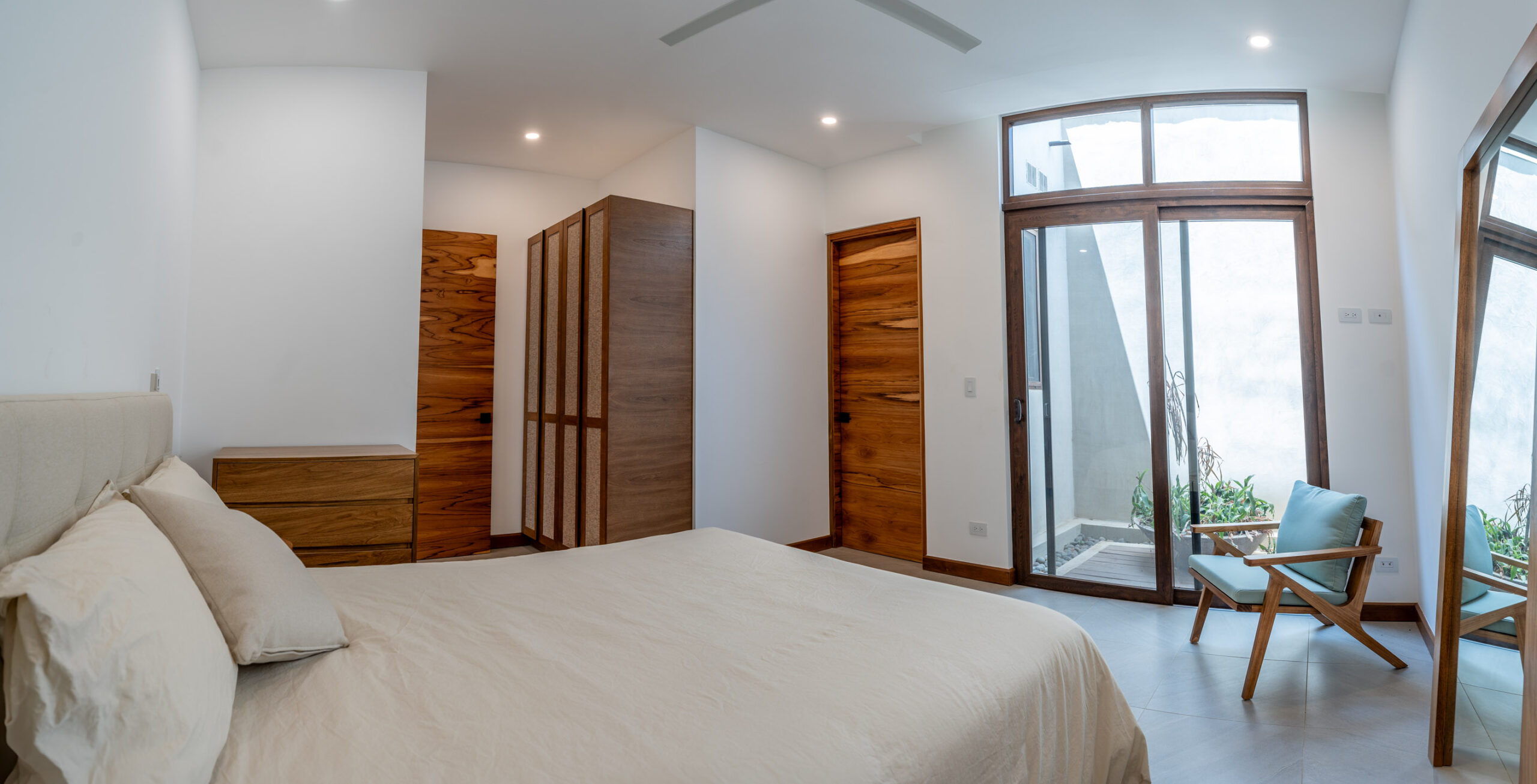 - Un dormitorio destaca por su jardín interior, ideal para sesiones de yoga o como un tranquilo espacio de descanso.